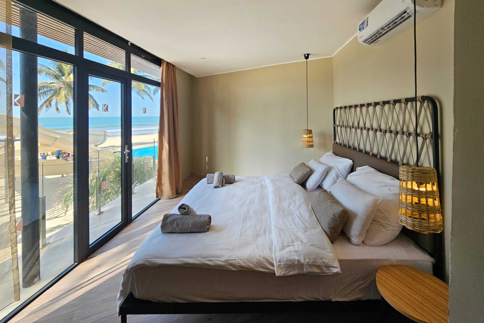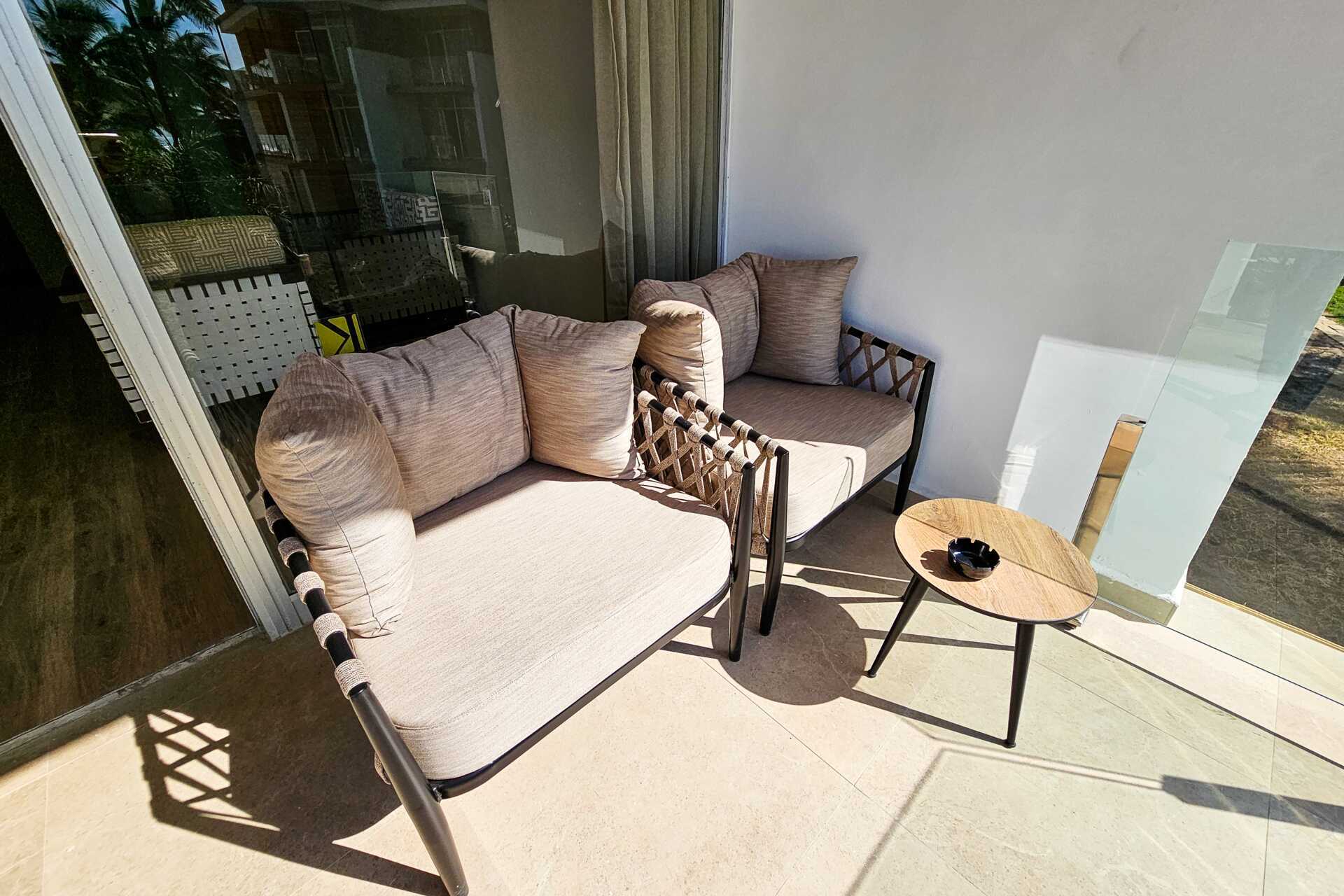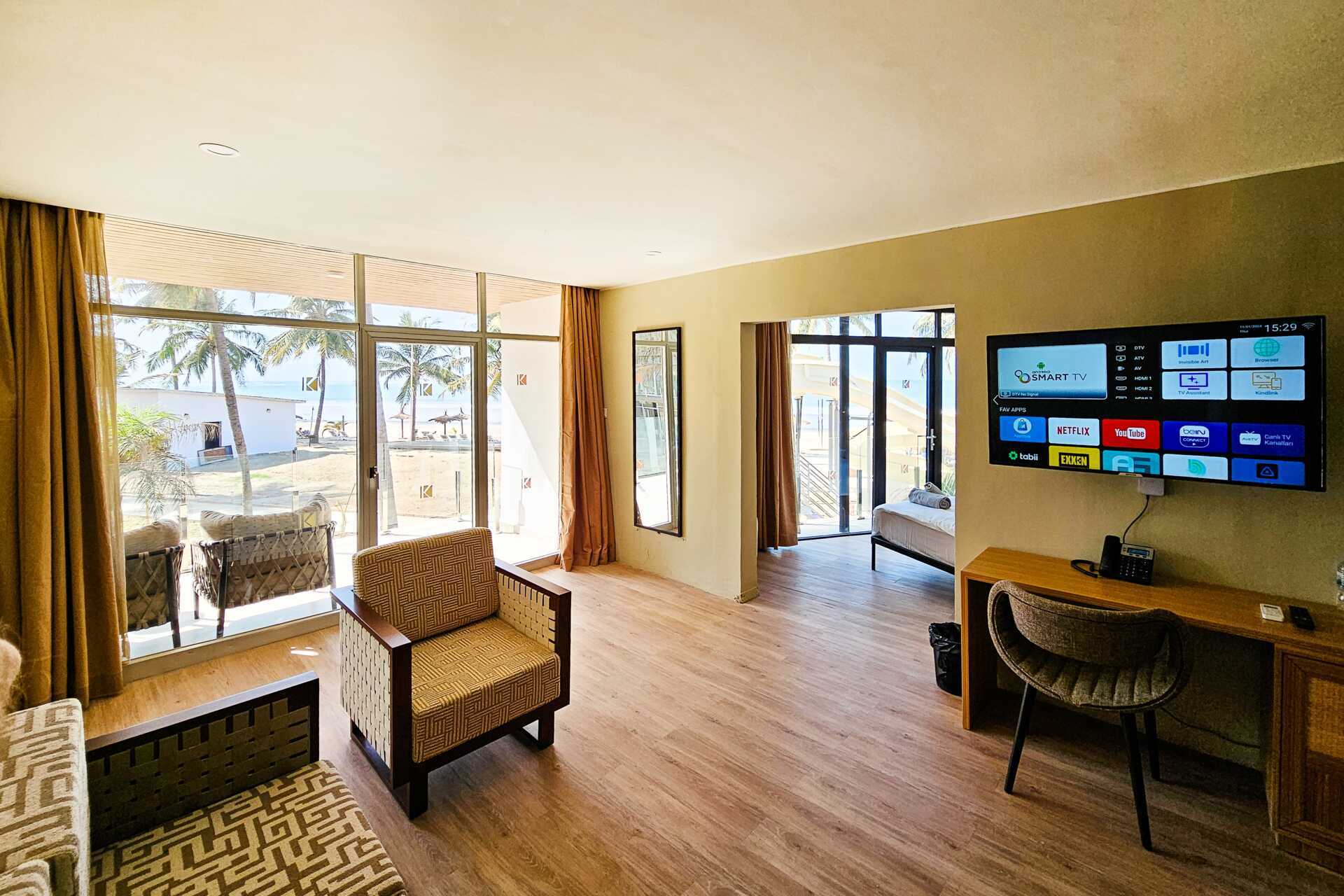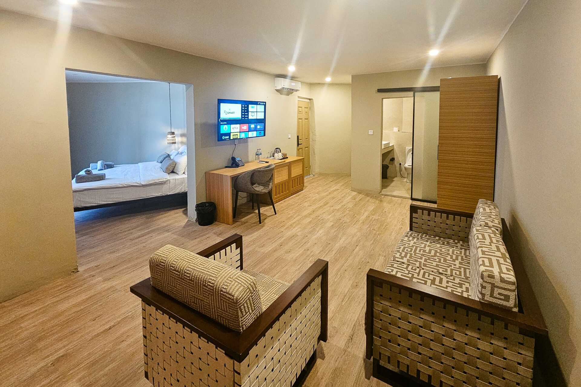 Suite med balkon og havudsigt. Suiten består af et soveværelse og et opholdsrum i åben planløsning. En dobbeltseng. Mulighed for ekstra opredning i fold ud-seng. Gratis wifi, aircondition og deponering. Køleskab. El-kedel og kaffe/te. Tv med internationale kanaler. Hårtørrer. Badeværelse med bruser og toilet. Rengøring 7 gange om ugen.