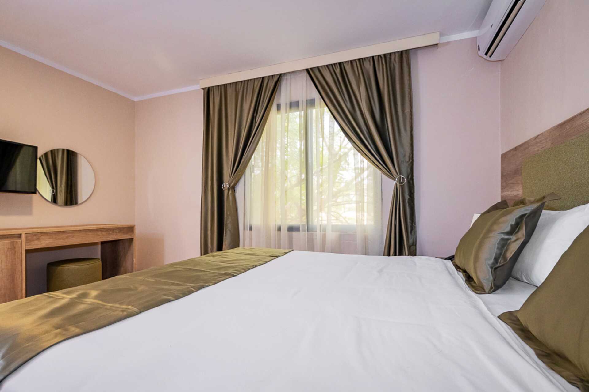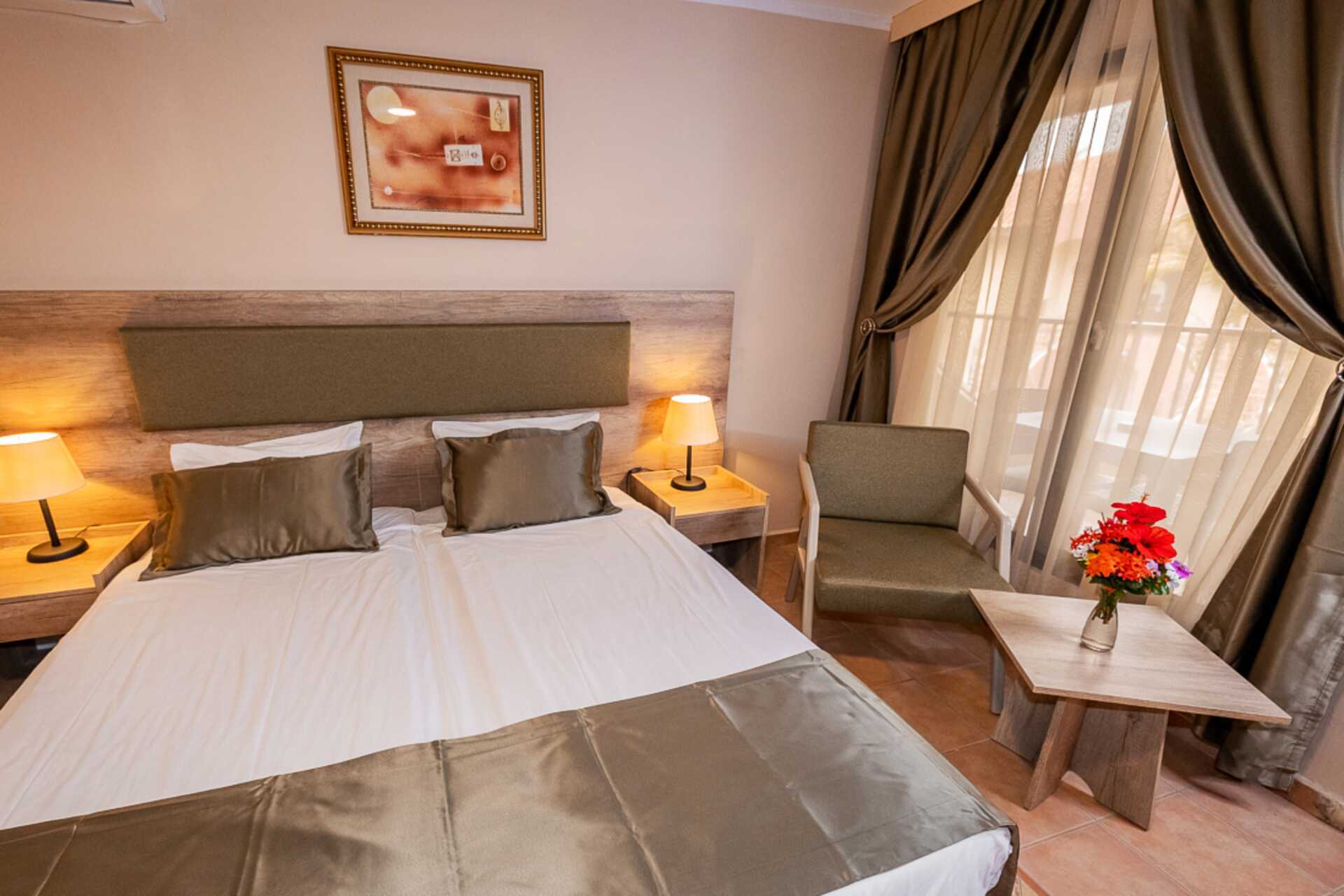 Deluxe-værelser med balkon eller terrasse. En dobbeltseng eller to enkeltsenge. Mulighed for ekstra opredning i en enkeltseng. Gratis wifi, aircondition og deponering. Køleskab. El-kedel og kaffe/te. Tv med internationale kanaler. Hårtørrer, Badeværelse med bruser og toilet. Rengøring 7 gange om ugen. Myggenet på alle vinduer.