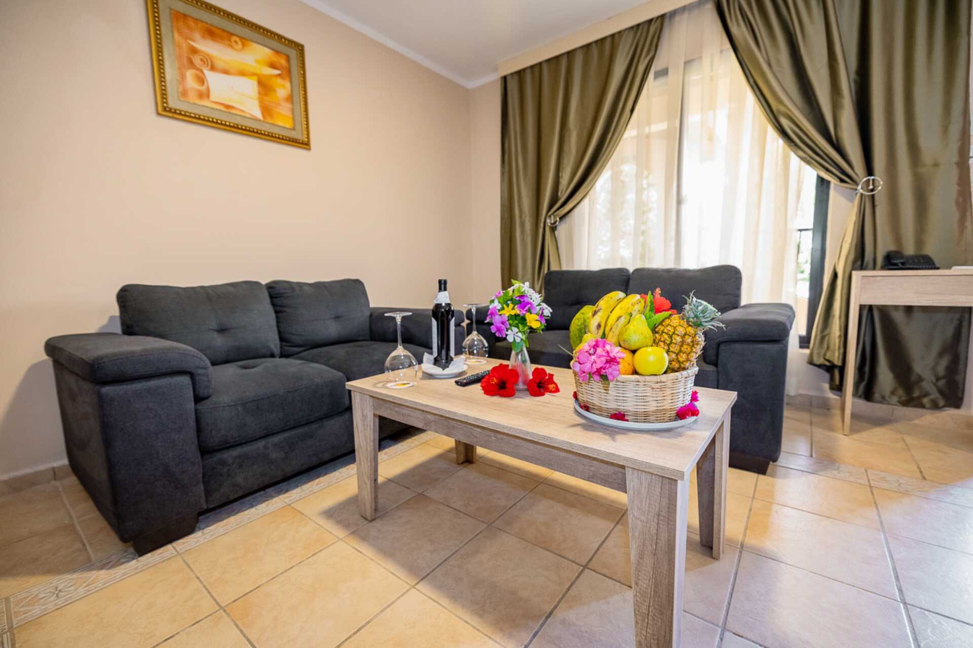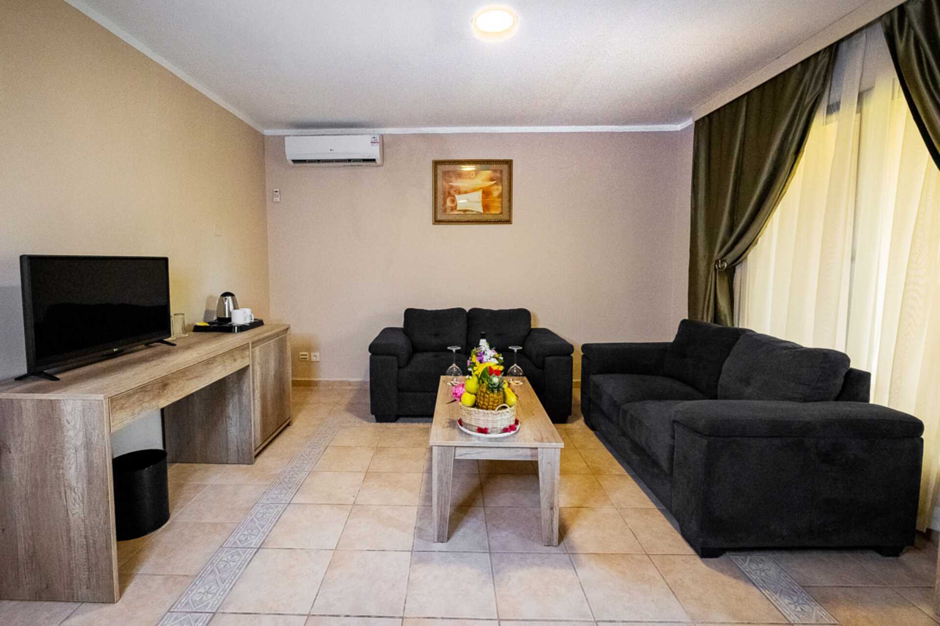 Suite med balkon eller terrasse. Suiten består af et soveværelse og en stue. En dobbeltseng. Mulighed for en ekstra seng i en enkeltseng. Gratis wifi, aircondition og deponering. Køleskab. El-kedel og kaffe og te. Tv med internationale kanaler. Badekåber og tøfler. Hårtørrer. Badeværelse med badekar, bruser og toilet. Rengøring 7 gange om ugen. Myggenet i alle vinduer.