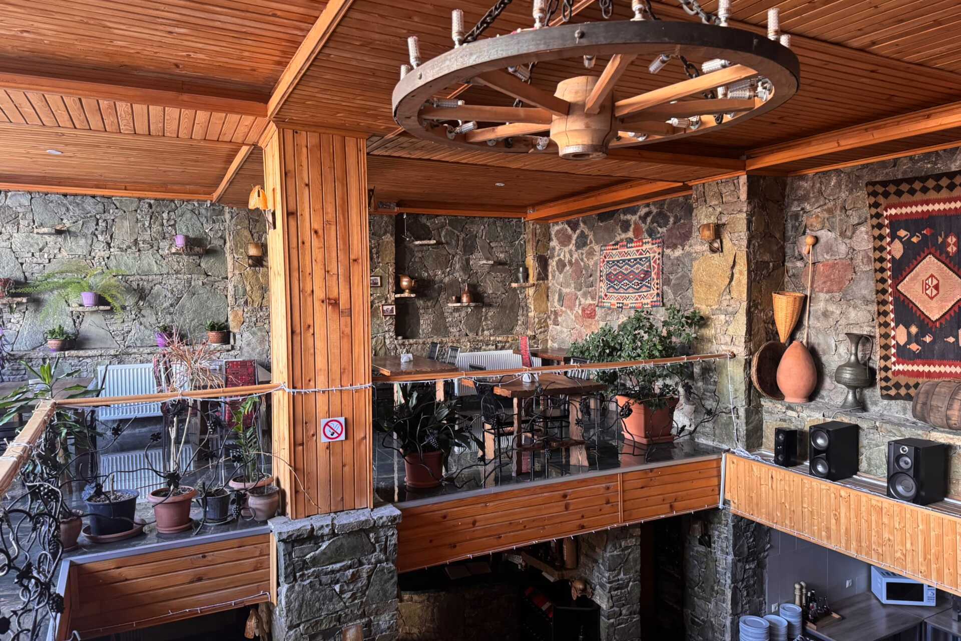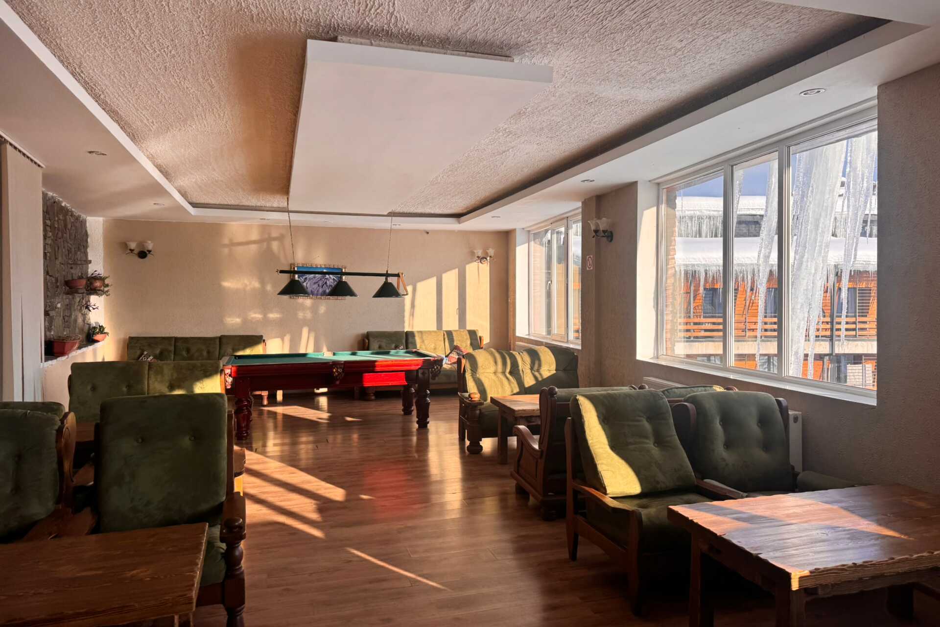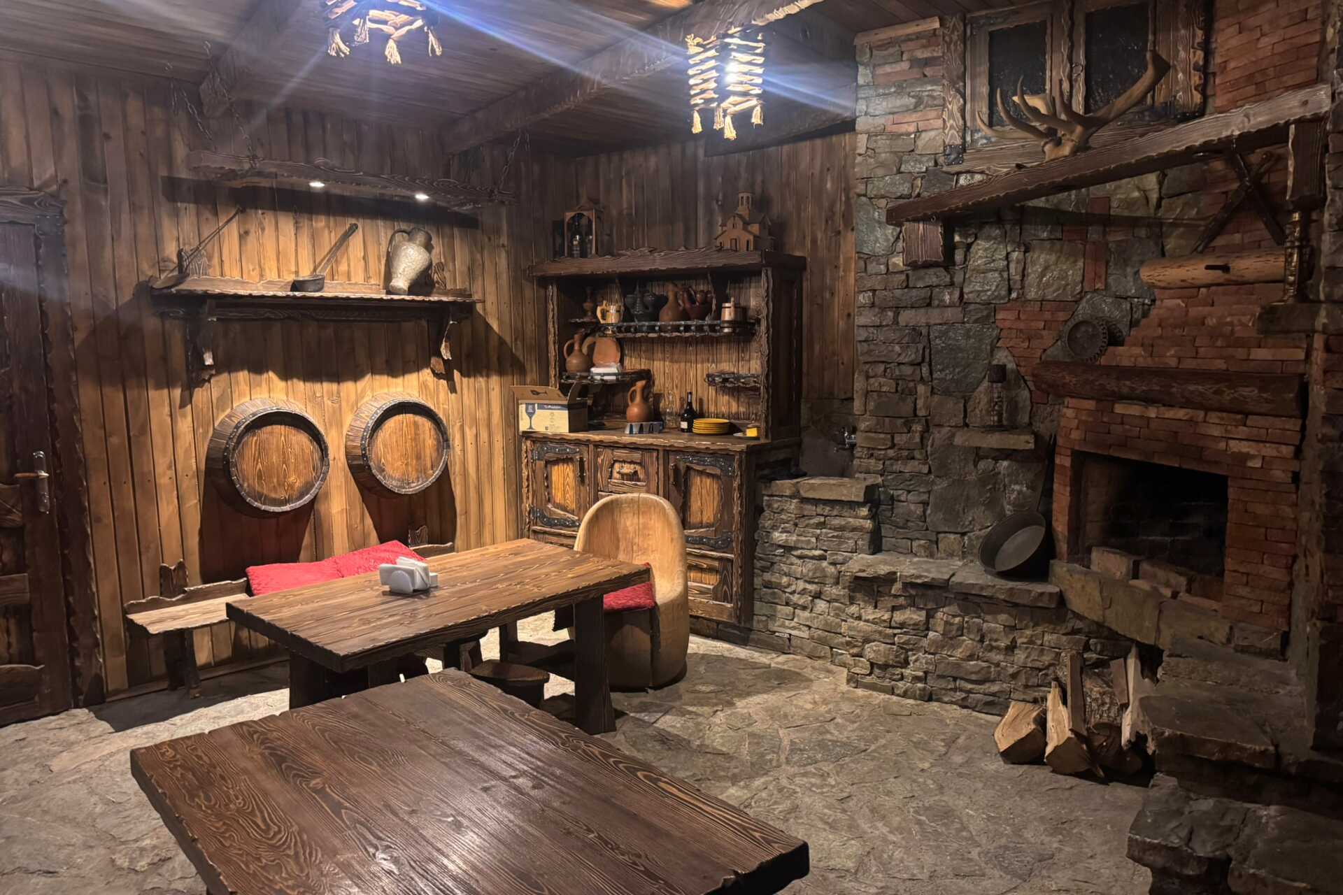 Hotellets restaurant serverer både lokale og internationale retter i rustikke omgivelser. Her kan du prøve georgiske specialiteter, hjemmelavet vin og chacha. Hvis I er en større gruppe, er der en spisesal til private middage, som kan bookes. Bar med lounge, pejs og billard – perfekt til afterskiing!