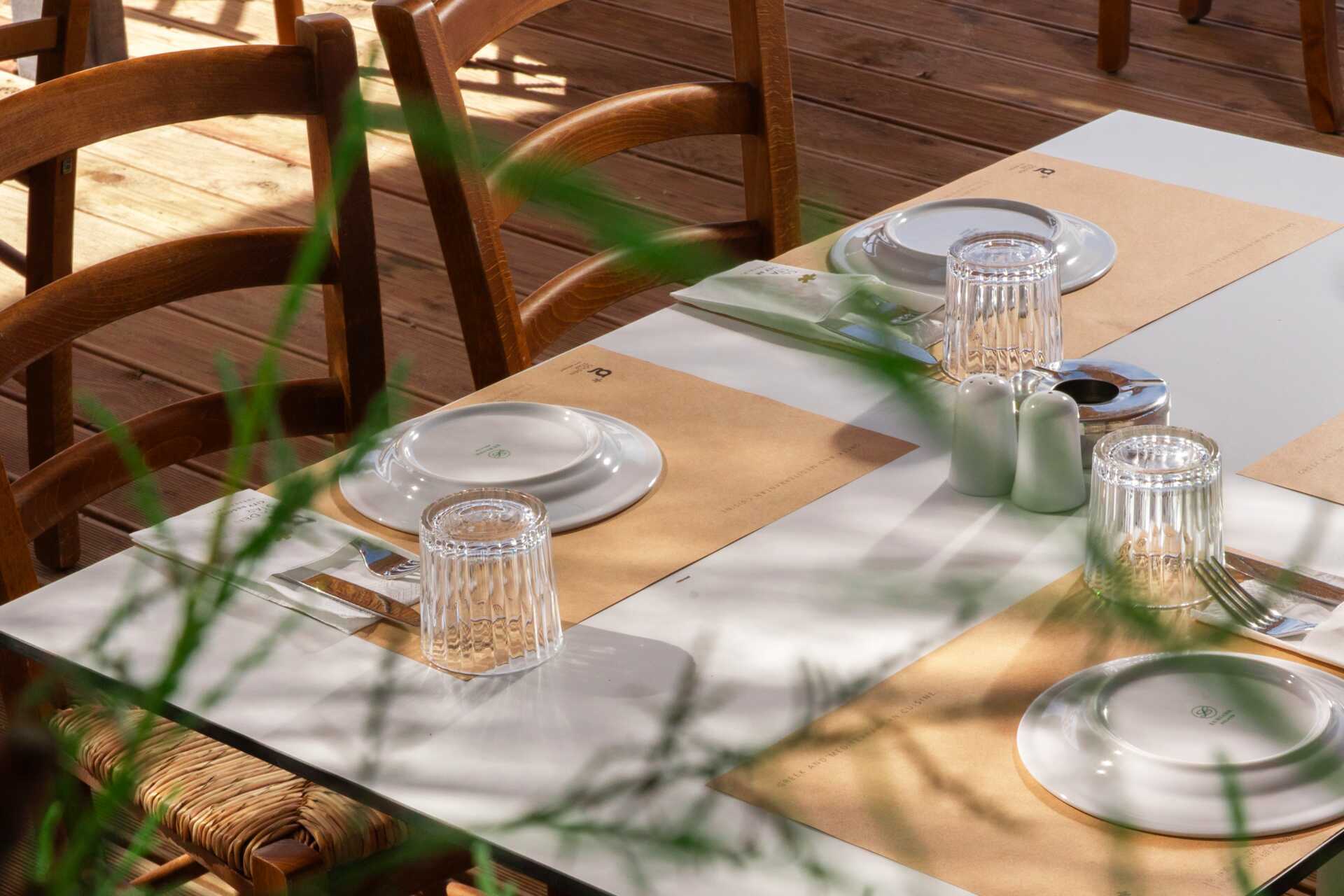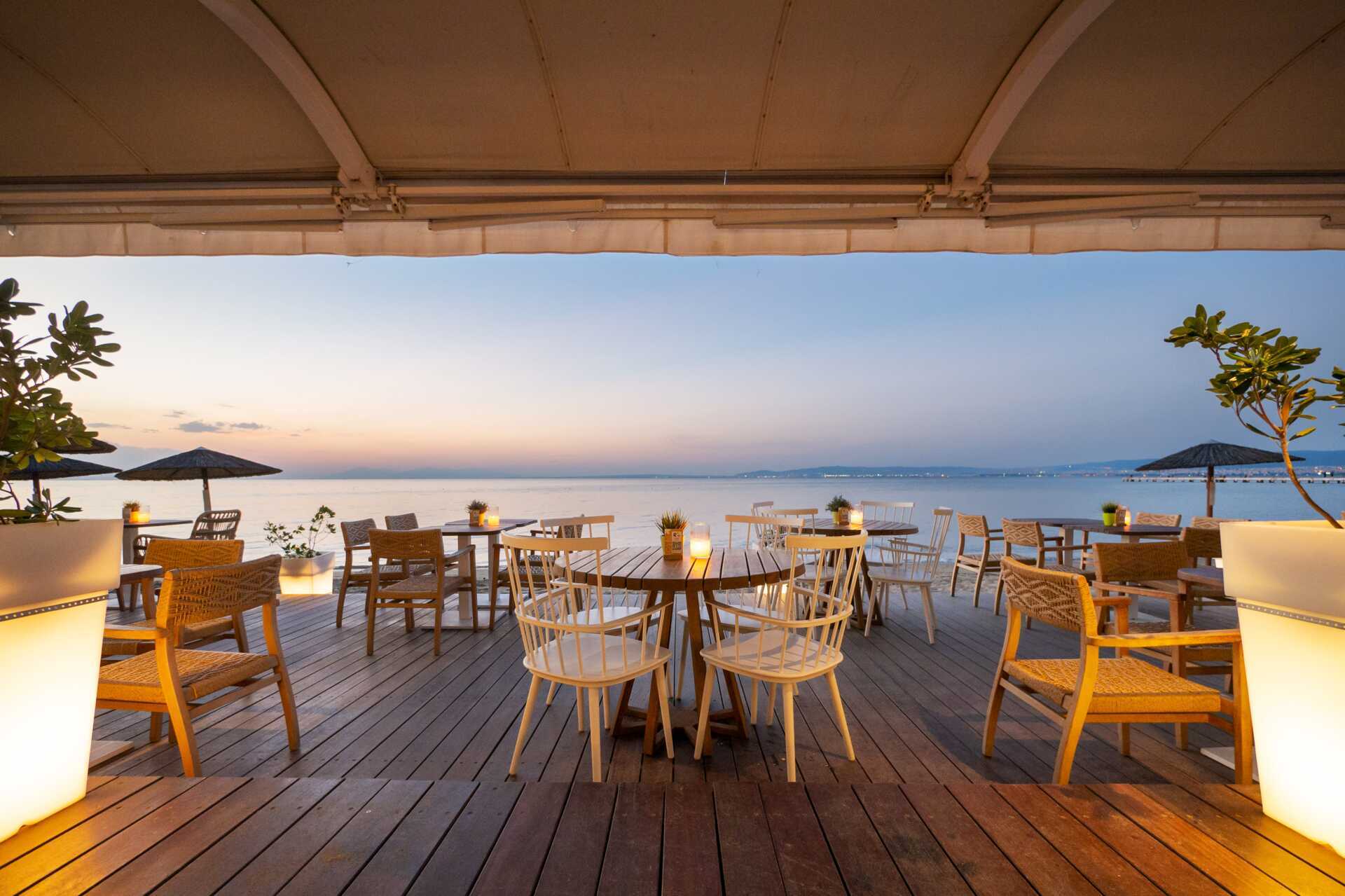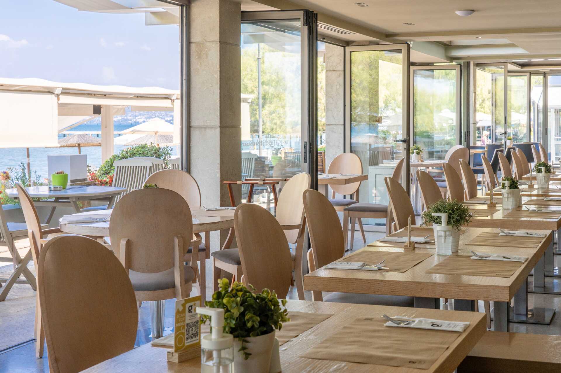 Restauranten serverer det bedste fra det græske køkken kombineret med de andre køkkener omkring Middelhavet. Her kan du nyde både en god morgenmadsbuffet, en frokost og en à la cartemiddag med tæerne i sandet og en smuk solnedgang. Hotellets morgenmad er en certificeret Greek Breakfast og byder på aromaer og smag fra økologiske og lokalt dyrkede produkter og lokale delikatesser. I baren kan man købe snacks, en god kop kaffe eller en drink akkompagneret af dejlig loungemusik.