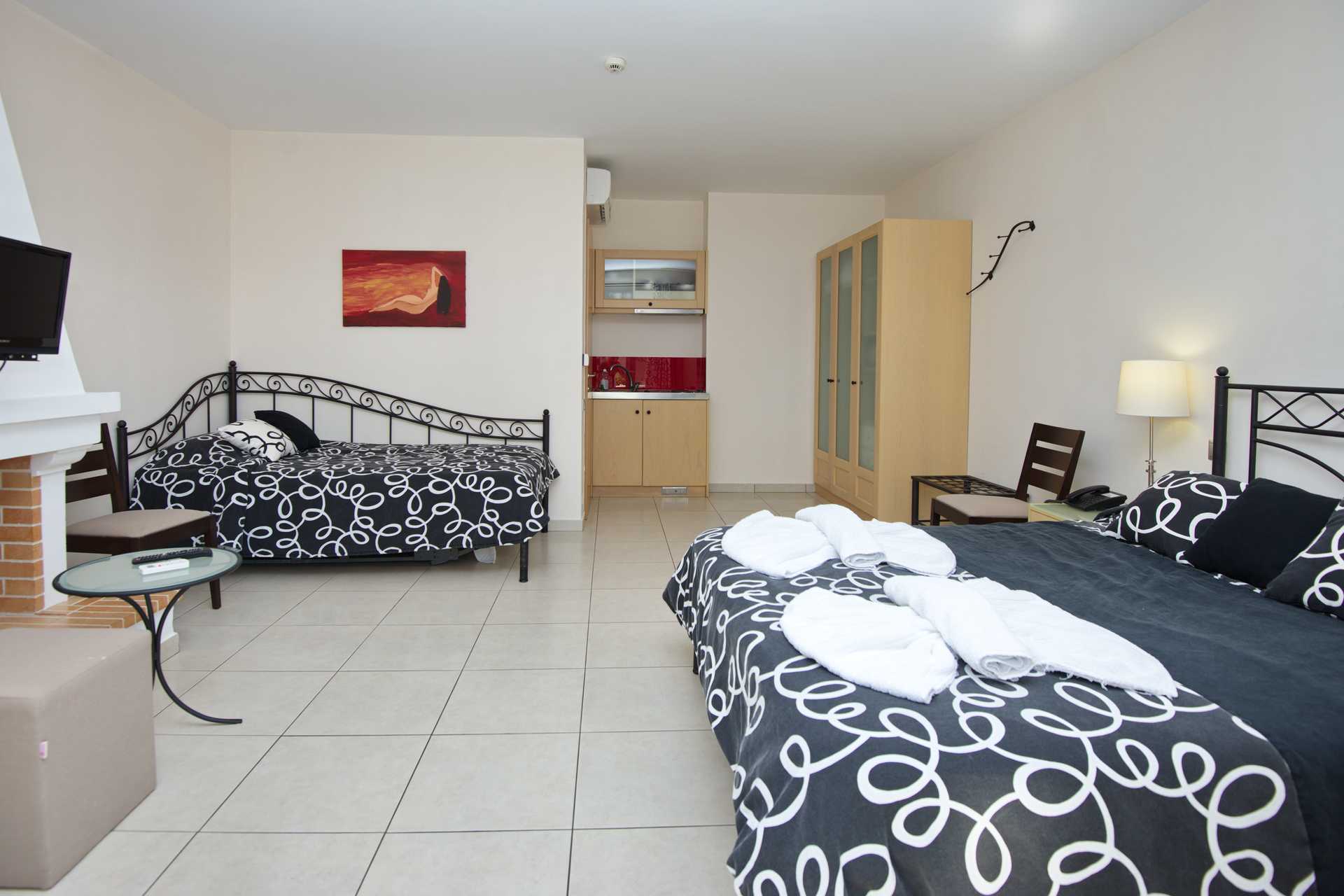 Superior-værelse med terrasse i stueplan. En dobbeltseng og en enkeltseng. Gratis wifi, aircondition og deponering. Køleskab. El-kedel. Tv med internationale kanaler. Hårtørrer. Badeværelse med badekar eller bruser samt toilet. Rengøring 7 gange om ugen.