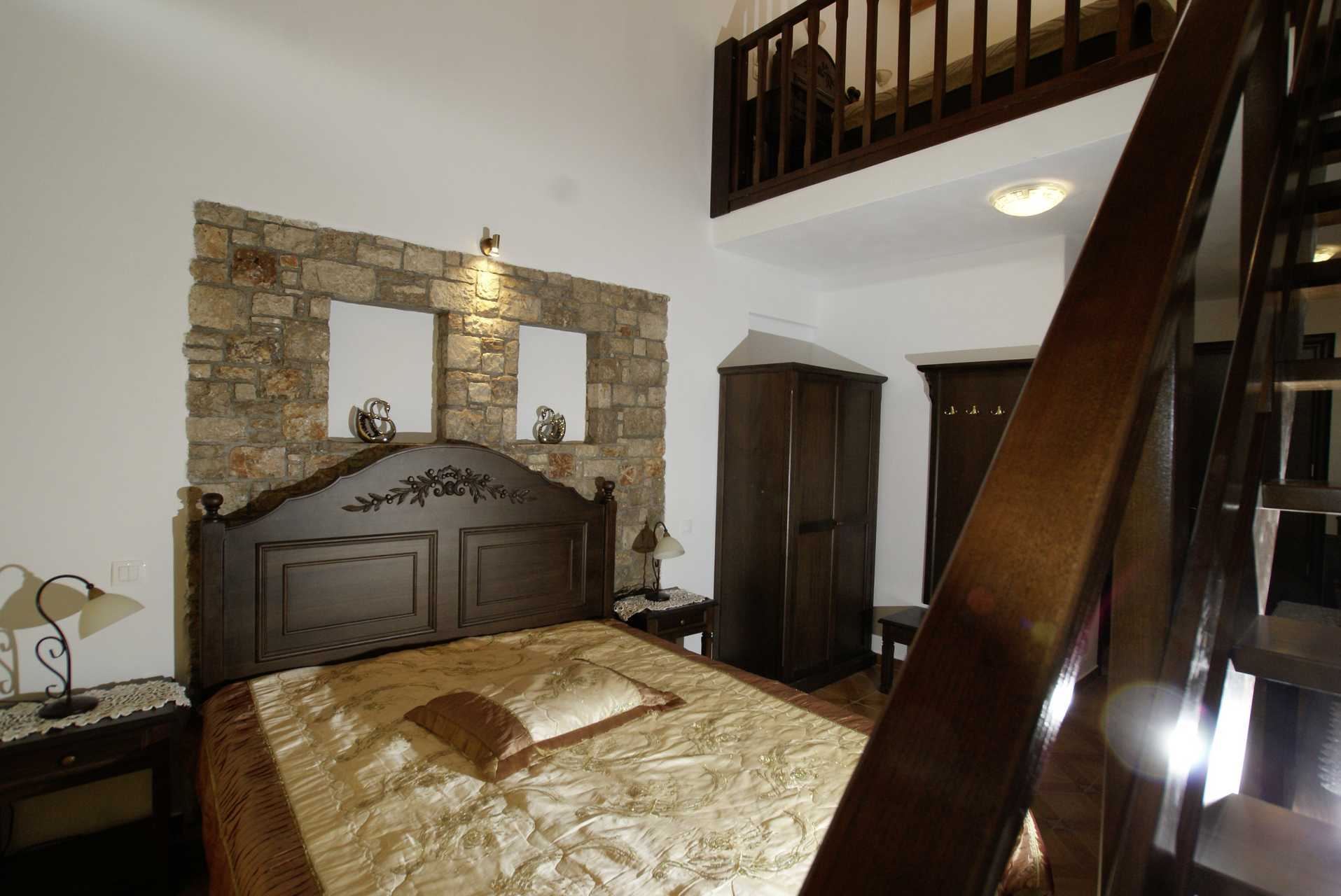 1-værelses lejlighed i etage med balkon og havudsigt. På balkonen er der borde og stole samt solstole. I stueetagen er der en dobbeltseng, et minikøkken med kogeplader, køleskab, el-kedel, kaffemaskine, enkelt køkkenudstyr og et lille bord med stole, samt et badeværelse med bruser og toilet. Ovenpå er der en hems med to enkeltsenge og et badeværelse. Delvist skrånende tag på øverste niveau. Gratis wifi og aircondition, og det samme er deponering, hvis du beder om det i receptionen. Tv med lokale kanaler. Hårtørrer. Rengøring 7 gange om ugen. Børn under to år tæller med i det maksimale antal personer på værelset.