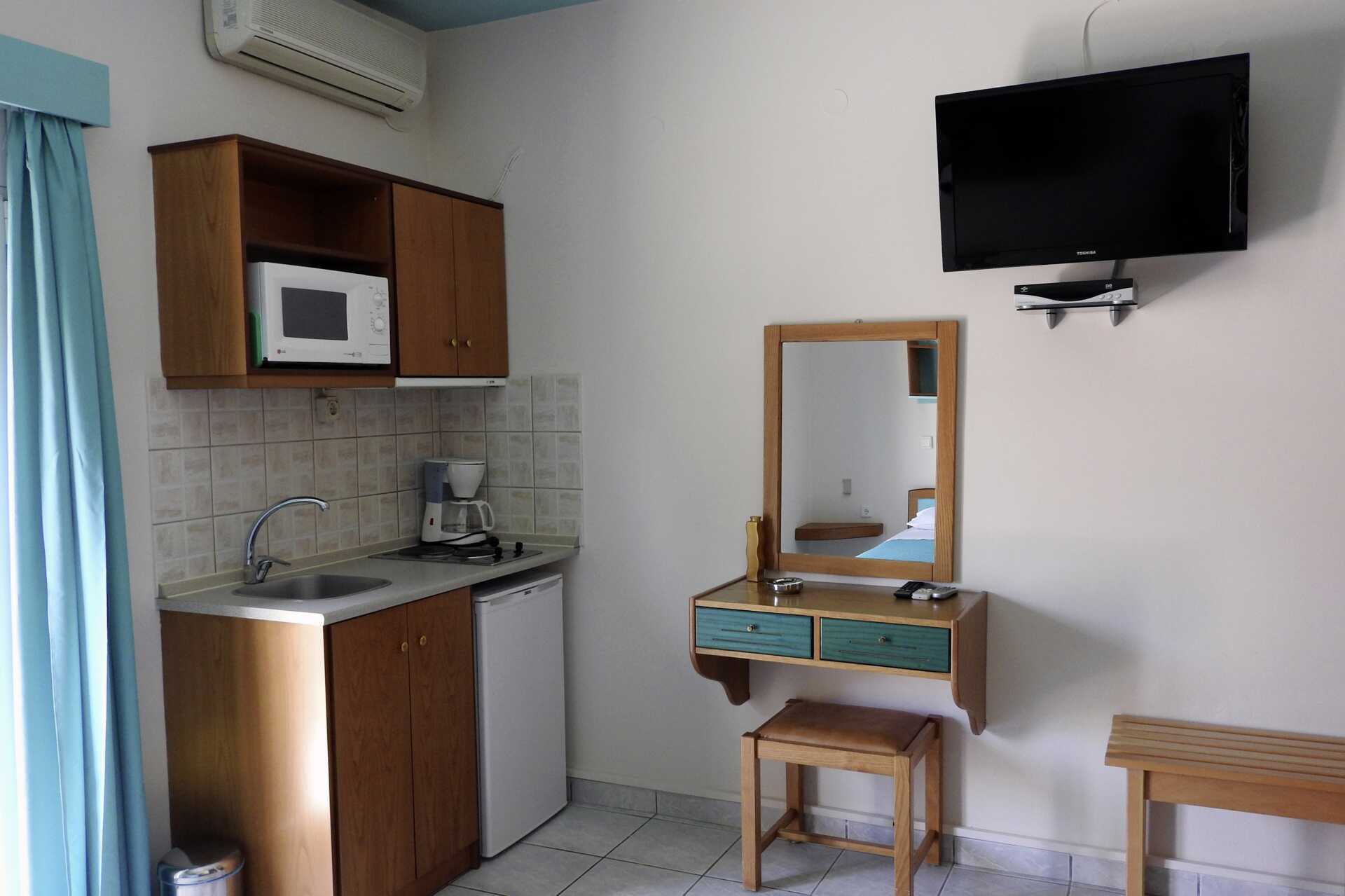 2-værelses lejlighed med balkon eller terrasse. Soveværelse og kombineret opholdsrum med minikøkken. En dobbeltseng eller to enkeltsenge. Mulighed for ekstra opredning i sovesofa. Minikøkken med kogeplader, mikroovn, køleskab, kaffemaskine og enkelt køkkenudstyr. Gratis wifi. Aircondition og deponering mod betaling. Tv med internationale kanaler. Badeværelse med bruser og toilet. Rengøring 6 gange om ugen.