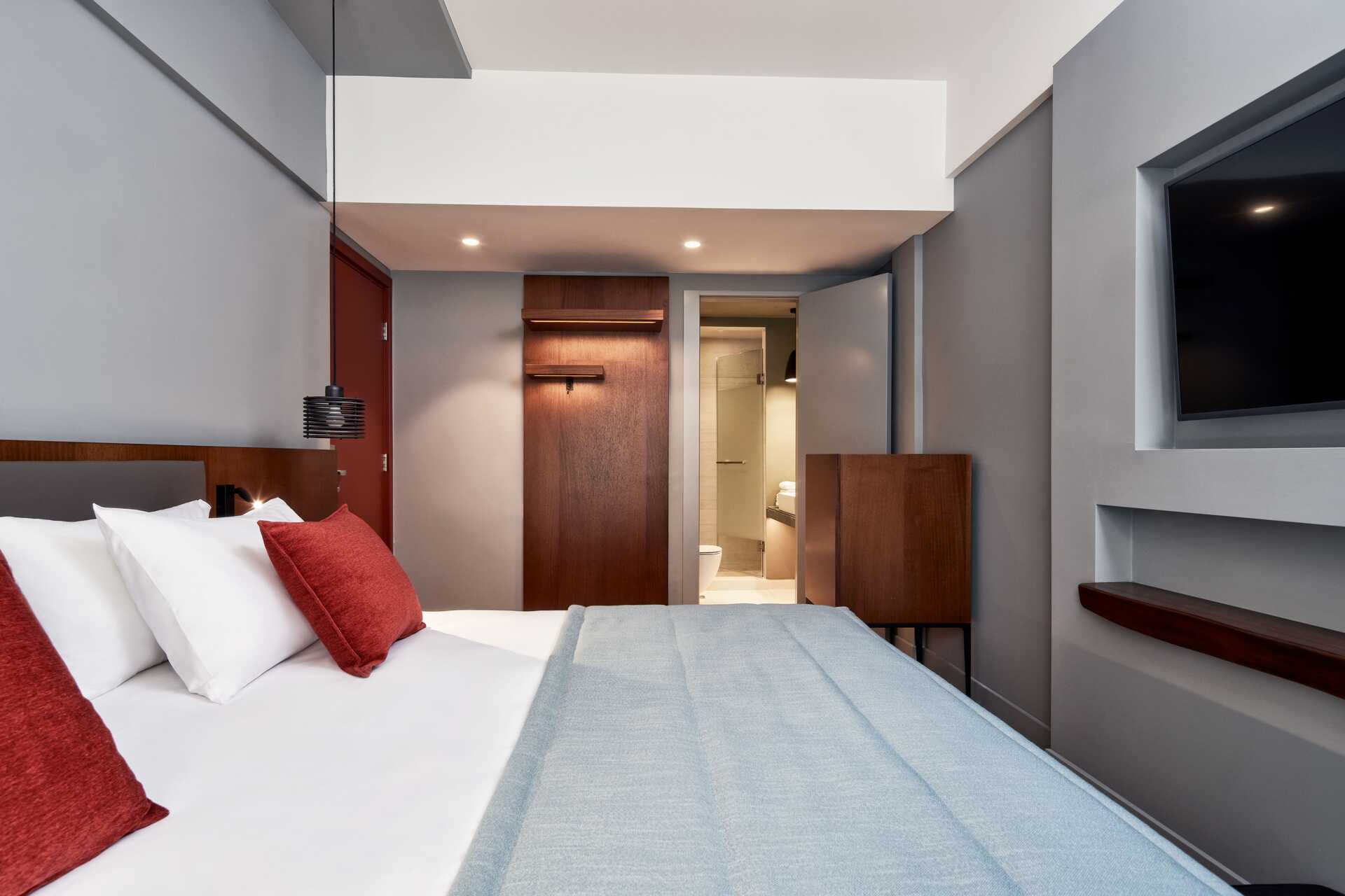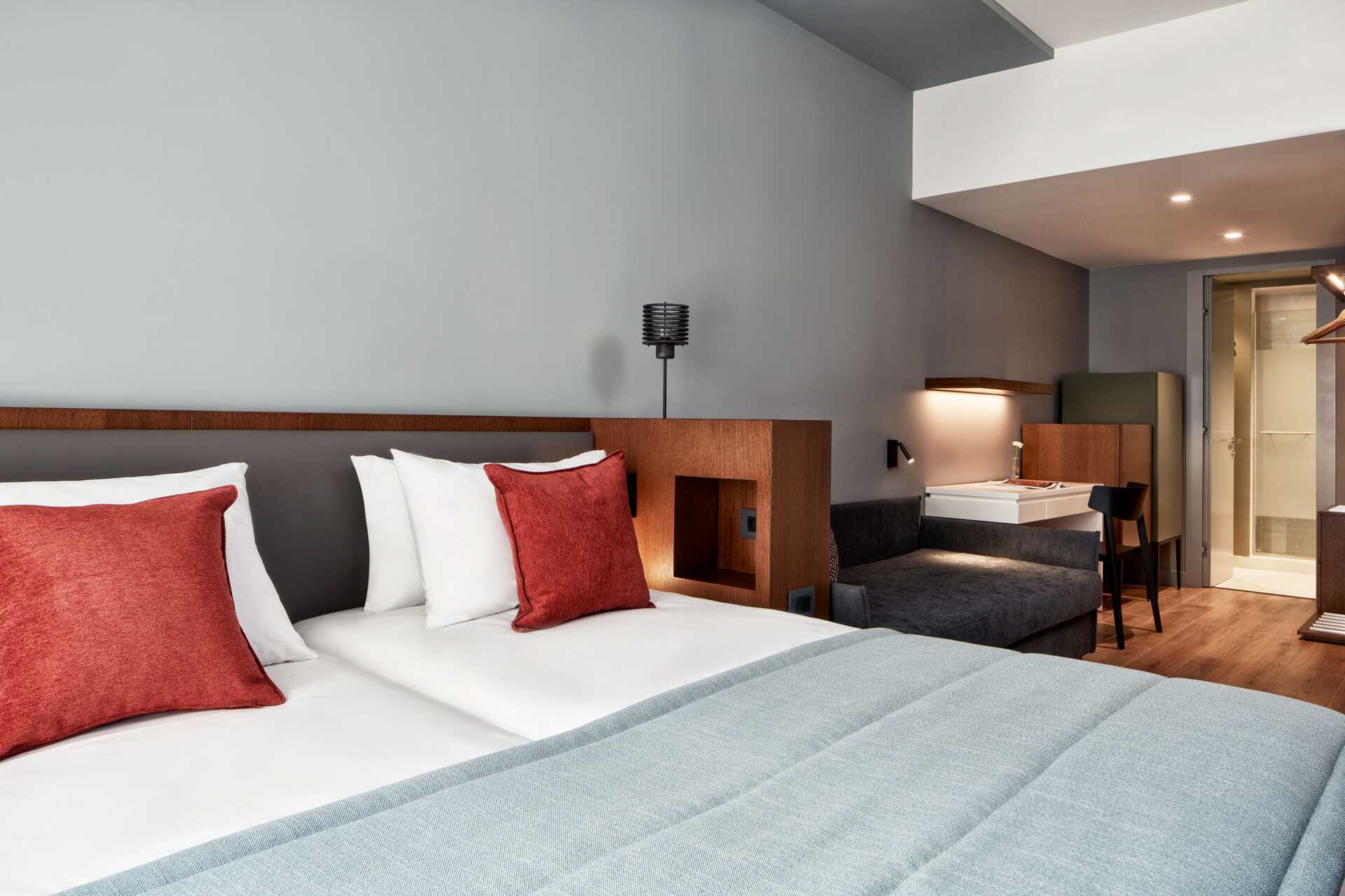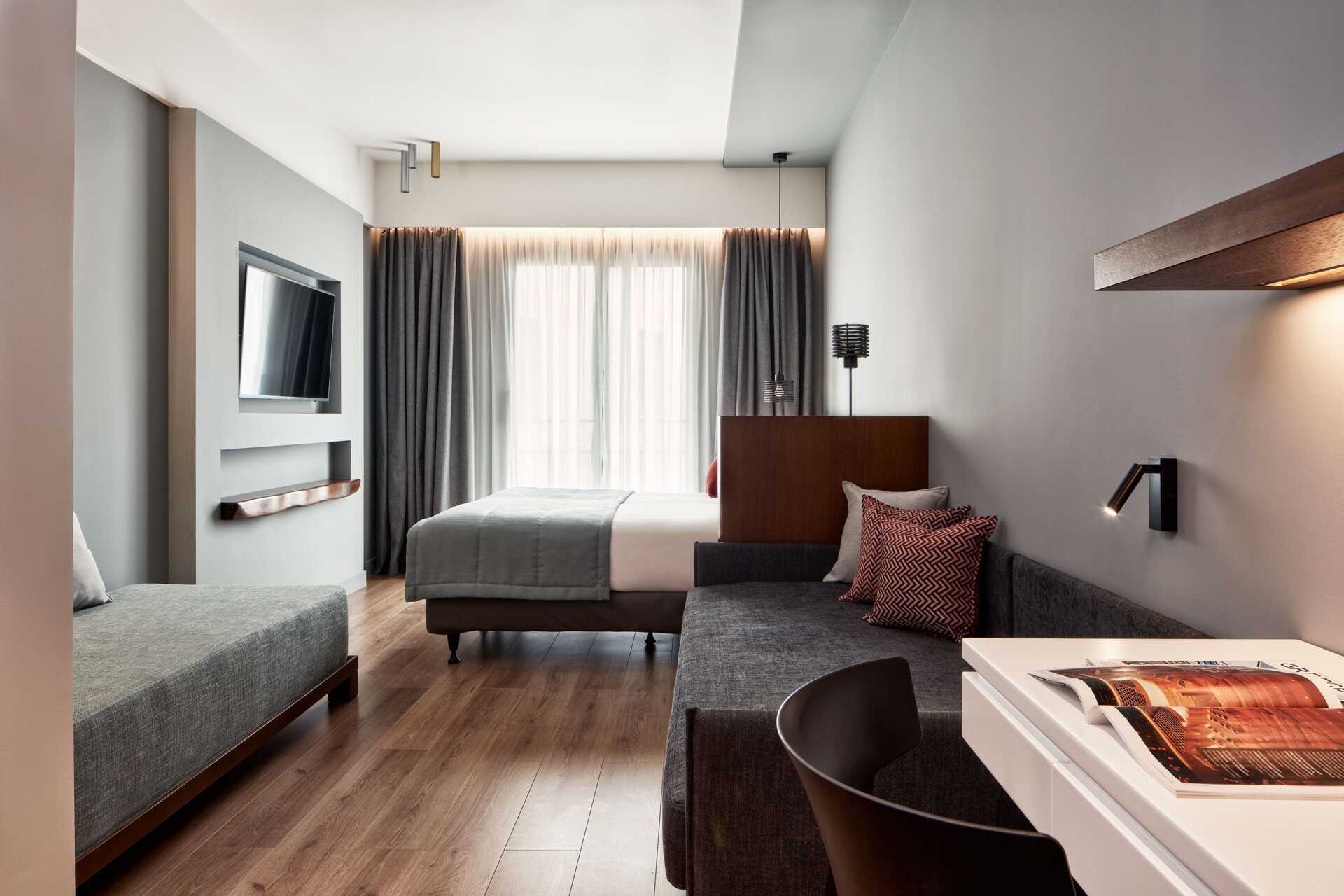 Firepersoners-værelser uden udeplads. En dobbeltseng eller to enkeltsenge. To sovesofaer. Gratis wifi, aircondition og deponering. Køleskab. Tv med internationale kanaler. Hårtørrer. Badeværelse med bruser og toilet. Rengøring 6 gange om ugen.