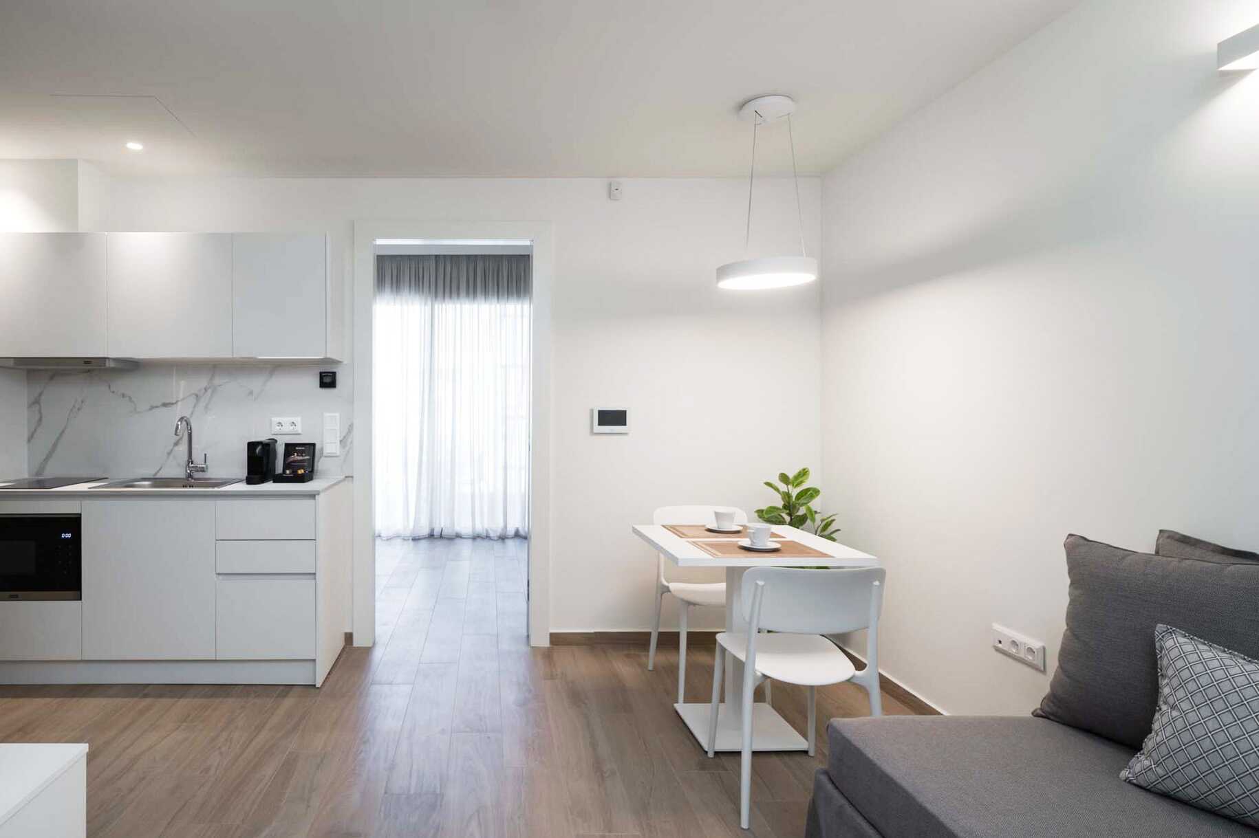 2-værelses lejlighed med balkon. Soveværelse og kombineret opholdsrum med minikøkken. En dobbeltseng. Mulighed for ekstra opredninger i sovesofa. Minikøkken med kogeplader, mikroovn, køleskab, elkedel, brødrister, Nespresso kaffemaskine, opvaskemaskine og enkelt køkkenudstyr. Gratis wifi, aircondition og deponering. Tv med internationale kanaler. Vaskemaskine. Strygejern og strygebræt. Badekåber og tøfler. Hårtørrer. Badeværelse med bruser og toilet. Rengøring 6 gange om ugen. Børn under to år tæller med i det maksimale antal personer på værelset.
