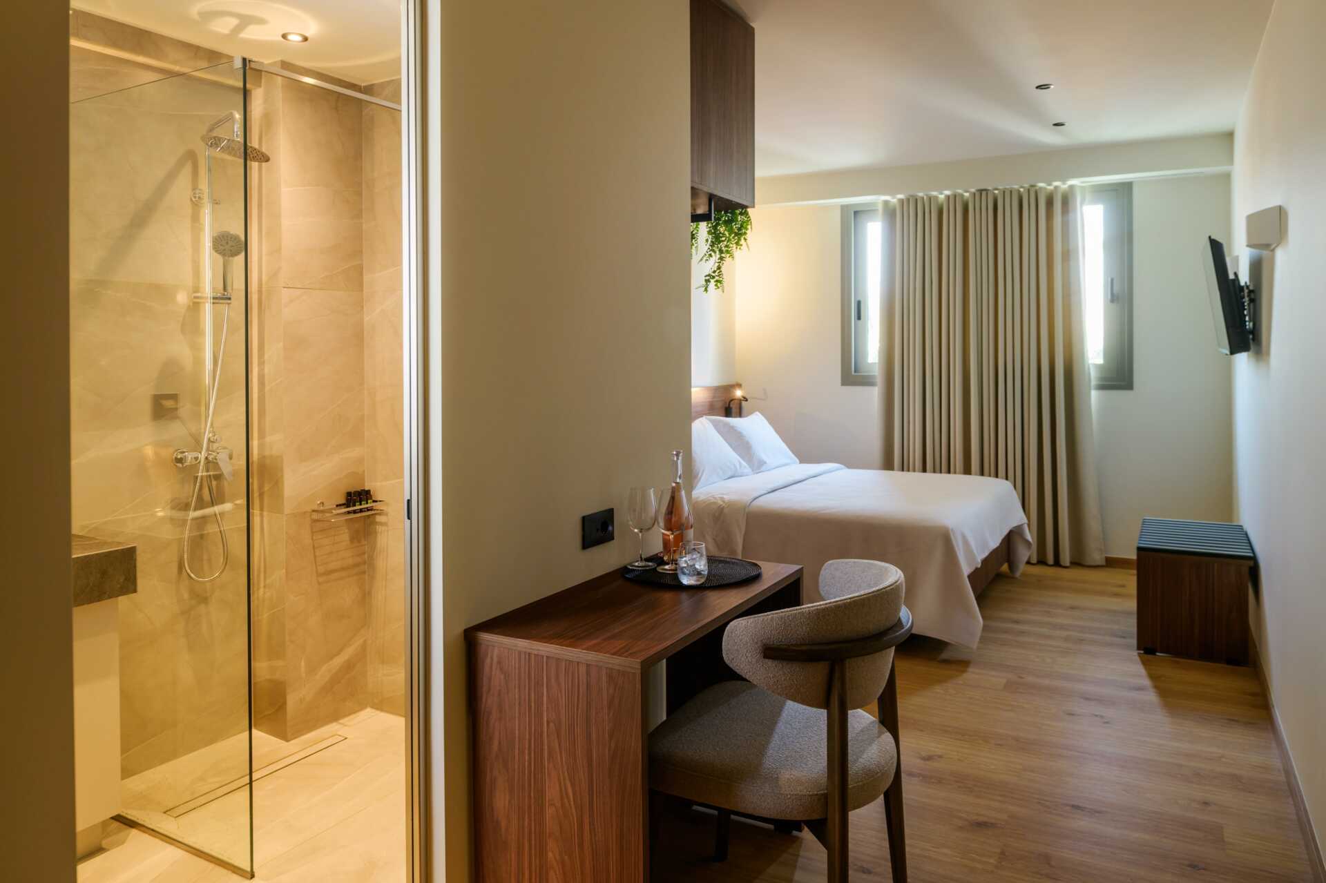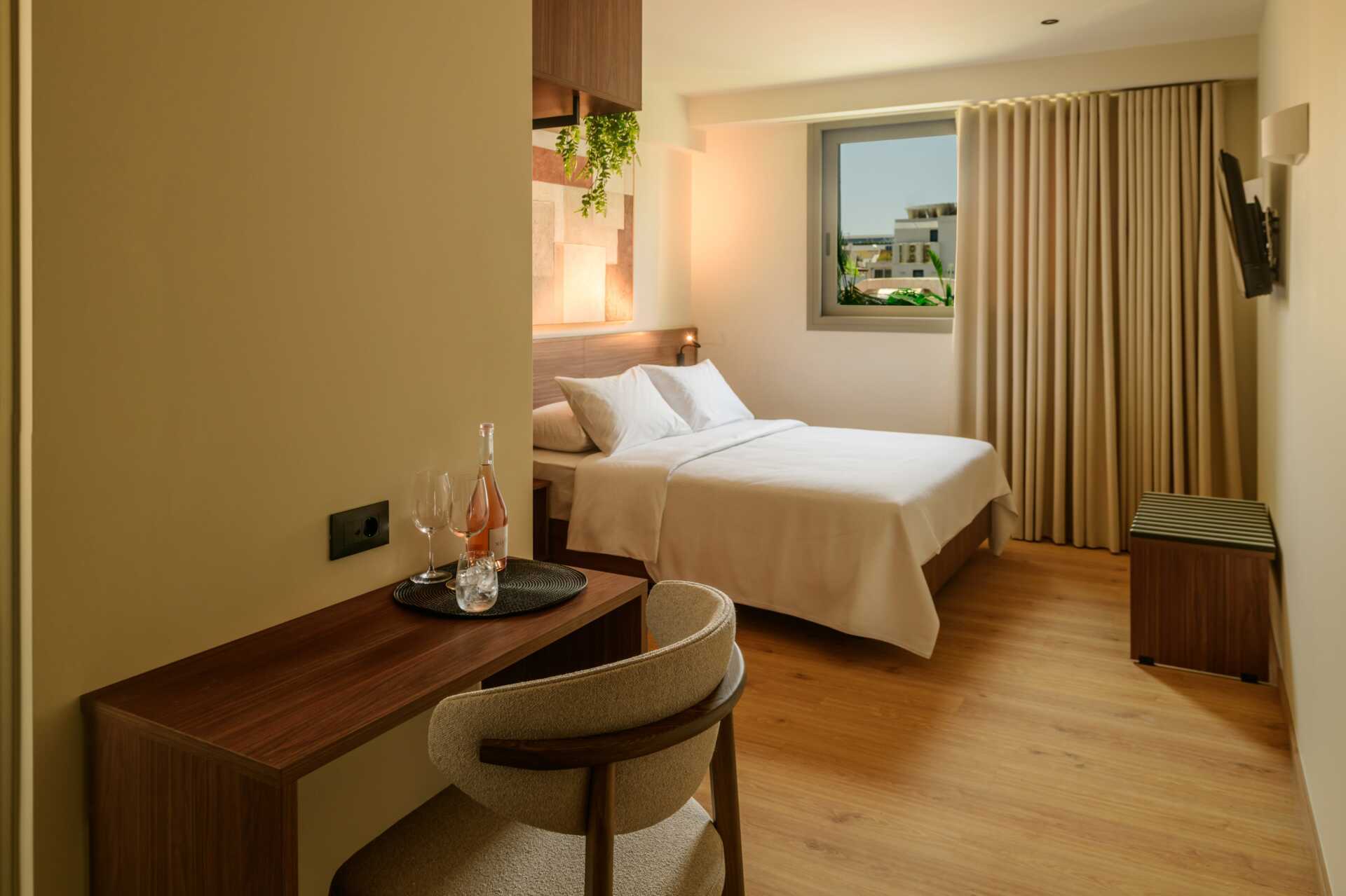 Dobbeltværelser uden udeplads. En dobbeltseng eller to enkeltsenge. Gratis wifi, aircondition og deponering. Lille køleskab. En flaske vand og frugt venter på værelset ved ankomsten. Tv med internationale kanaler. Strygejern. Hårtørrer. Badekåber og tøfler. Badeværelse med bruser og toilet. Rengøring 6 gange om ugen.