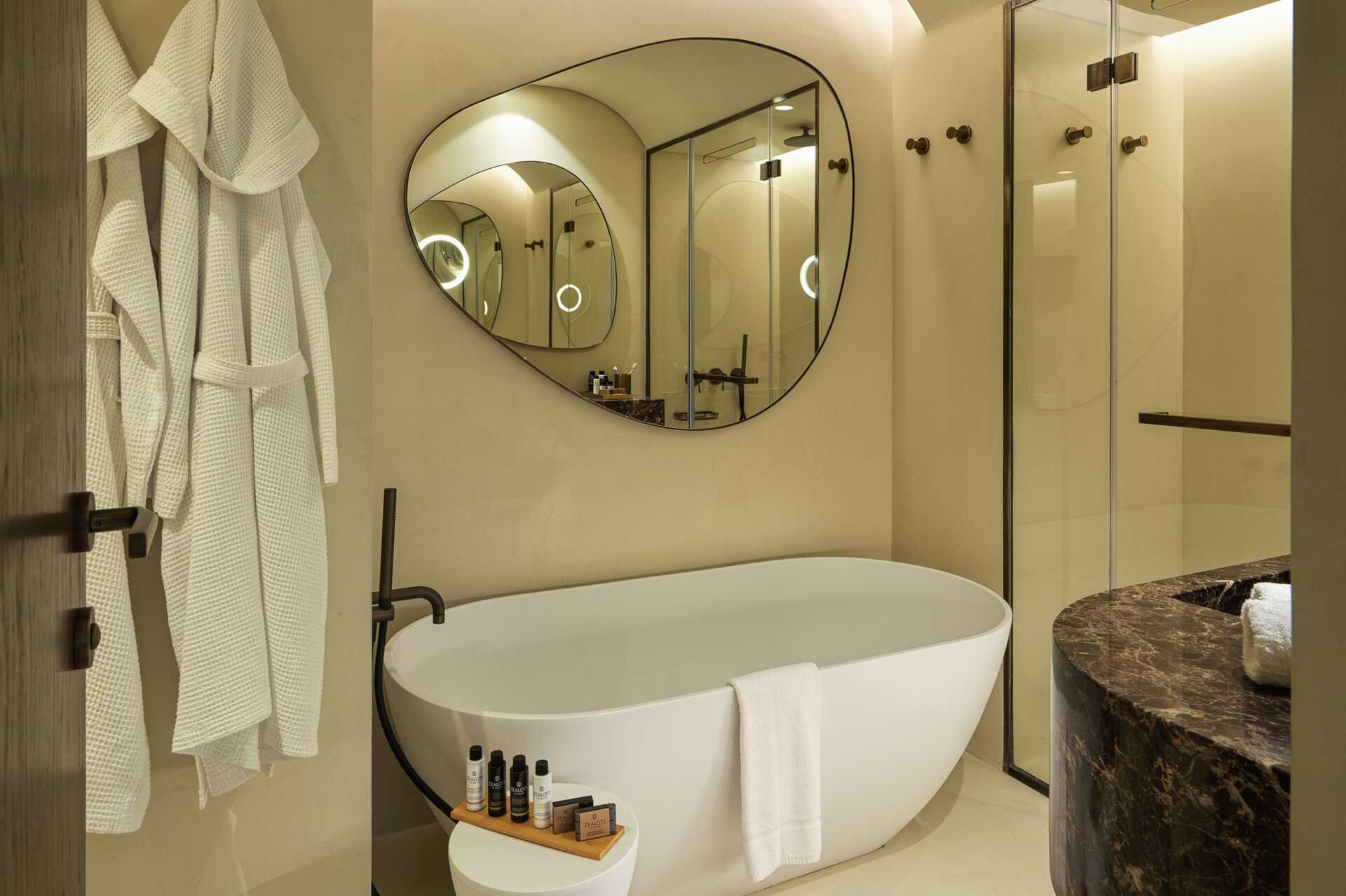 Deluxe-suite med balkon og havudsigt. En dobbeltseng eller to enkeltsenge. Opholdsrum med sofa og spiseplads. Gratis wifi, aircondition og deponering. Tv. Espressomaskine. Badeværelse med badekar/bruser og toilet. Rengøring 6 gange om ugen.