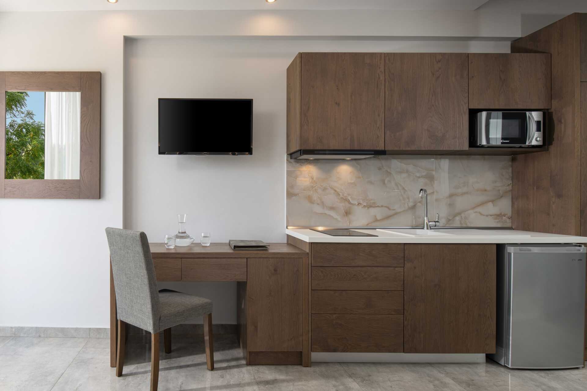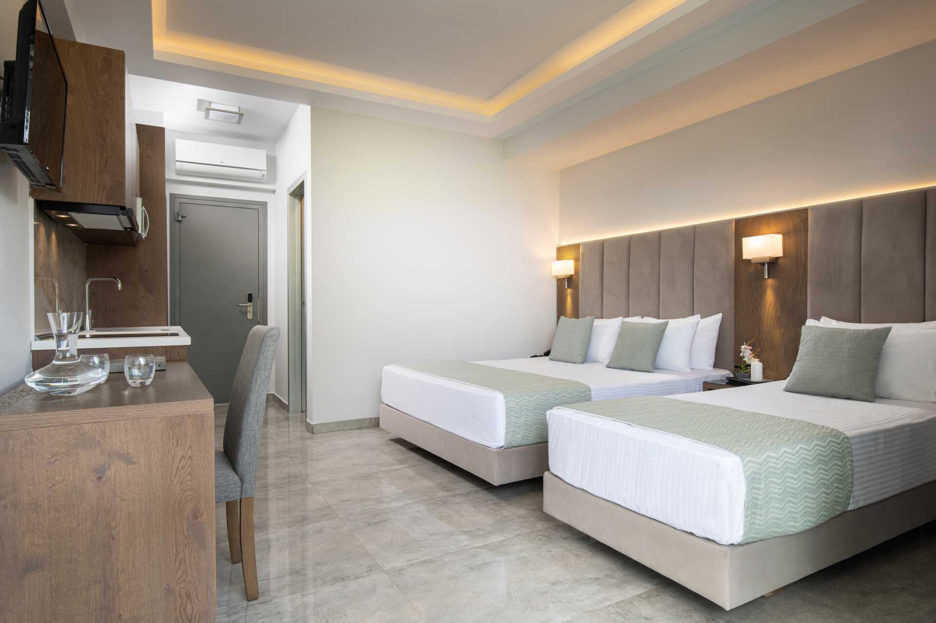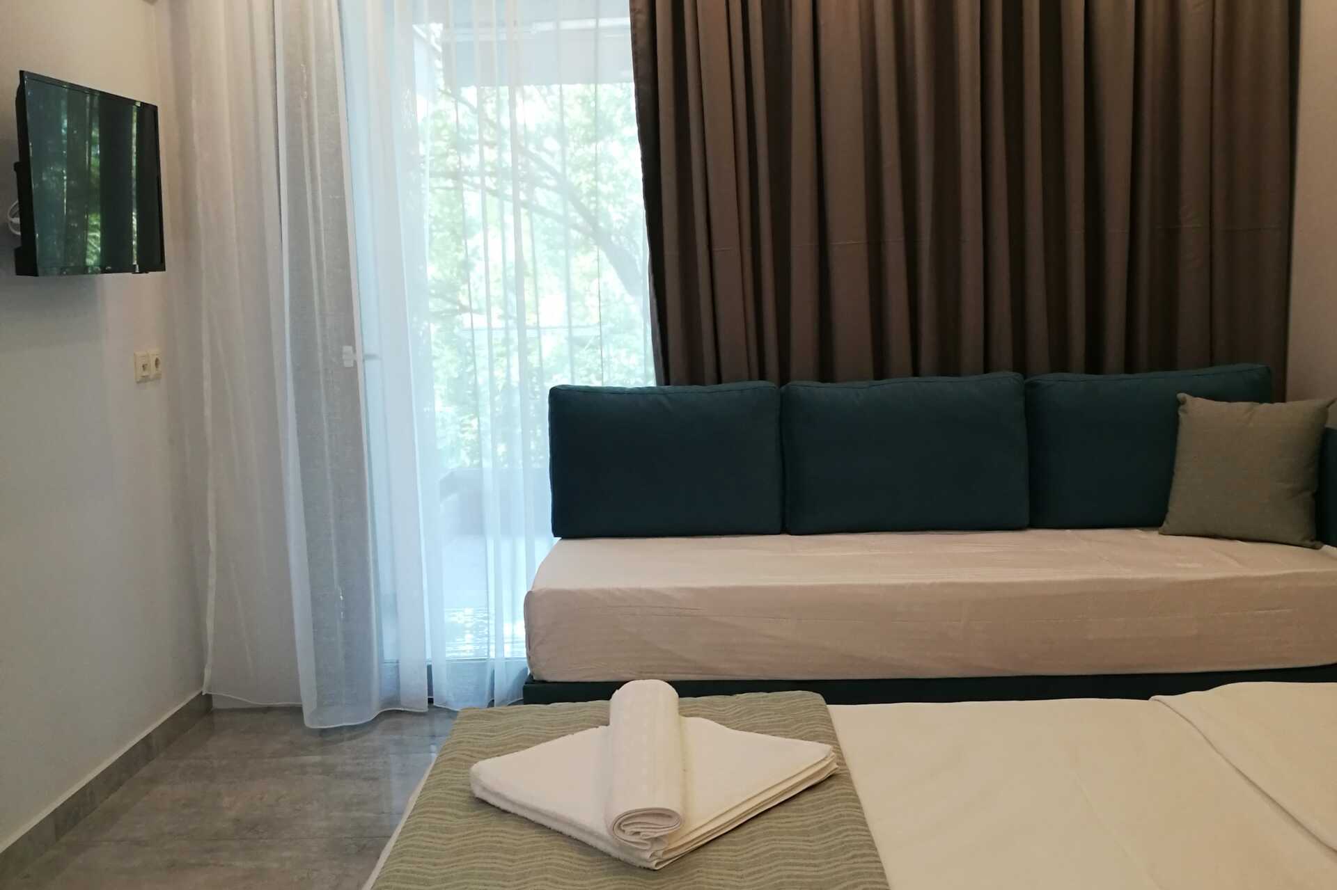 1-værelses lejlighed superior med balkon eller terrasse. Kombineret soveværelse og minikøkken. En dobbeltseng og mulighed for ekstra opredning i sovesofa. En skydedør af glas mellem sengen og sovesofaen. Minikøkken med køleskab, kogeplader, mikrobølgeovn og enkelt køkkenudstyr. Gratis wifi, aircondition og deponering. Tøfler. Hårtørrer. Badeværelse med bruser og toilet. Rengøring 7 gange om ugen.