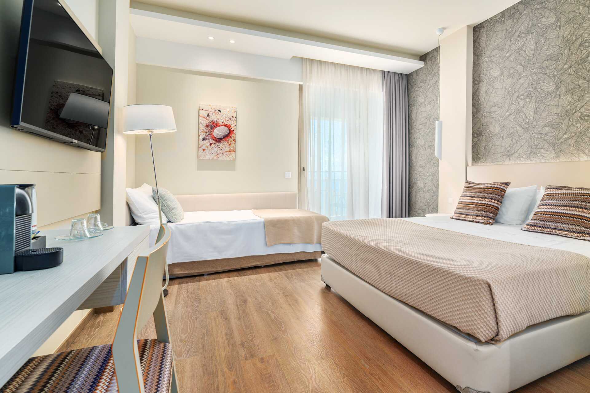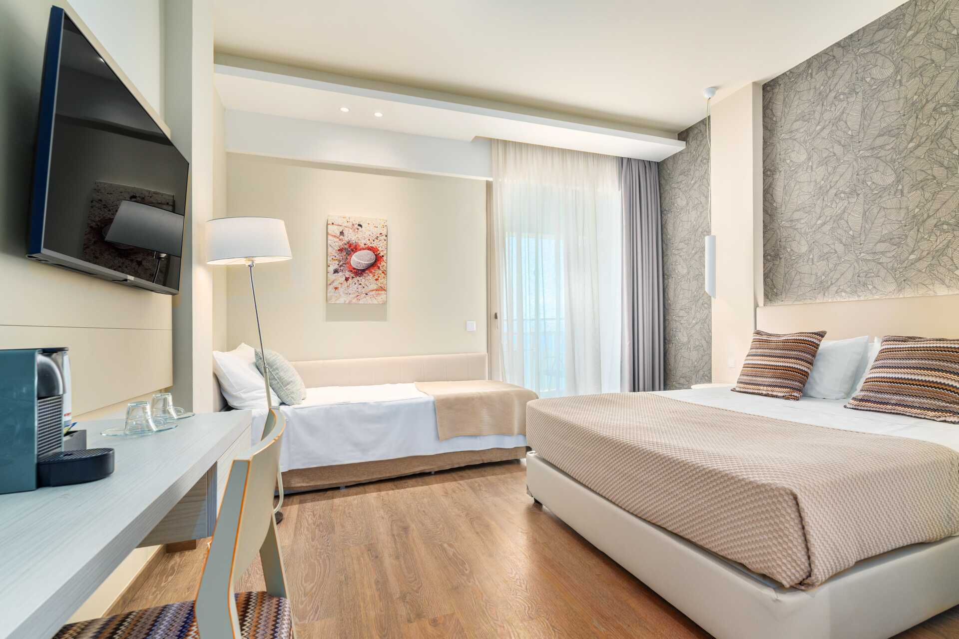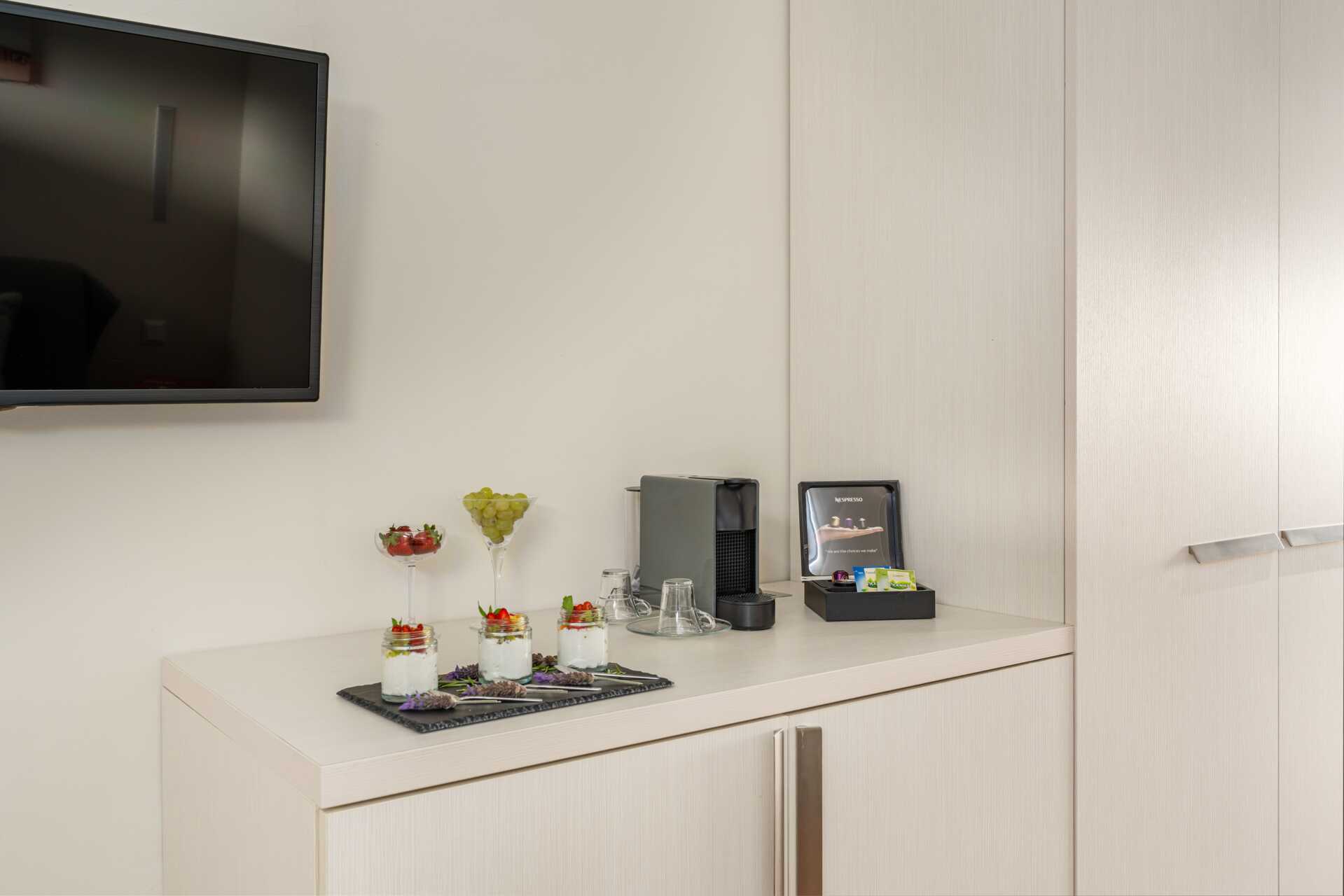 Superior-værelse med balkon og havudsigt. En dobbeltseng eller to enkeltsenge. Mulighed for ekstra opredning i sovesofa. Pudemenu. Gratis wifi, aircondition og deponering. Køleskab. Minibar inkluderet ved ankomst - genopfyldning mod betaling. El-kedel og kaffe/te. Nespresso-maskine - kapsler inkluderet ved ankomst, genopfyldning mod betaling. Tv med internationale kanaler. Badekåber og tøfler. Hårtørrer. Badeværelse med bruser og toilet. Rengøring 7 gange om ugen.