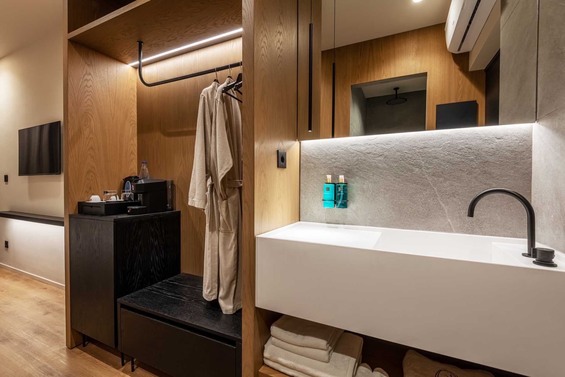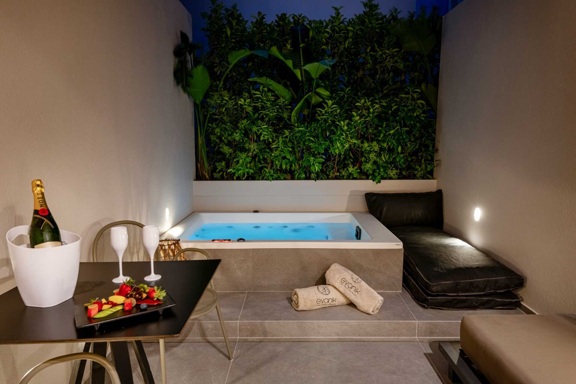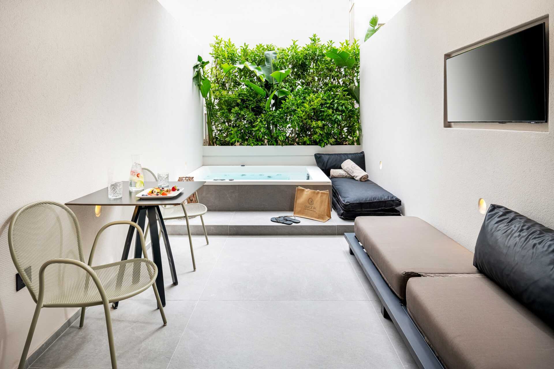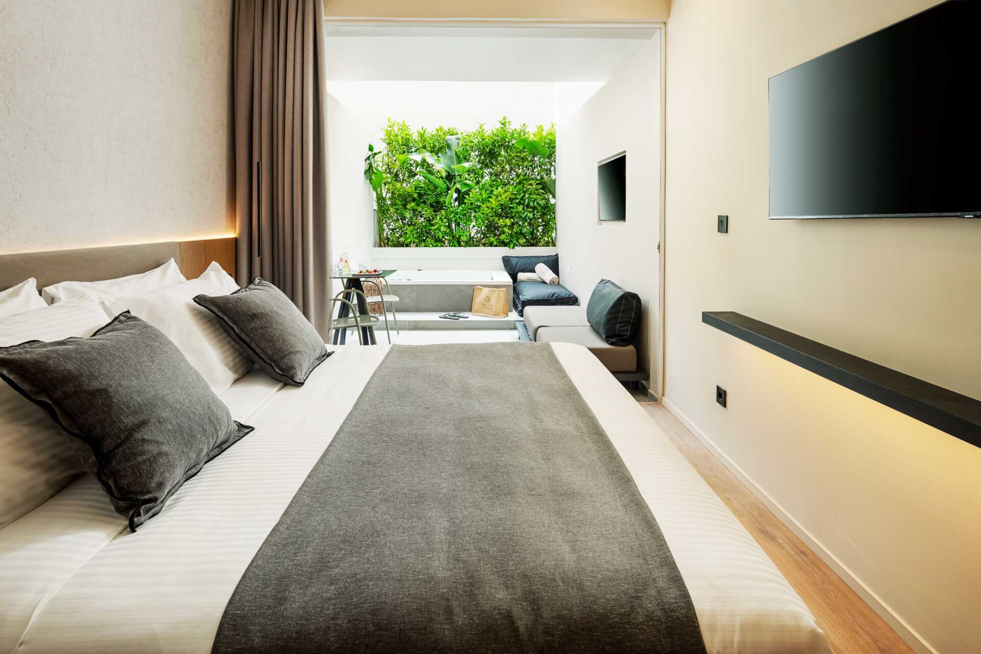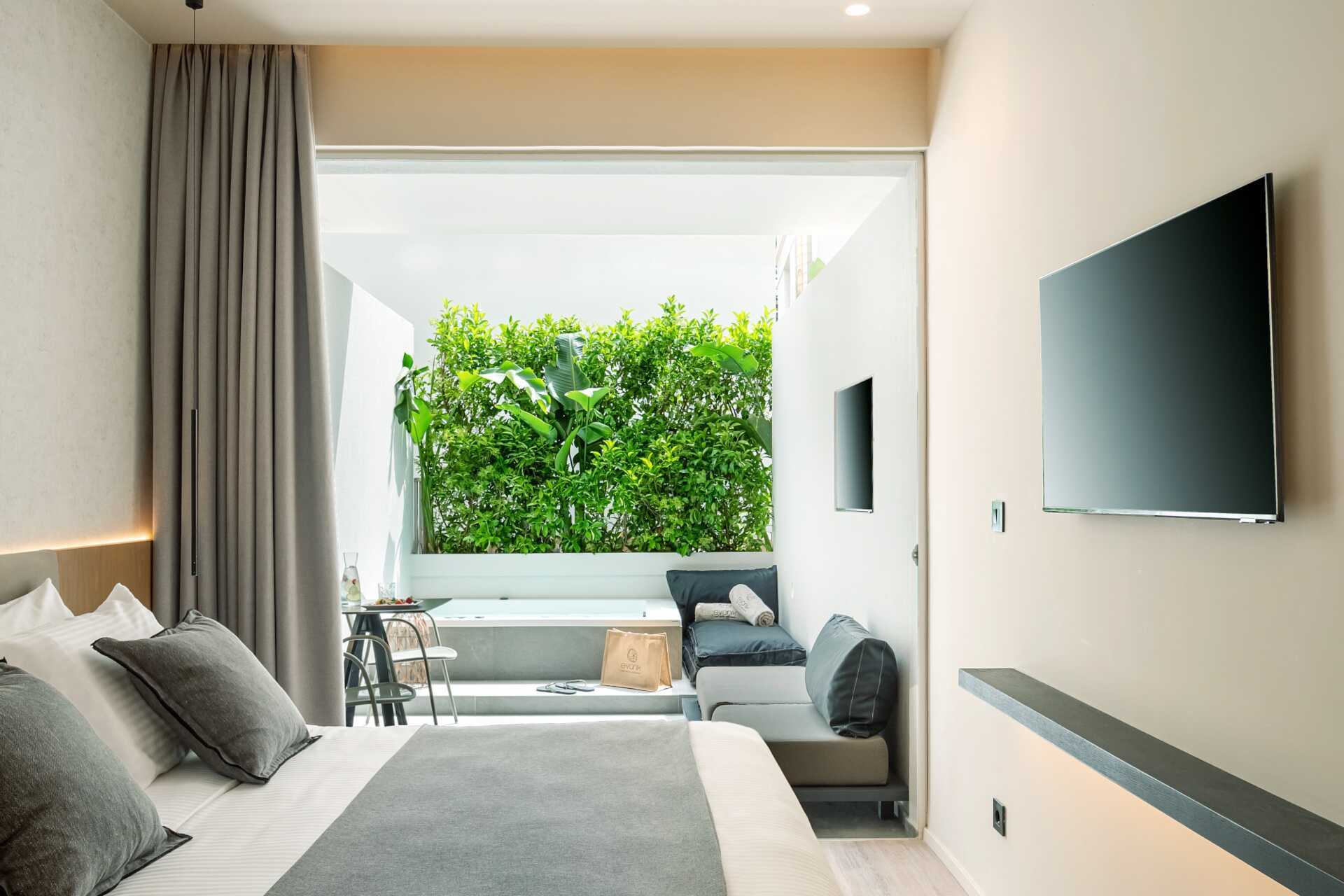 Dobbeltværelse med terrasse i stueplan. På terrassen er der jacuzzi, solstole, stole og borde. To trin fra terrassen op til jacuzzien. En dobbeltseng. Gratis wifi, aircondition og deponering. Køleskab. Tv med internationale kanaler. Køleskab. El-kedel og kaffe/te. Illy kaffemaskine. Badekåber og tøfler. Hårtørrer. Badeværelse med separat bruser og separat toilet. Rengøring 7 gange om ugen. Børn under to år tæller med i det maksimale antal personer på værelset.