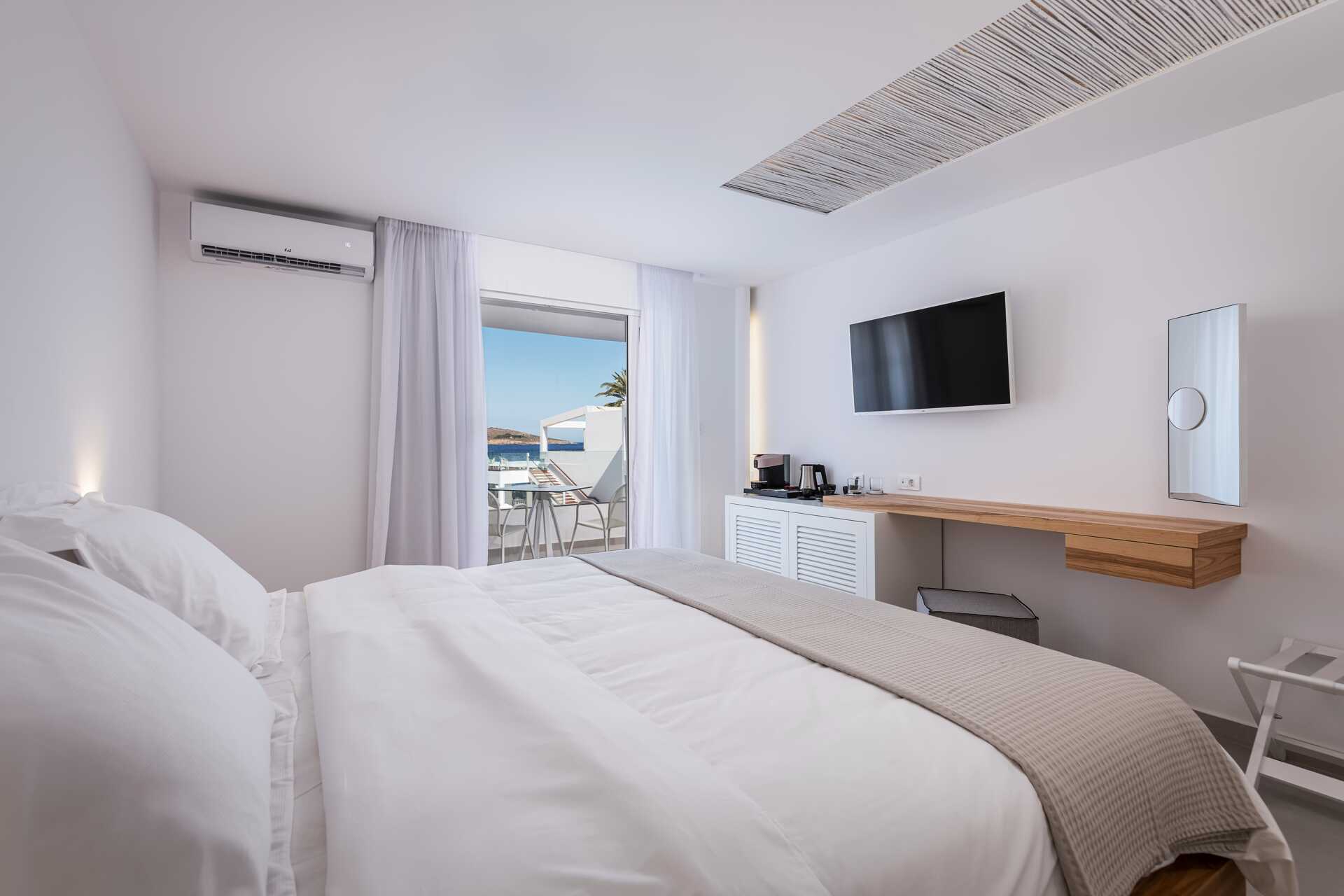Dobbeltværelse med balkon eller terrasse og havudsigt. En dobbeltseng. ifi, aircondition og deponering. Køleskab. El-kedel, kaffe og te. Espressomaskine. Tv med internationale kanaler. Strandtaske med pool- og badehåndklæder og strandsko. Badekåber og tøfler. Hårtørrer. Badeværelse med bruser og toilet. Rengøring 7 gange om ugen. Børn under to år er inkluderet i det maksimale antal personer på værelset.