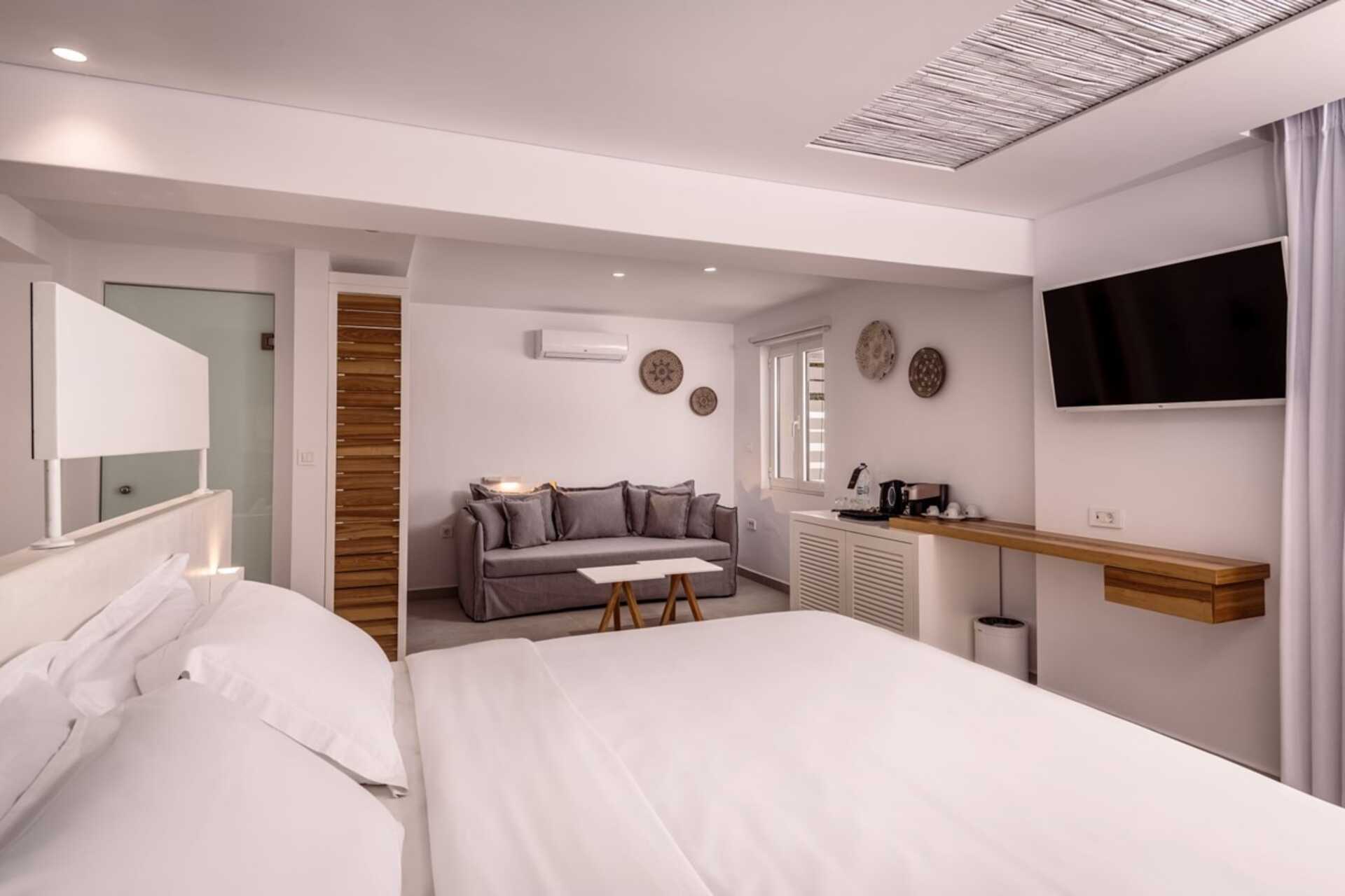 Junior-suiter med balkon eller terrasse, nogle med havudsigt. En dobbeltseng. Mulighed for ekstra opredning i sovesofa. Gratis wifi, aircondition og deponering. Køleskab. Espressomaskine. El-kedel og kaffe/te. Tv med internationale kanaler. Badekåber og tøfler. Strandtaske med pool- og badehåndklæder og badesko. Hårtørrer. Badeværelse med bruser og toilet. Rengøring 7 gange om ugen. Børn under to år er inkluderet i det maksimale antal personer på værelset.