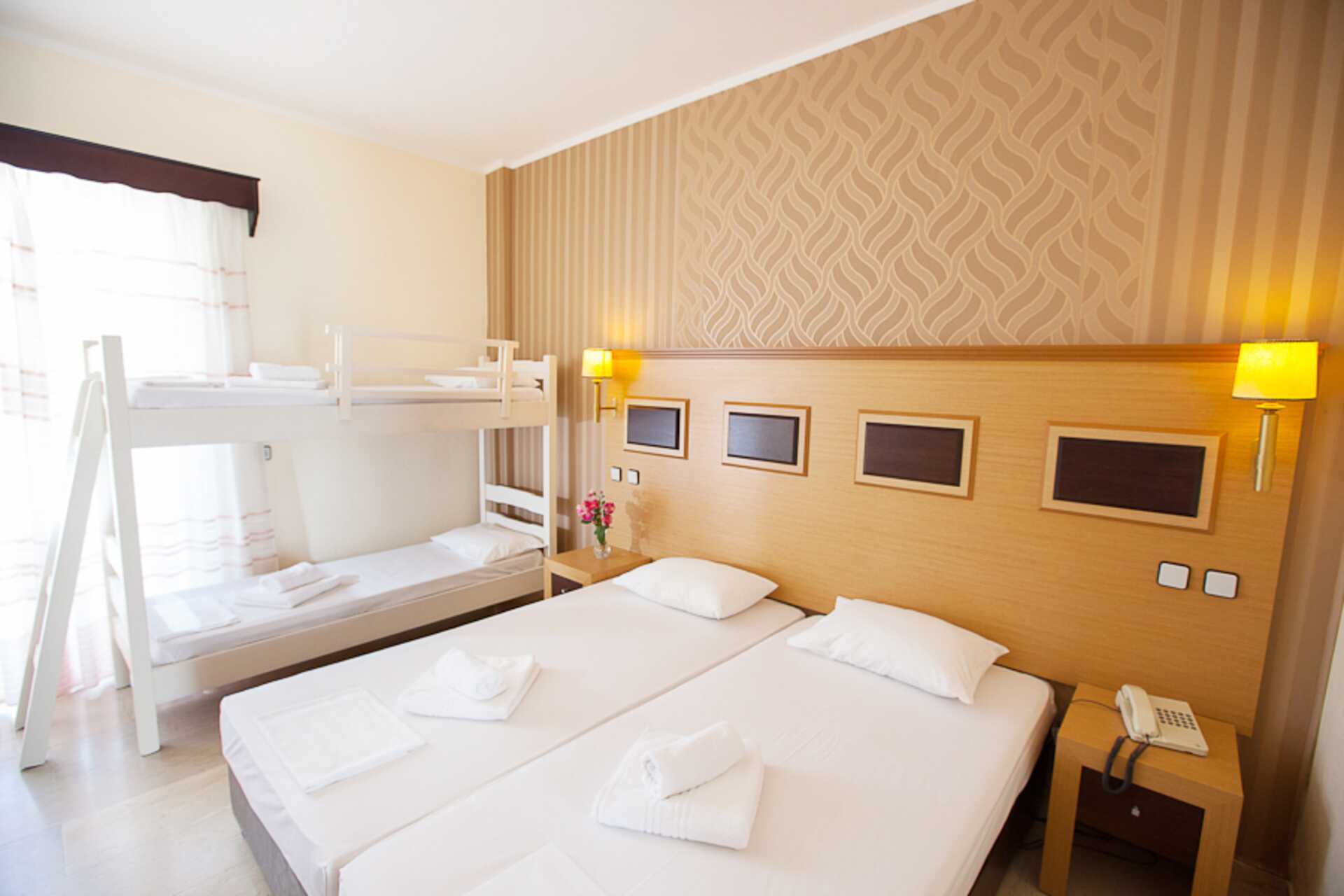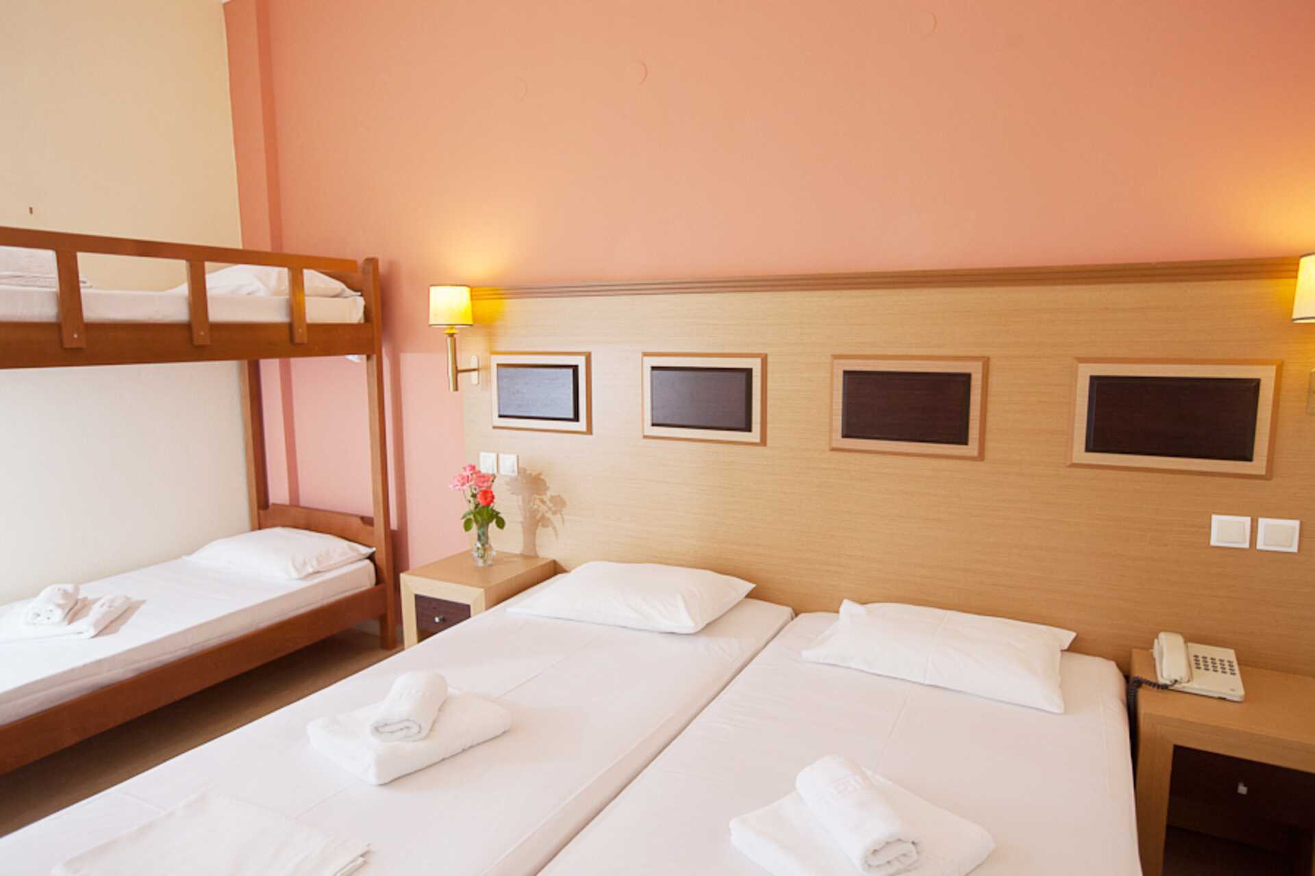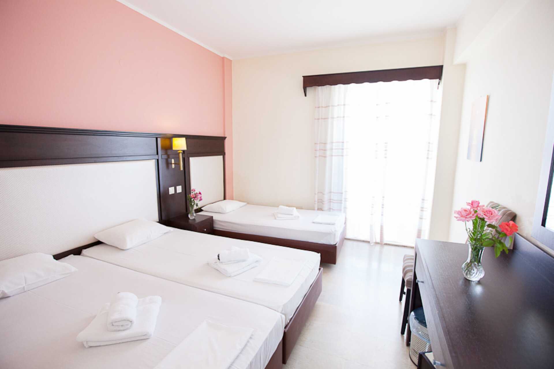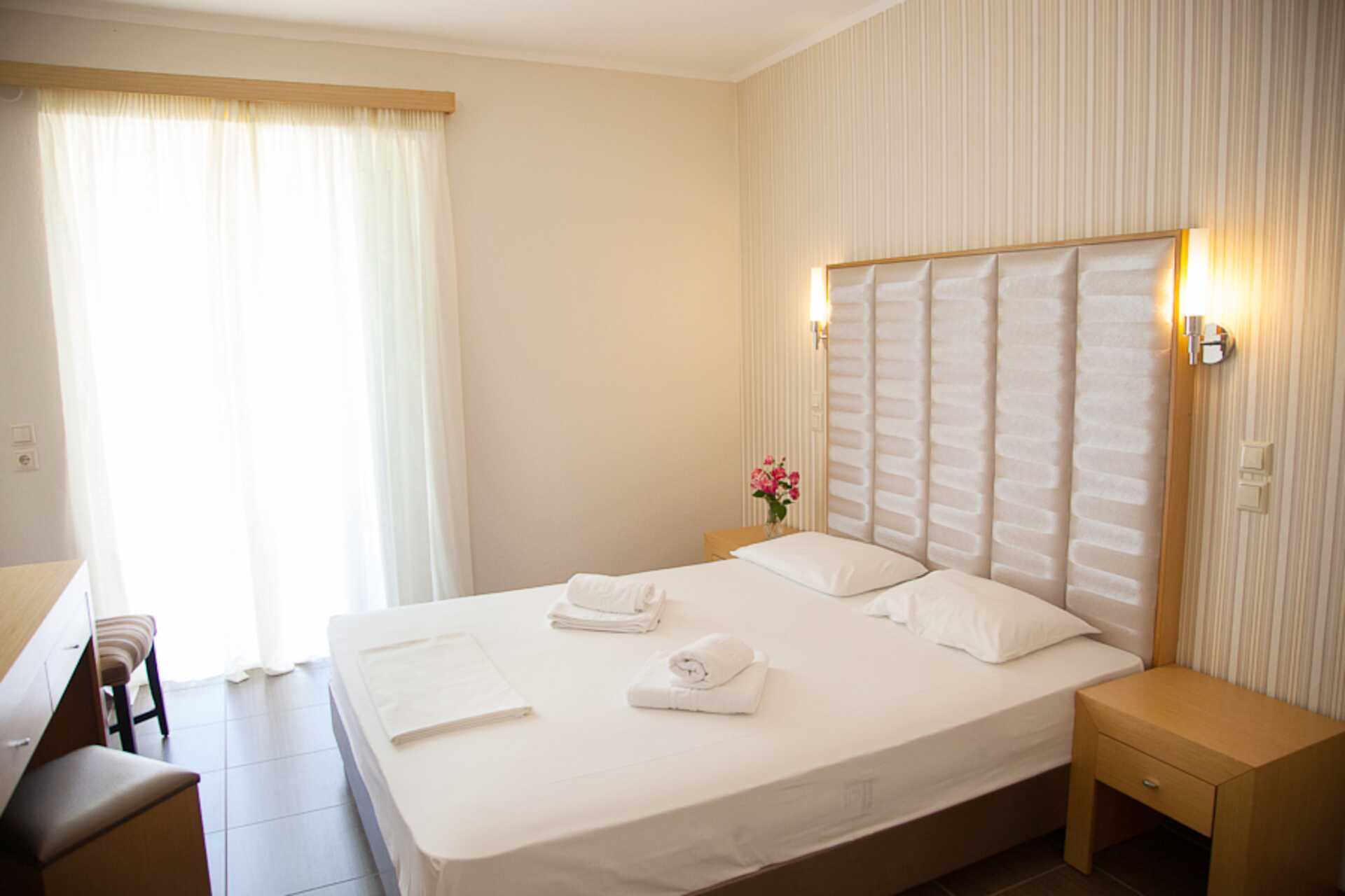 Dobbeltværelser med balkon, nogle med havudsigt. To enkeltsenge. Mulighed for en ekstra opredning i sovesofa eller for op til to børn i en køjeseng (180 cm lang). Gratis wifi, aircondition og deponering. Køleskab. Tv med lokale kanaler. Hårtørrer. Badeværelse med badekar eller bruser og toilet. Rengøring 7 gange om ugen.