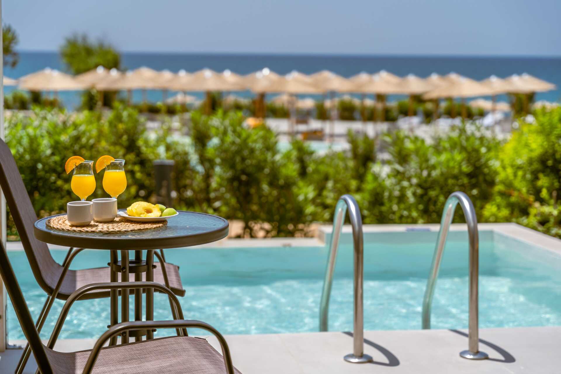 Junior-suiterne med udeplads og havudsigt samt direkte adgang til en delt pool. Der er bord og stole på terrassen. Suiterne er placeret i sidebygningerne. En dobbeltseng. Mulighed for ekstra opredning i sovesofa. Gratis wifi, aircondition og deponering. Køleskab. Nespresso-kaffemaskine. Tv med internationale kanaler. Hårtørrer. Badeværelse med bruser og toilet. Rengøring 7 gange om ugen. Børn under to år tæller med i det maksimale antal personer i lokalet.