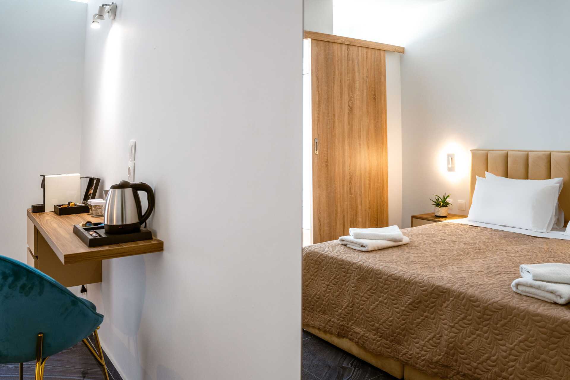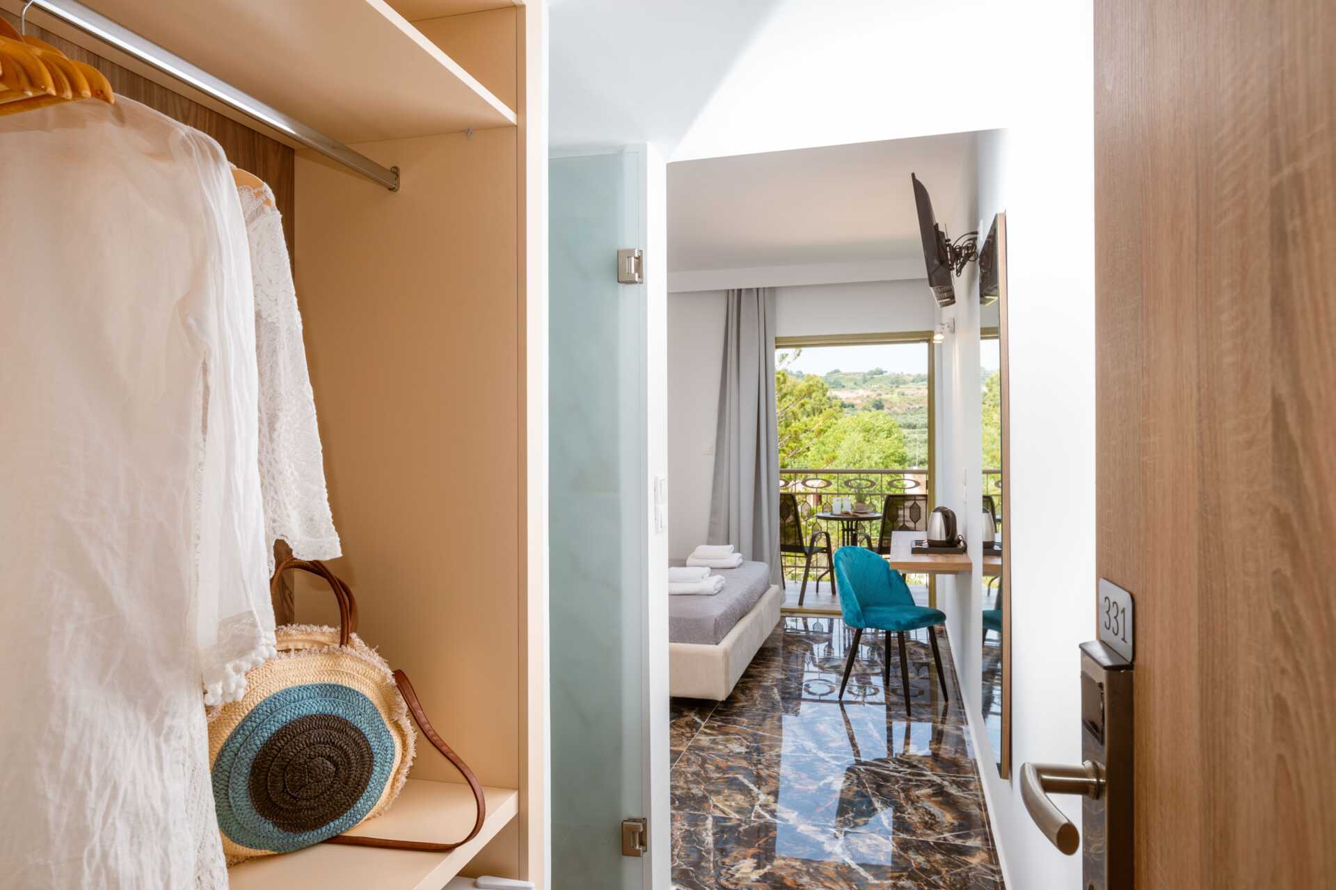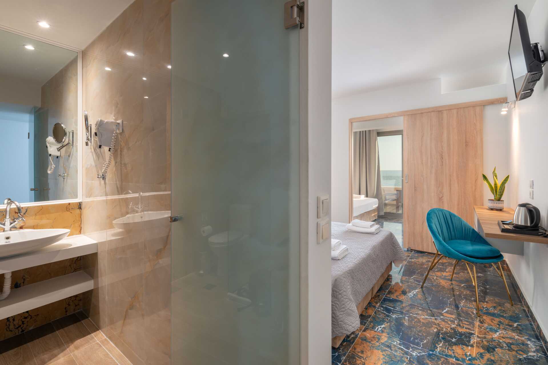 Junior-suite med balkon og havudsigt. En dobbeltseng. Mulighed for ekstra opredning i sovesofa. Gratis wifi, aircondition og deponering. Køleskab. Nespresso kaffemaskine. Tv med internationale kanaler. Hårtørrer. Badeværelse med bruser og toilet. Rengøring 7 gange om ugen. Børn under to år tæller med i det maksimale antal personer på værelset. Junior-suiterne er placeret i både hovedbygningen og sidebygningerne.