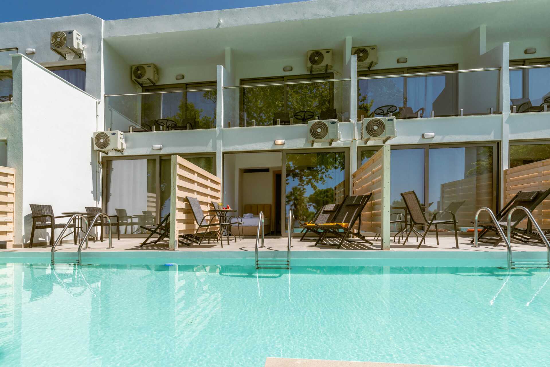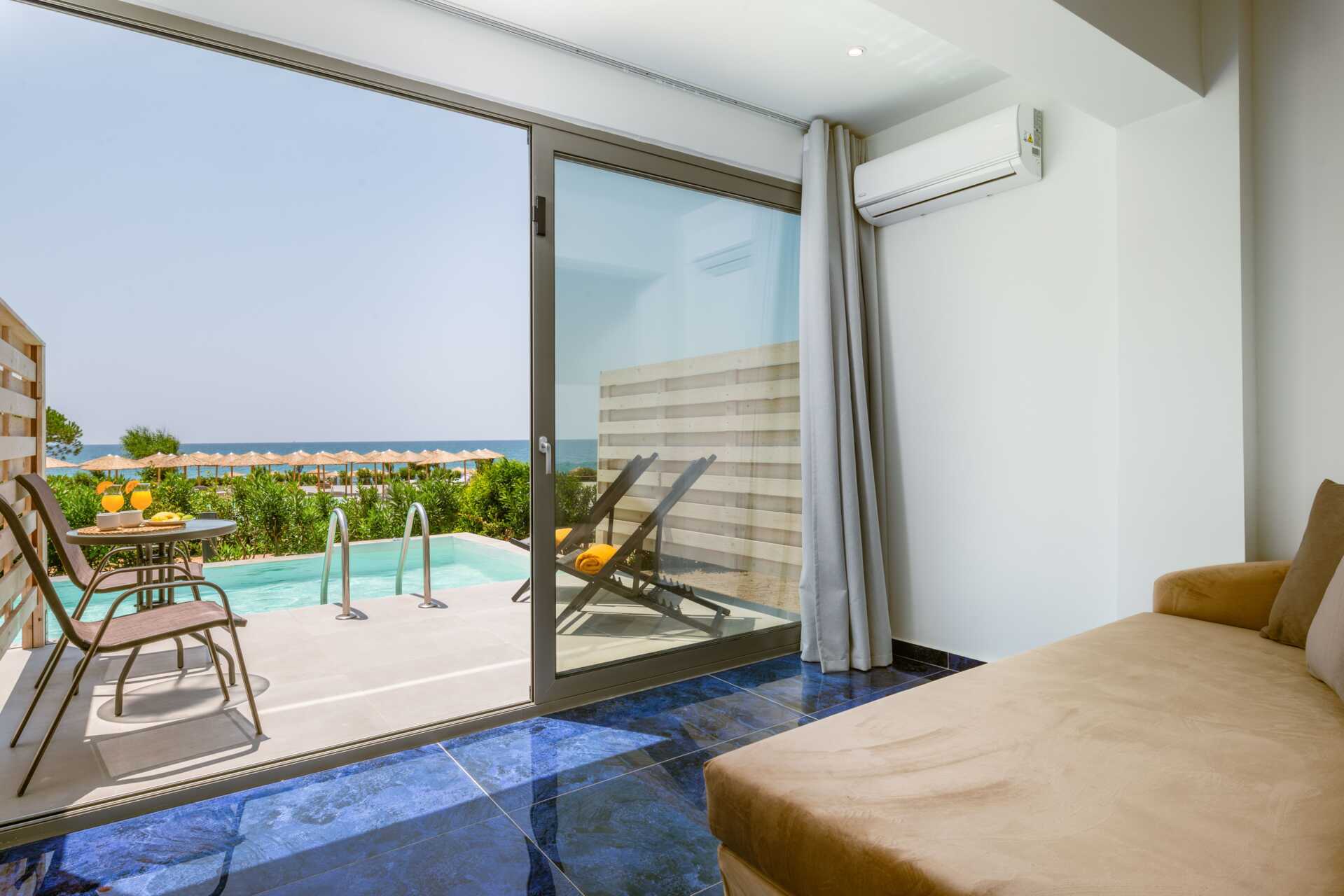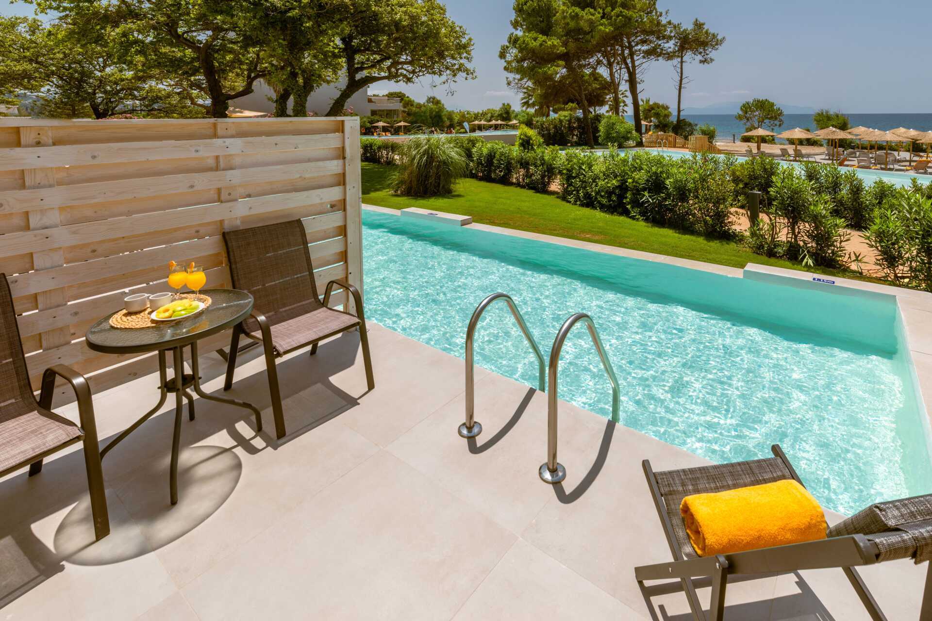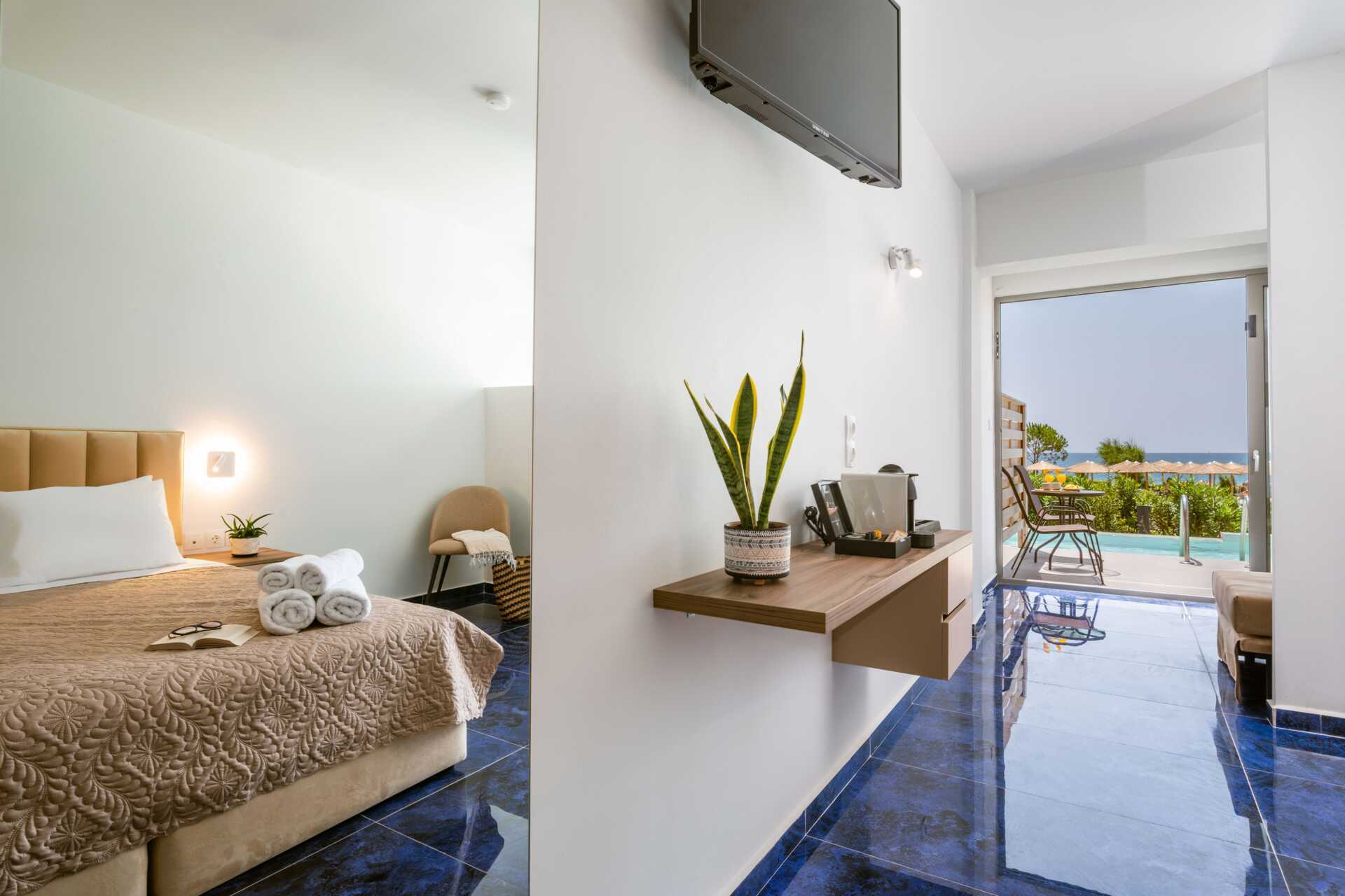 Junior-suiterne med udeplads og havudsigt samt direkte adgang til en delt pool. Der er bord og stole på terrassen. Suiterne er placeret i sidebygningerne. En dobbeltseng. Mulighed for ekstra opredning i sovesofa. Gratis wifi, aircondition og deponering. Køleskab. Nespresso-kaffemaskine. Tv med internationale kanaler. Hårtørrer. Badeværelse med bruser og toilet. Rengøring 7 gange om ugen. Børn under to år tæller med i det maksimale antal personer i lokalet.