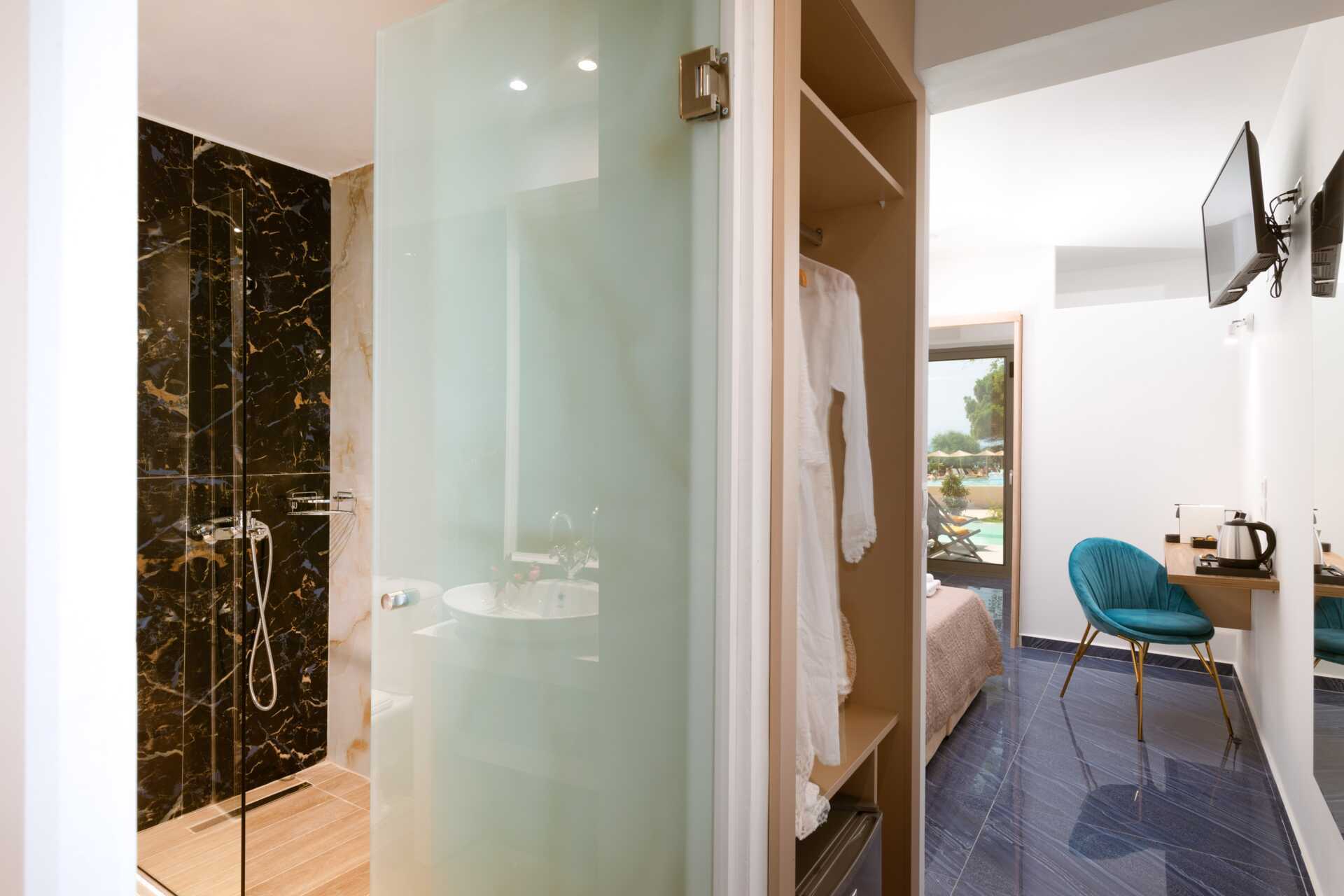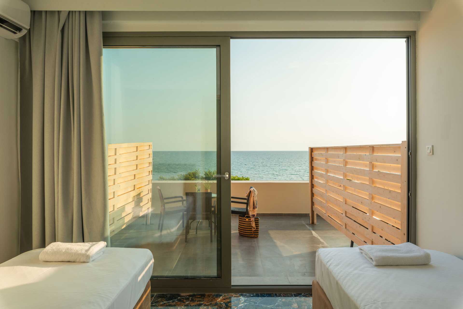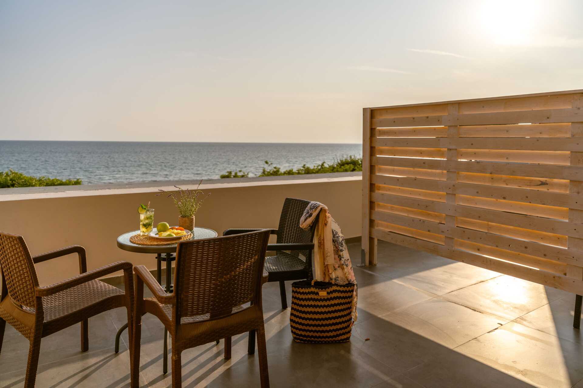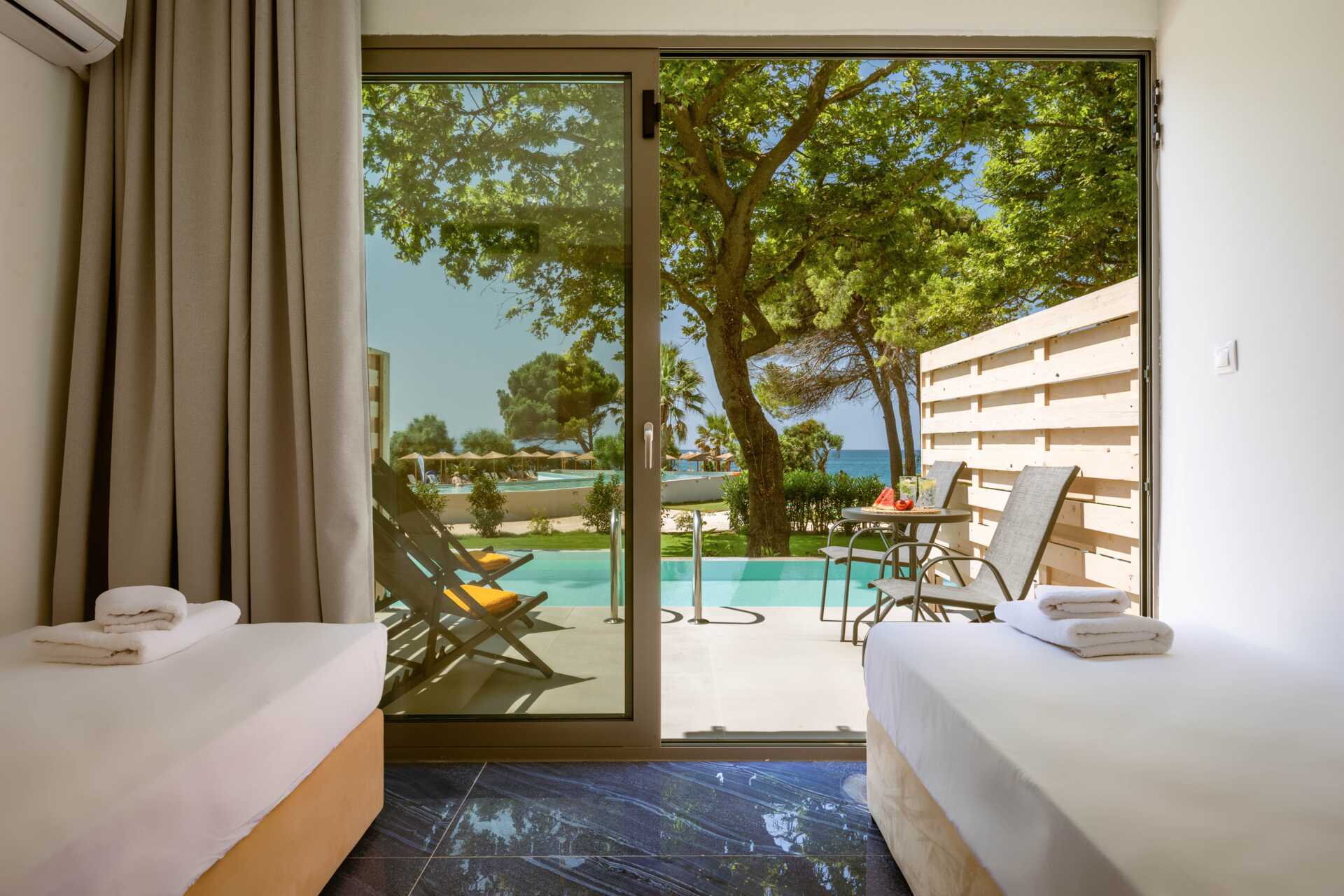 Junior-suiterne med udeplads og havudsigt samt direkte adgang til en delt pool. Der er bord og stole på terrassen. Suiterne er placeret i sidebygningerne. En dobbeltseng. Mulighed for ekstra opredning i sovesofa. Gratis wifi, aircondition og deponering. Køleskab. Nespresso-kaffemaskine. Tv med internationale kanaler. Hårtørrer. Badeværelse med bruser og toilet. Rengøring 7 gange om ugen. Børn under to år tæller med i det maksimale antal personer i lokalet.
