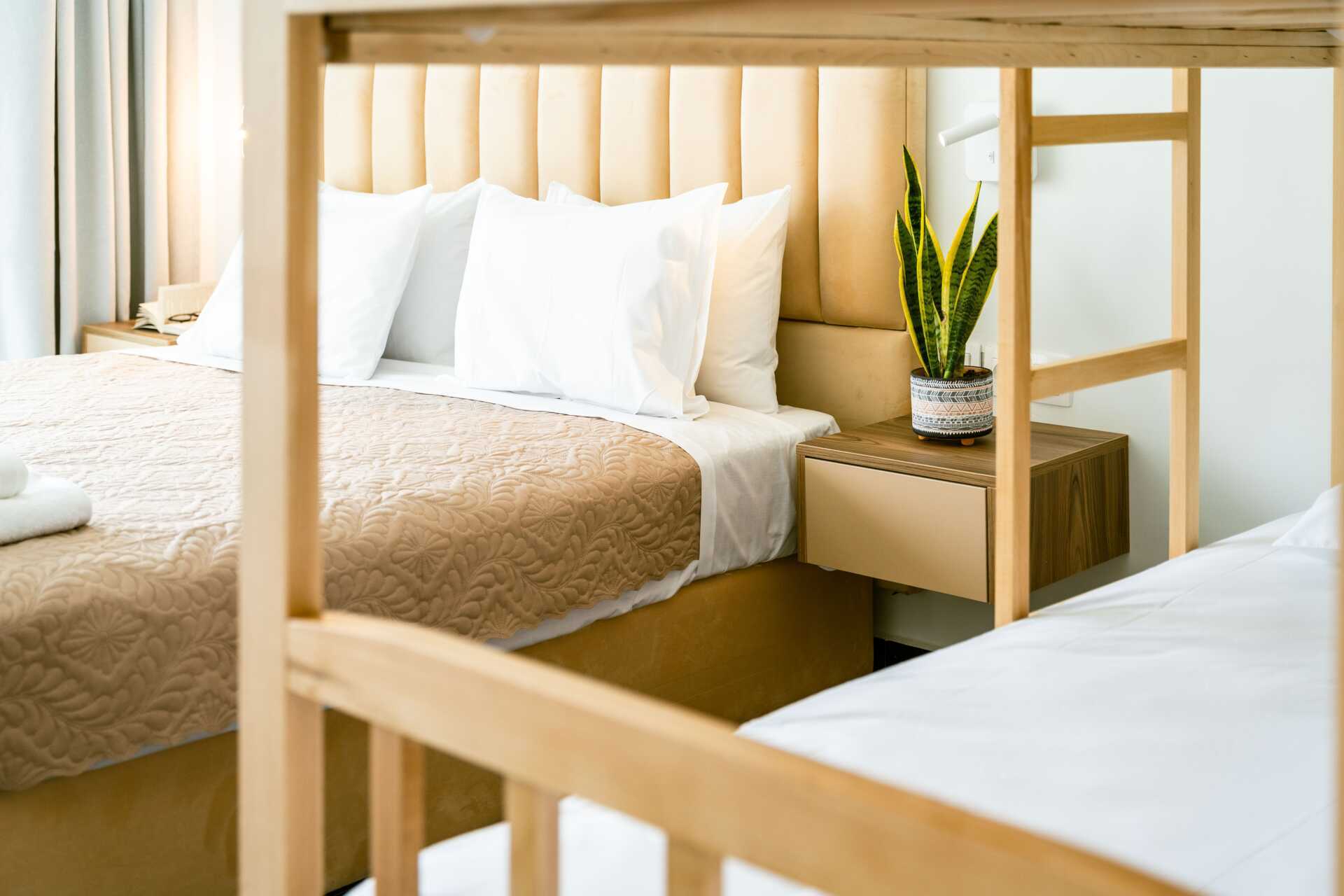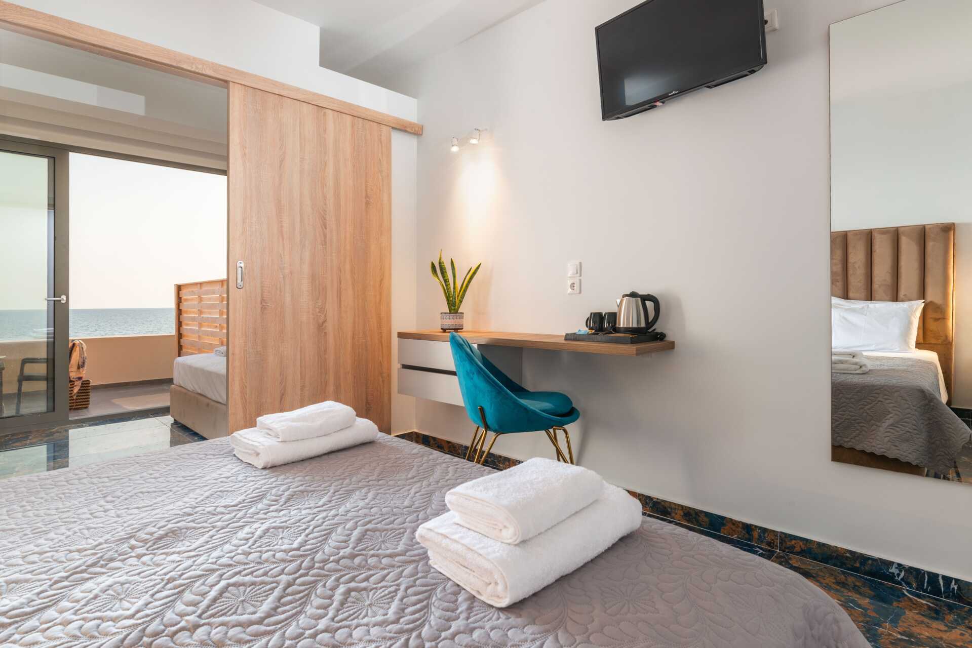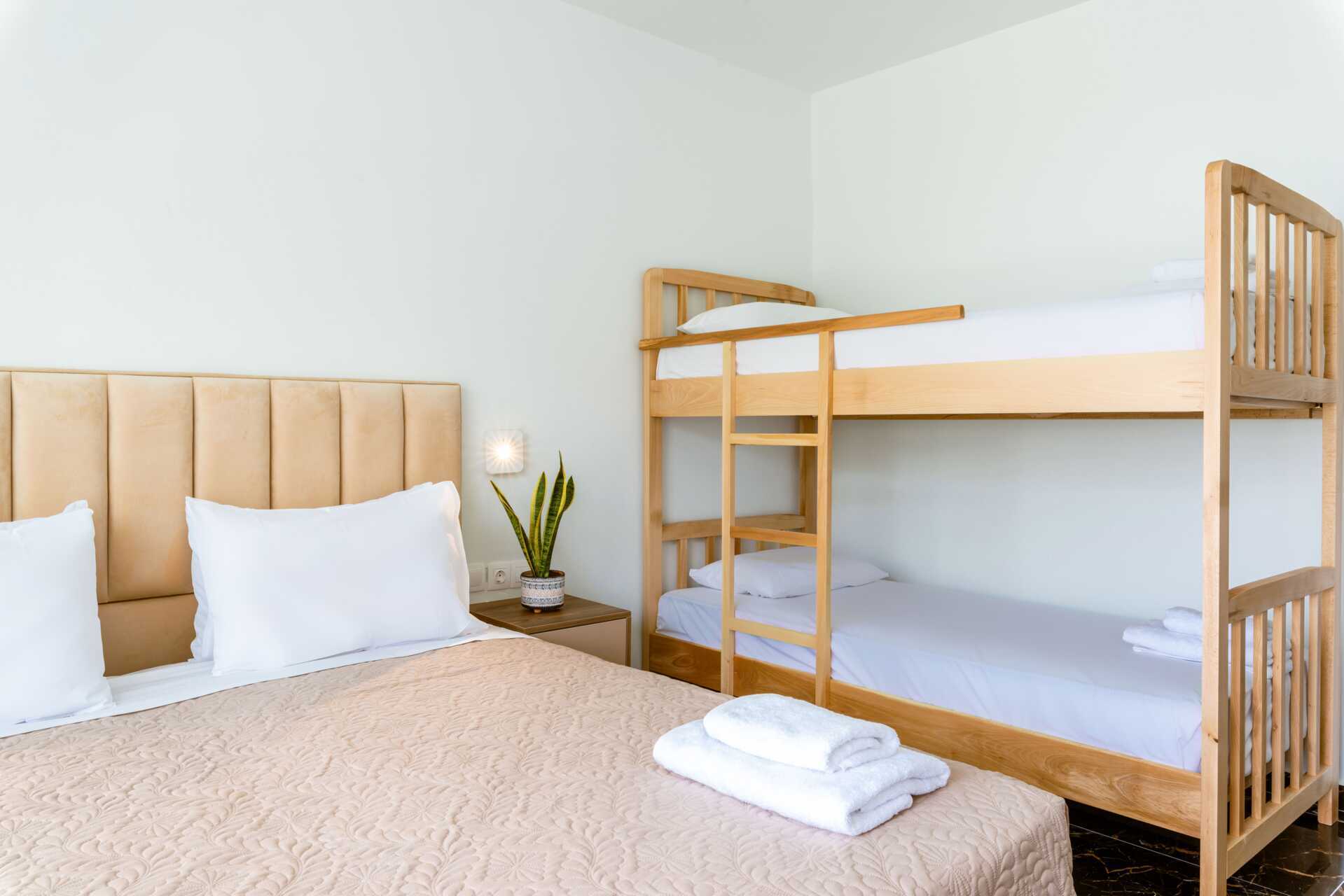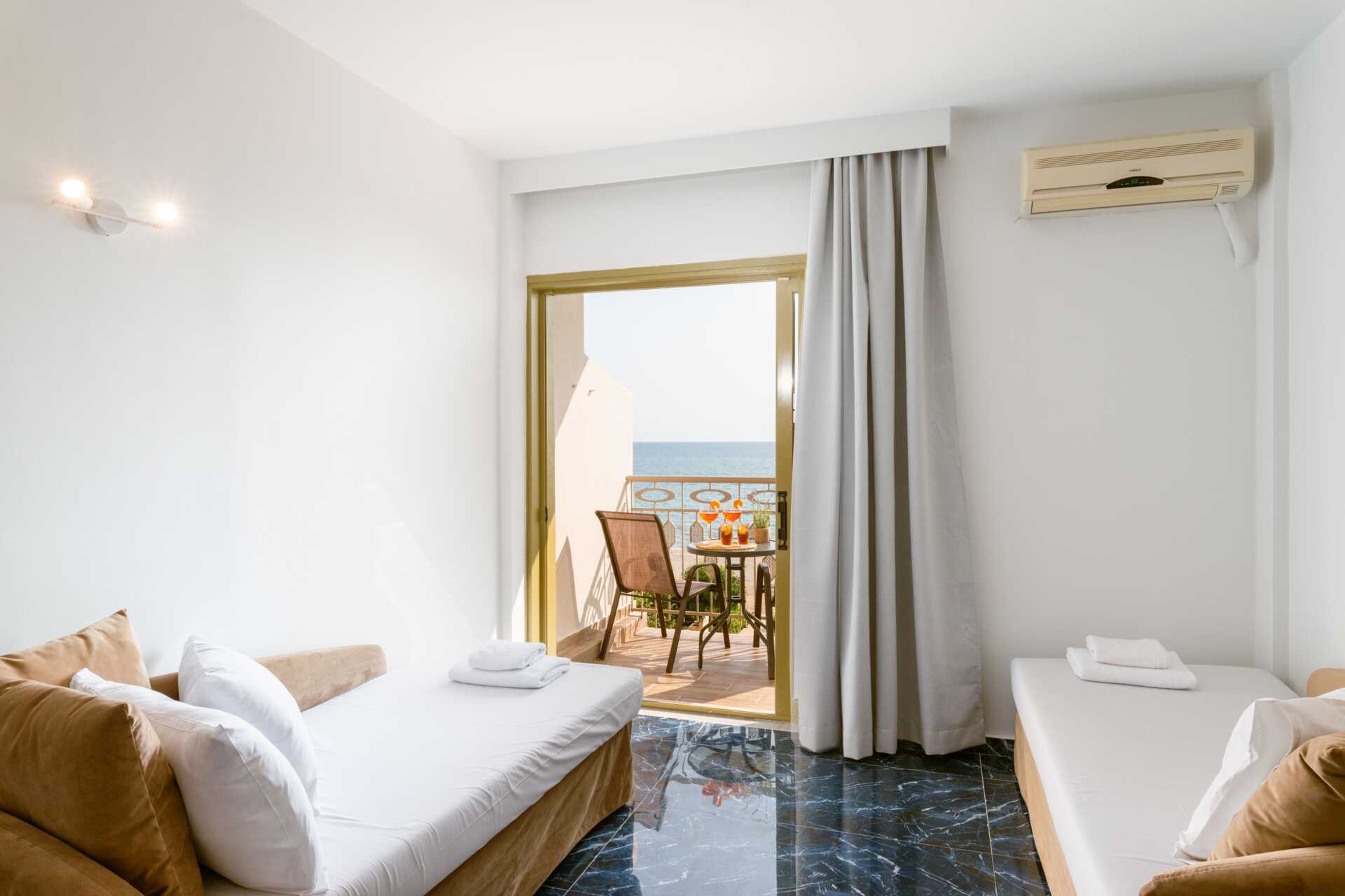 Familie-værelse med to soveværelser, udendørsområde med havudsigt og direkte adgang til delt pool. Familie-værelserne består af to soveværelser med skydedør mellem værelserne. Værelserne er placeret i sidebygningerne. Et soveværelse med en dobbeltseng eller to enkeltsenge og et soveværelse med to enkeltsenge. Gratis wifi, aircondition og deponering. Køleskab. Tv med internationale kanaler. Hårtørrer. Badeværelse med bruser og toilet. Rengøring 7 gange om ugen. Børn under to år tæller med i det maksimale antal personer på værelset.
