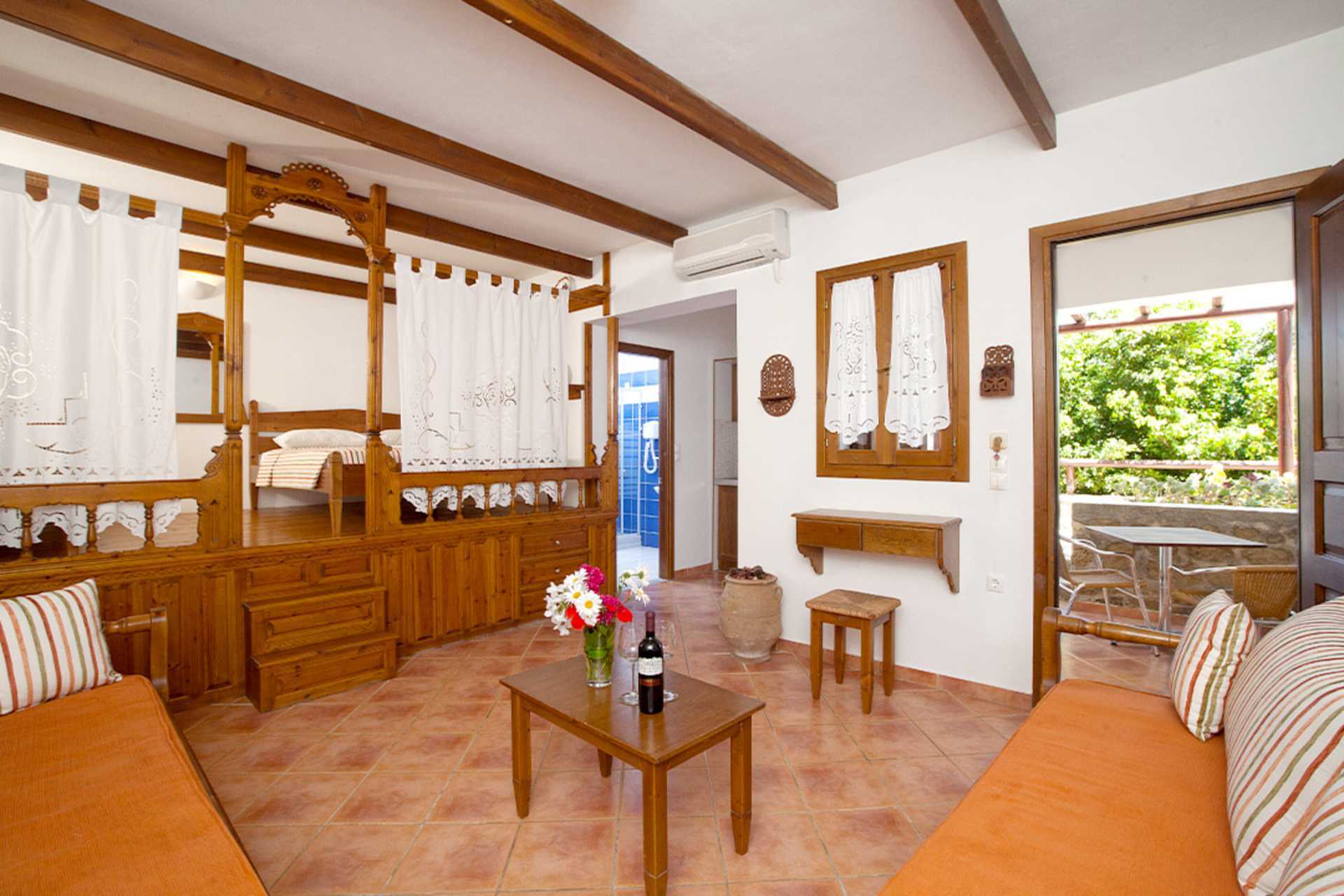Familie-værelser med balkon eller terrasse med delvis havudsigt. Værelset består af to dele i åbent plan, den ene del med opholdsrum/minikøkken og en soveværelsesdel som nås med få trappetrin. En dobbeltseng og to enkeltsenge. Mulighed for ekstra opredning i eksisterende senge. Minikøkken med køleskab, kogeplader, el-kedel samt kaffe/te og enkelt køkkenudstyr. Kaffemaskine, fire kapsler indgår, du kan købe flere i hotelbaren. Gratis wifi, deponering og aircondition. Tv med internationale kanaler. Hårtørrer. Badeværelse med bruser og toilet. Rengøring 6 gange om ugen.