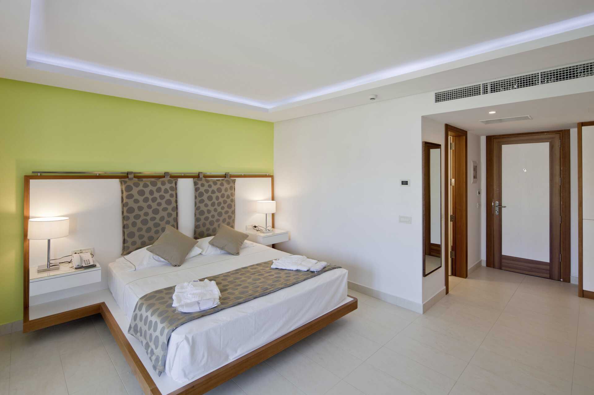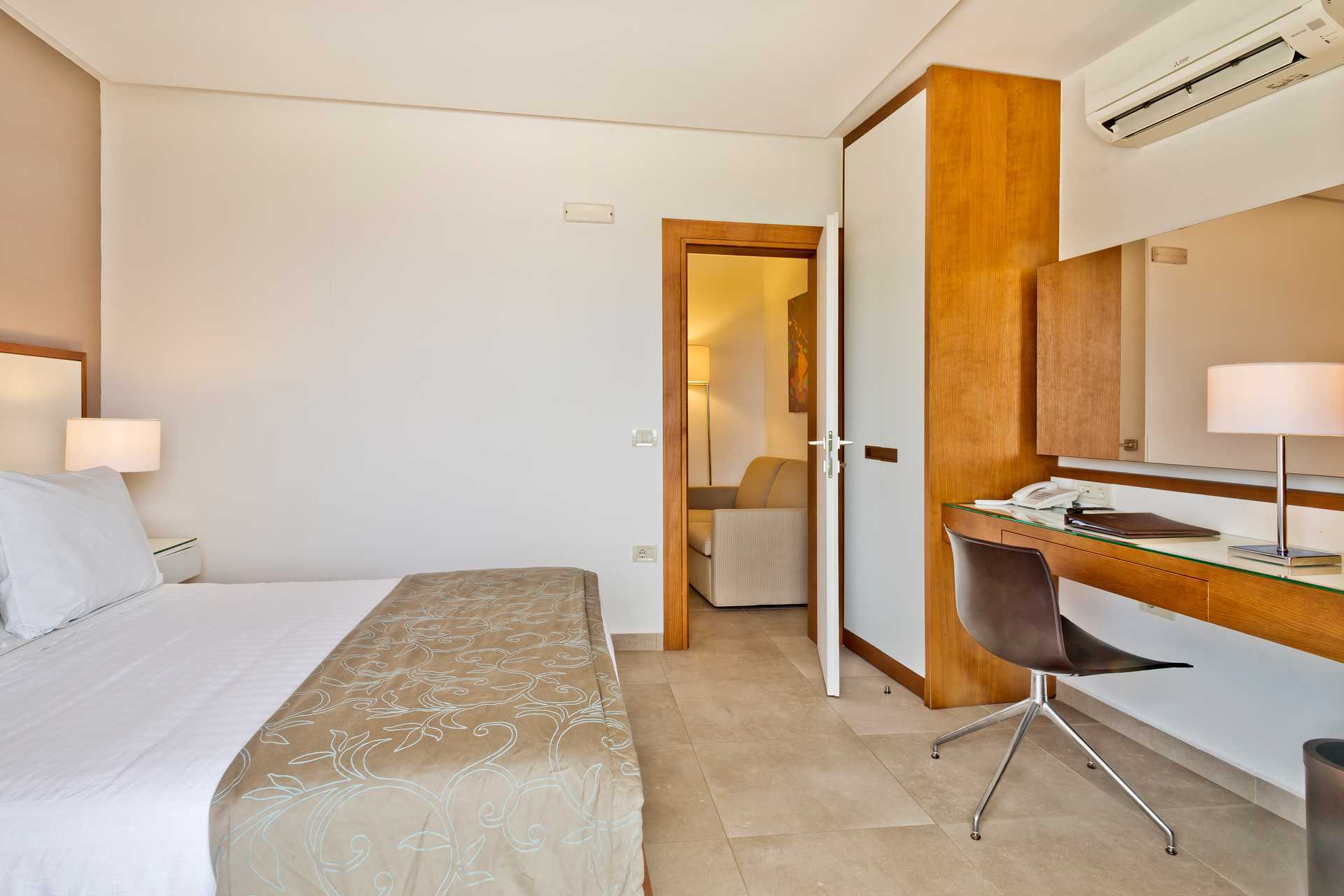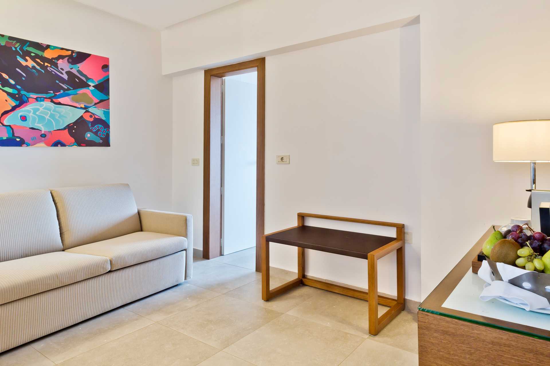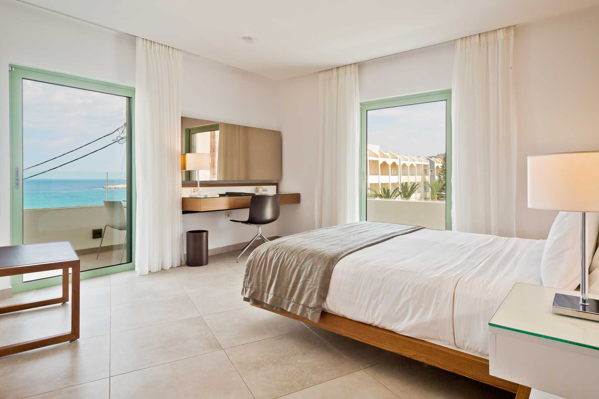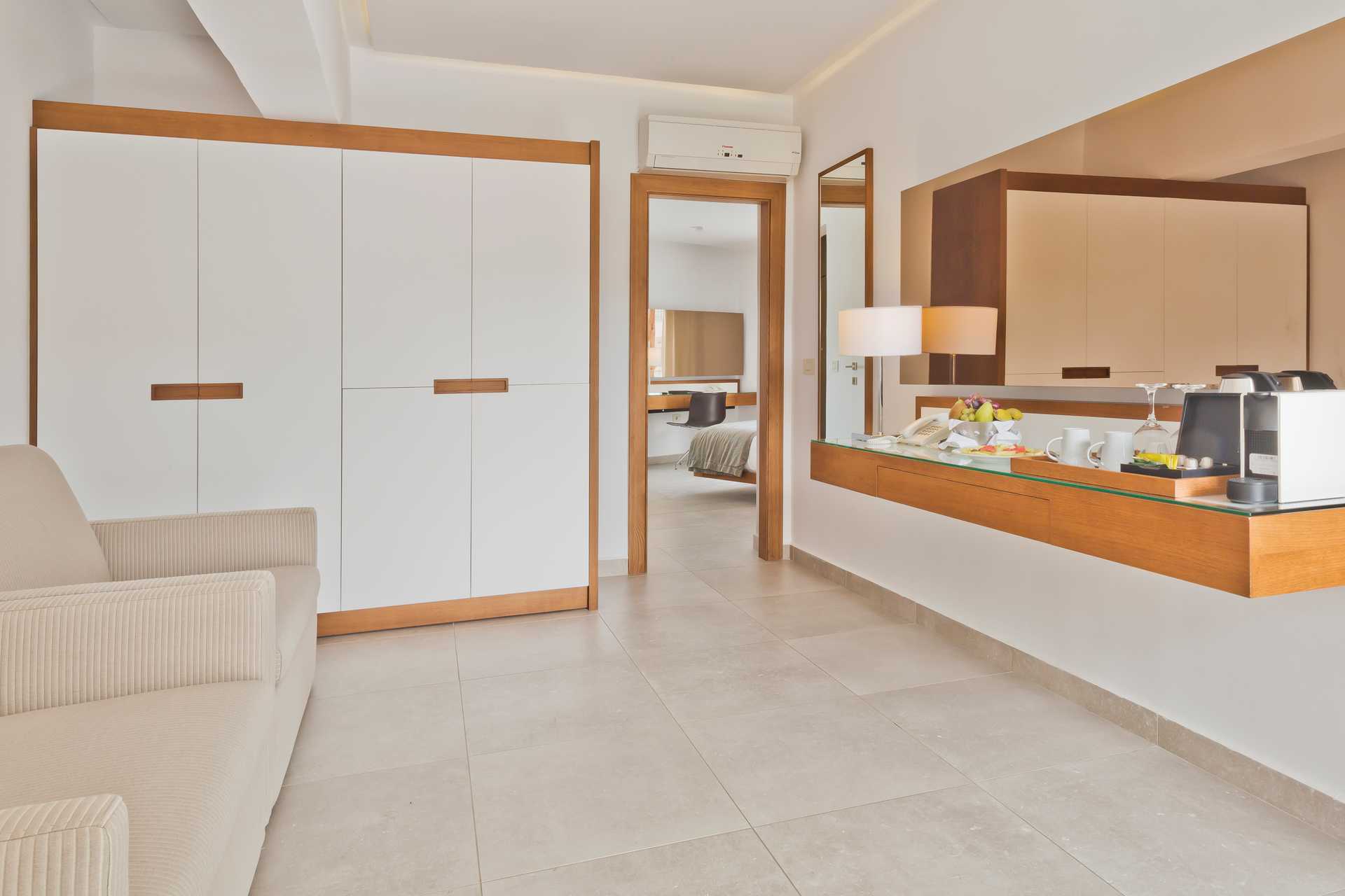 Junior-suiter med balkon eller terrasse og delvis havudsigt. Junior-suiterne ligger i en sidebygning på hotellet. Alle hotellets faciliteter er i hovedbygningen, ca. 150 meter væk. Ekstra senge kan tilføjes i slå ud lænestole eller i en sovesofa i opholdsrummet. Når ekstrasengene bruges, kan rummet opleves som trangt. Gratis wifi, aircondition og deponering. Køleskab. El-kedel samt kaffe/te. Tv med internationale kanaler. Badekåber og tøfler. Hårtørrer. Badeværelse med bruser og toilet i åben planløsning til værelset. Der er dør til toilettet. Rengøring 7 gange om ugen.