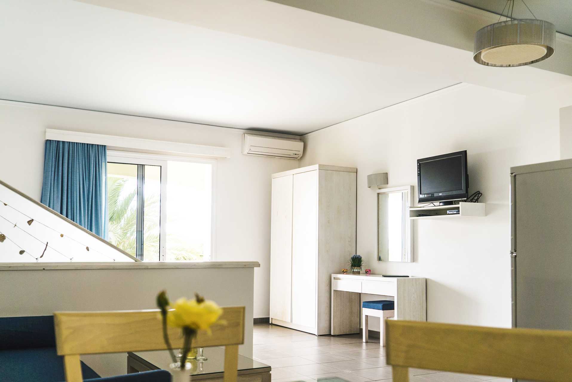 2-værelses lejlighed med terrasse i stueplan. Soveværelse og kombineret opholdsrum med minikøkken. To enkeltsenge. Mulighed for ekstra opredning i sovesofa. Minikøkken med ovn, komfur, køleskab, kaffemaskine, el-kedel, saftpresser, brødrister, sandwichgrill, elpisker og enkelt køkkenudstyr. Gratis aircondition og deponering. Strygejern og strygebræt. Tv med internationale kanaler. Hårtørrer. Badeværelse med bruser og toilet. Rengøring 6 gange om ugen. 2-værelses lejlighederne har små vinduer, der sidder lidt højt på væggen, og nogle 2-værelses lejligheder har en almindelig dør (ikke glas) ud til terrassen.