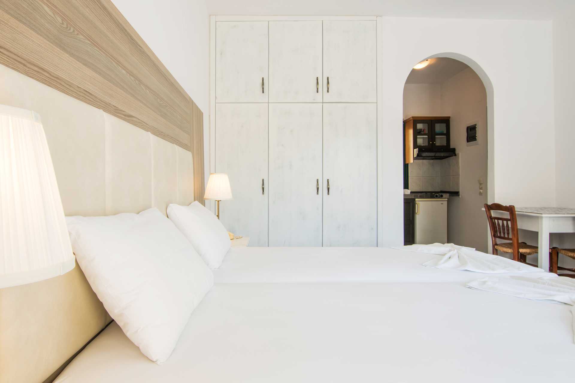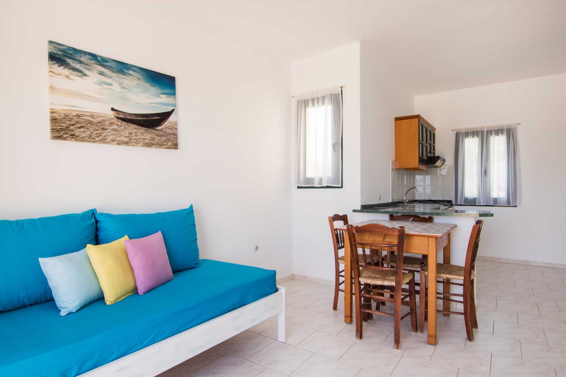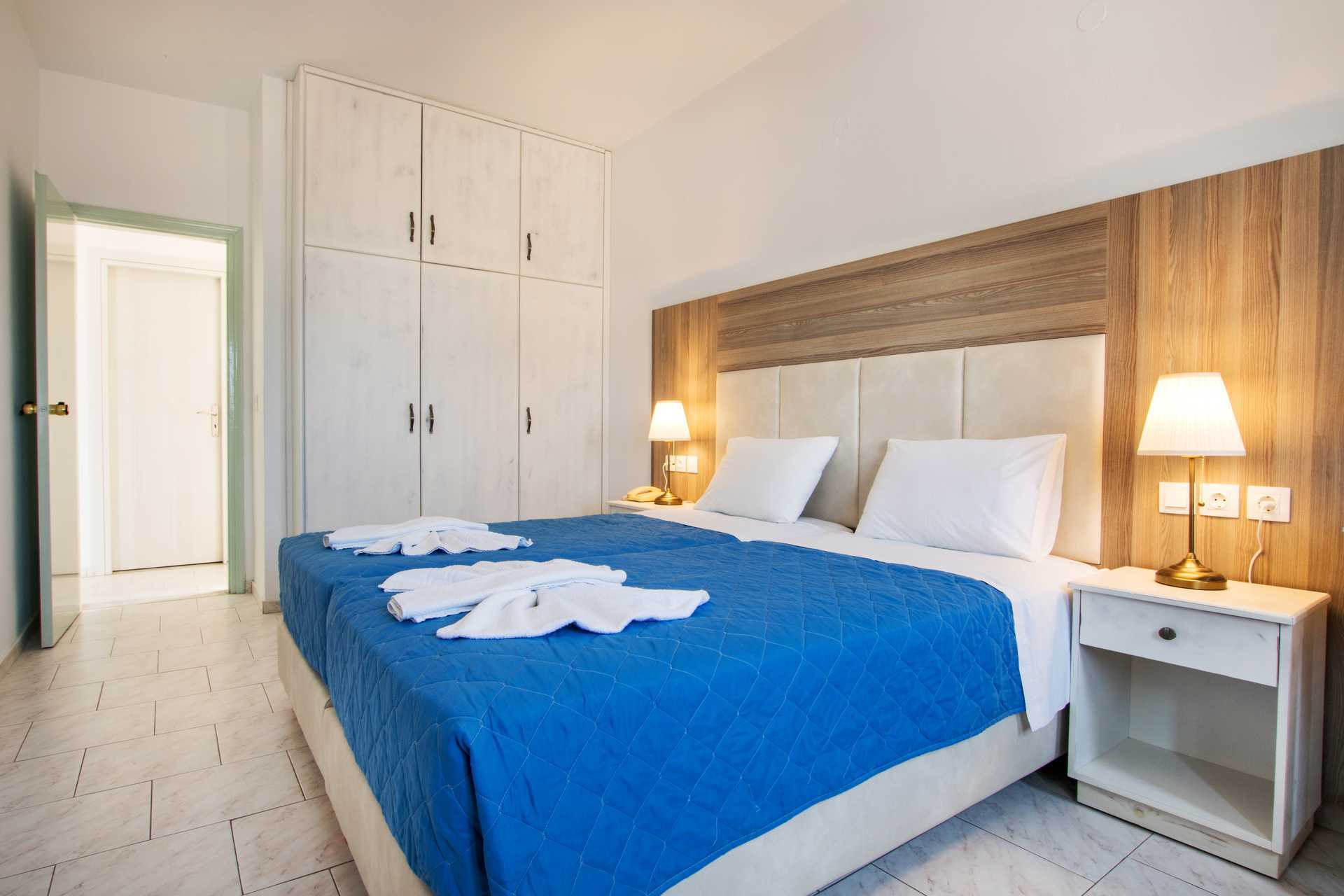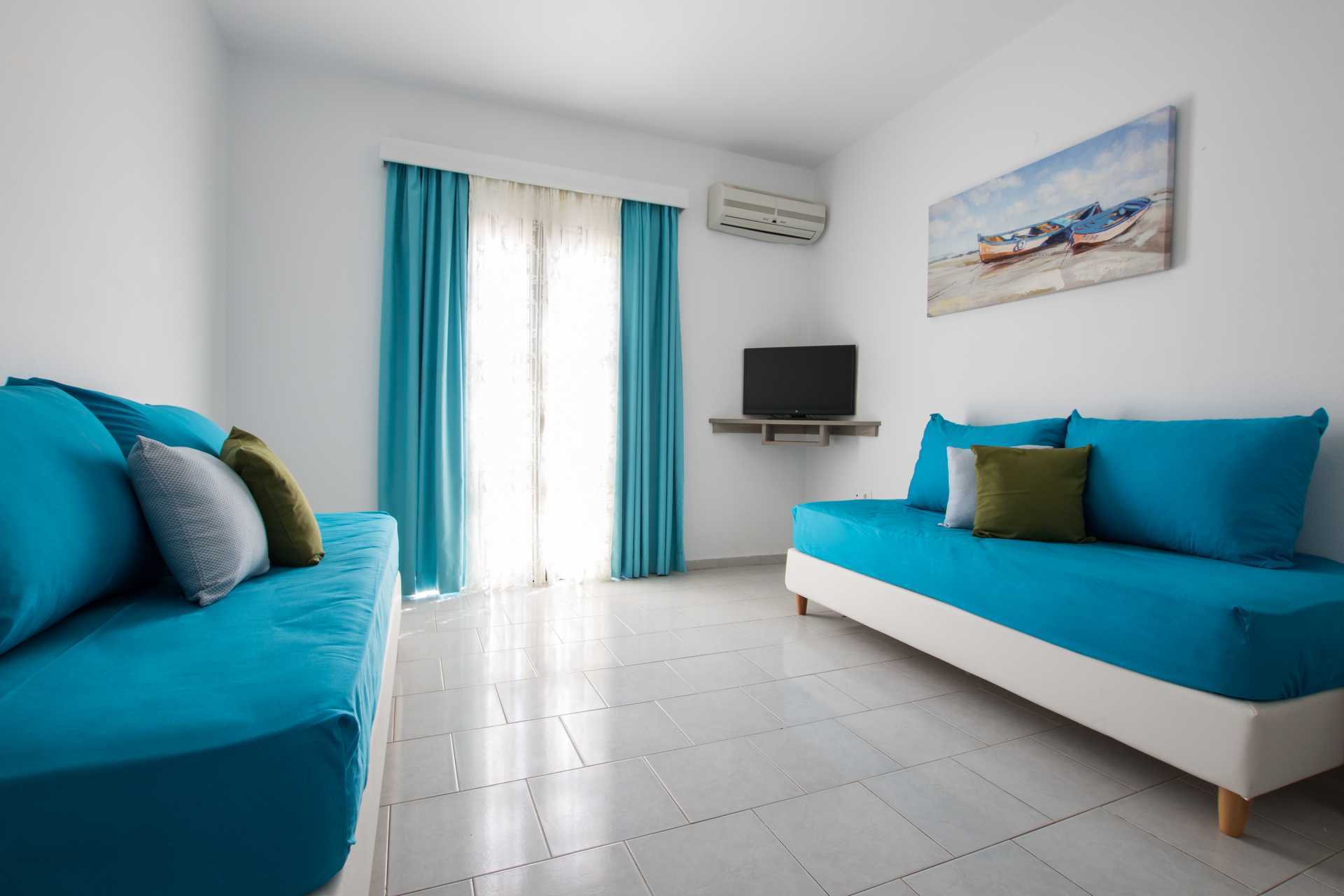 To-værelses lejligheder med balkon og havudsigt eller med terrasse. Soveværelse og kombineret opholdsrum med minikøkken. To enkeltsenge. Mulighed for ekstra opredning i sovesofa eller i enkeltseng. Minikøkken med køleskab, fryser, kogeplader, el-kedel og enkelt køkkenudstyr. Gratis wifi. Deponering og aircondition mod betaling. Badeværelse med bruser og toilet. Rengøring 6 gange om ugen.
