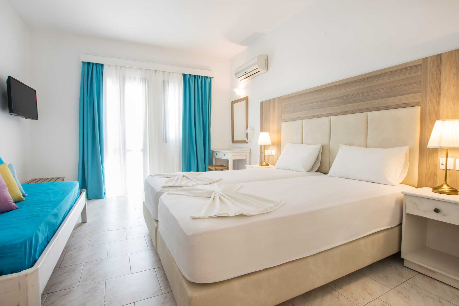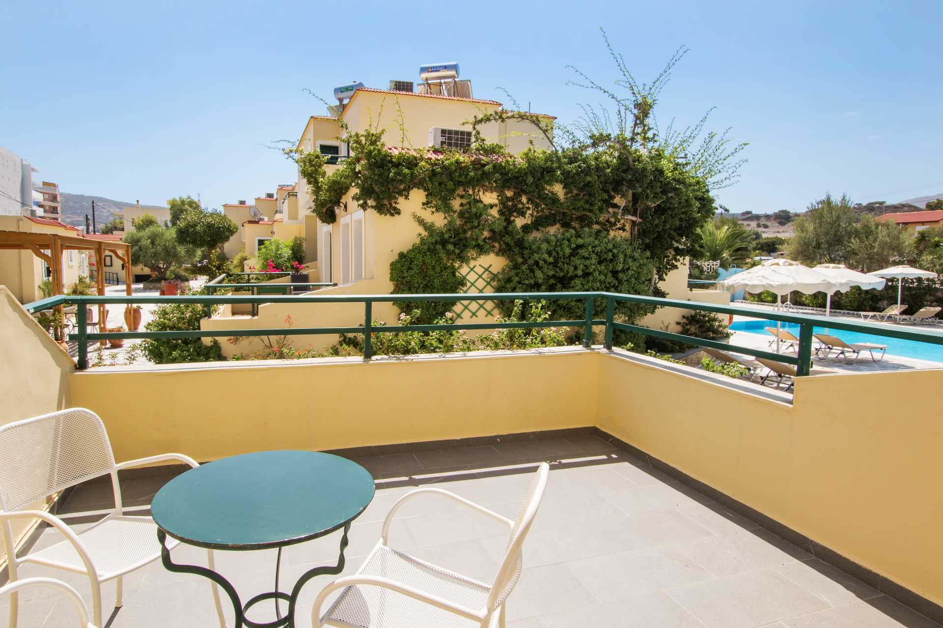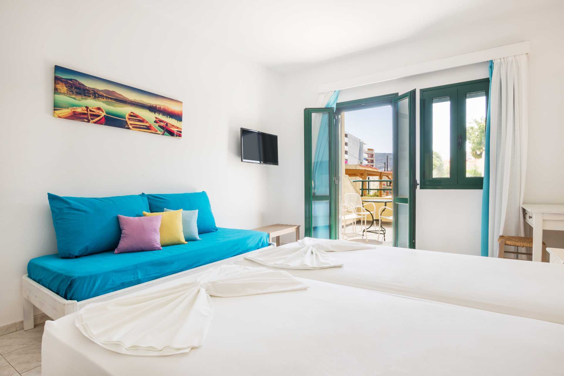 To-værelses lejligheder med balkon og havudsigt eller med terrasse. Soveværelse og kombineret opholdsrum med minikøkken. To enkeltsenge. Mulighed for ekstra opredning i sovesofa eller i enkeltseng. Minikøkken med køleskab, fryser, kogeplader, el-kedel og enkelt køkkenudstyr. Gratis wifi. Deponering og aircondition mod betaling. Badeværelse med bruser og toilet. Rengøring 6 gange om ugen.