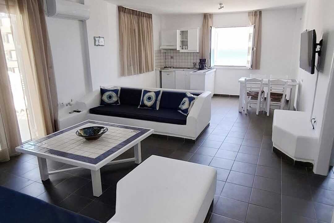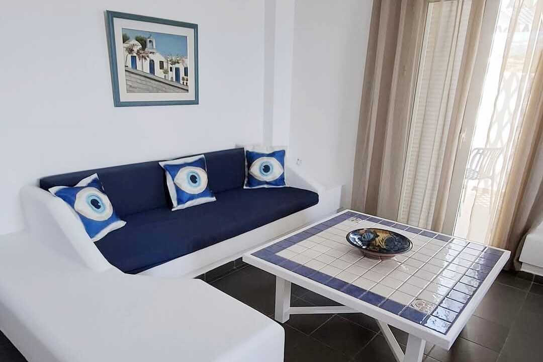 2-værelses lejlighed med balkon af varierende størrelse, nogle med delvis havudsigt. Et soveværelse og et kombineret opholdsrum med minikøkken. En dobbeltseng. Mulighed for ekstra opredning i sovesofa eller fold ud-seng. Minikøkken med kogeplader, køleskab, el-kedel, kaffemaskine og enkelt køkkenudstyr. Gratis wifi, aircondition og deponering. Tv med lokale kanaler. Hårtørrer. Badeværelse med bruser og toilet. Rengøring 6 gange om ugen.