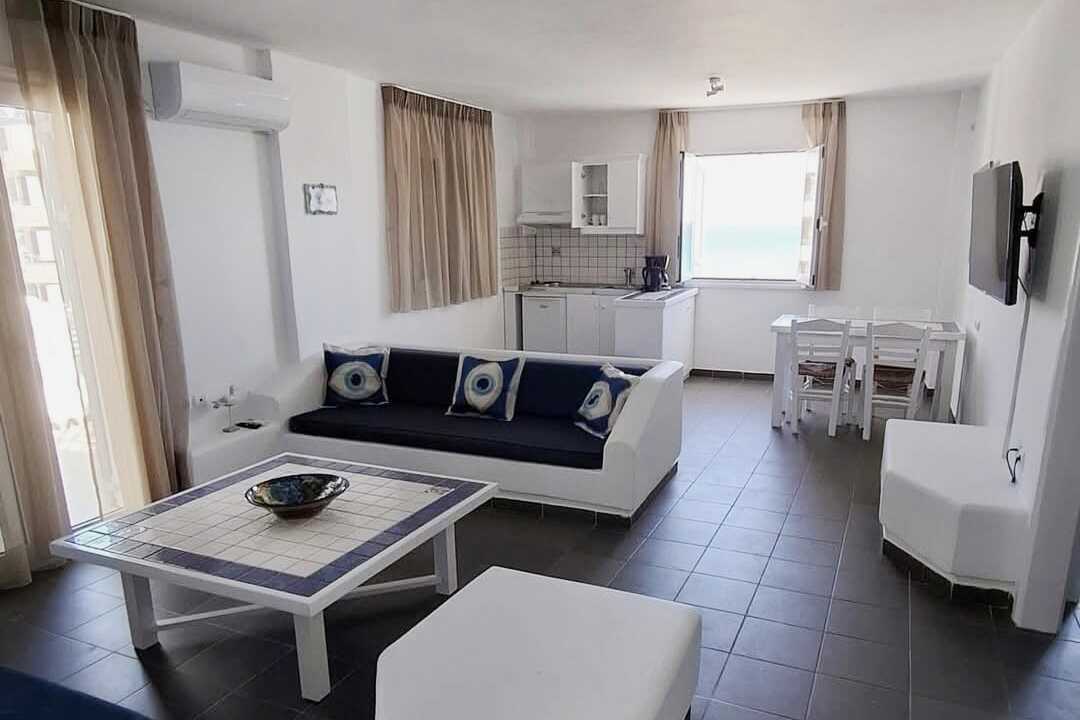 1-værelses lejlighed med balkoner af varierende størrelse, nogle med delvis havudsigt. Kombineret soveværelse og minikøkken. En dobbeltseng. Minikøkken med kogeplader, køleskab, el-kedel, kaffemaskine og enkelt køkkenudstyr samt et lille opholdsområde. Gratis wifi, aircondition og deponering. Tv med lokale kanaler. Hårtørrer. Badeværelse med bruser og toilet. Rengøring 6 gange om ugen.