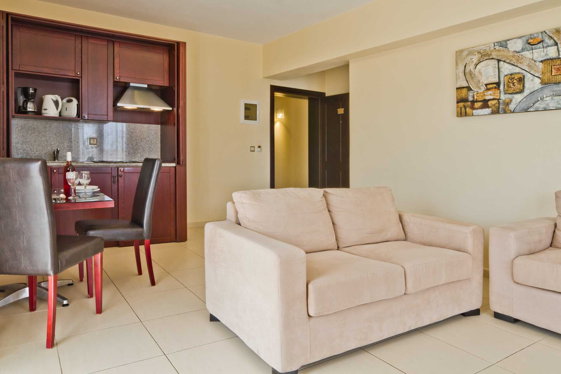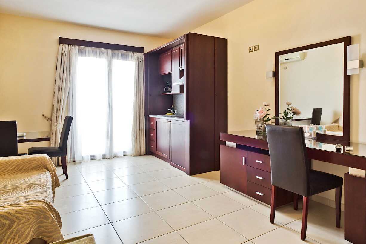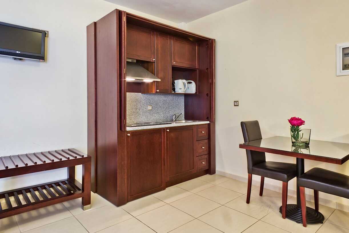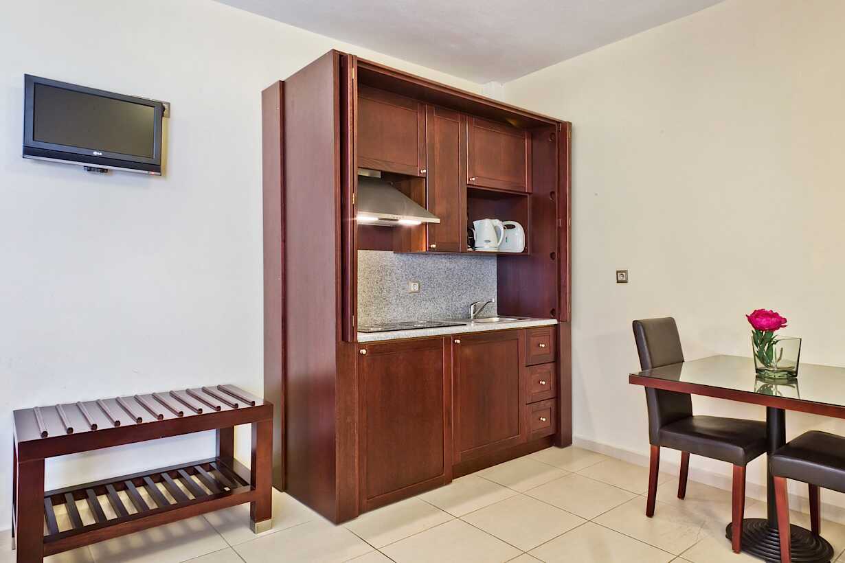 1-værelses lejligheder med balkon. Soveværelse kombineret med minikøkken. En dobbeltseng eller to enkeltsenge. Mulighed for ekstra opredning i sovesofa. Minikøkken med kogeplader, køleskab, sandwichgrill, kaffemaskine, el-kedel og enkelt køkkenudstyr. Gratis wifi, aircondition og deponering. Tv med internationale kanaler. Hårtørrer og tøfler. Badeværelse med badekar eller bruser samt toilet. Rengøring 6 gange om ugen.