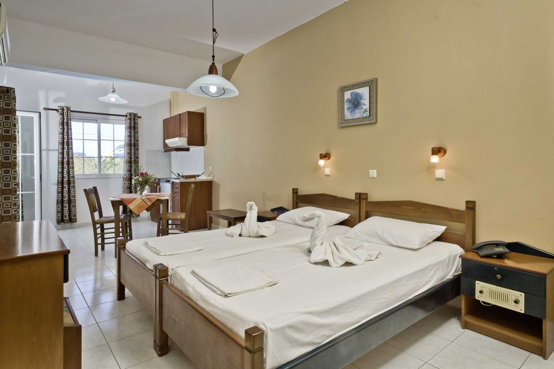 Mindre 2-værelses lejlighed med terrasse i stueplan. Lejlighederne ligger ved siden af hotellets indgang. Soveværelse og kombineret opholdsrum/minikøkken. En dobbeltseng. Mulighed for ekstra opredninger i sovesofa. Minikøkken med kogeplader, køleskab, el-kedel, sandwichgrill og enkelt køkkenudstyr. Gratis wifi. Aircondition mod betaling. Tv med lokale kanaler. Badeværelse med bruser og toilet. Rengøring 6 gange om ugen.