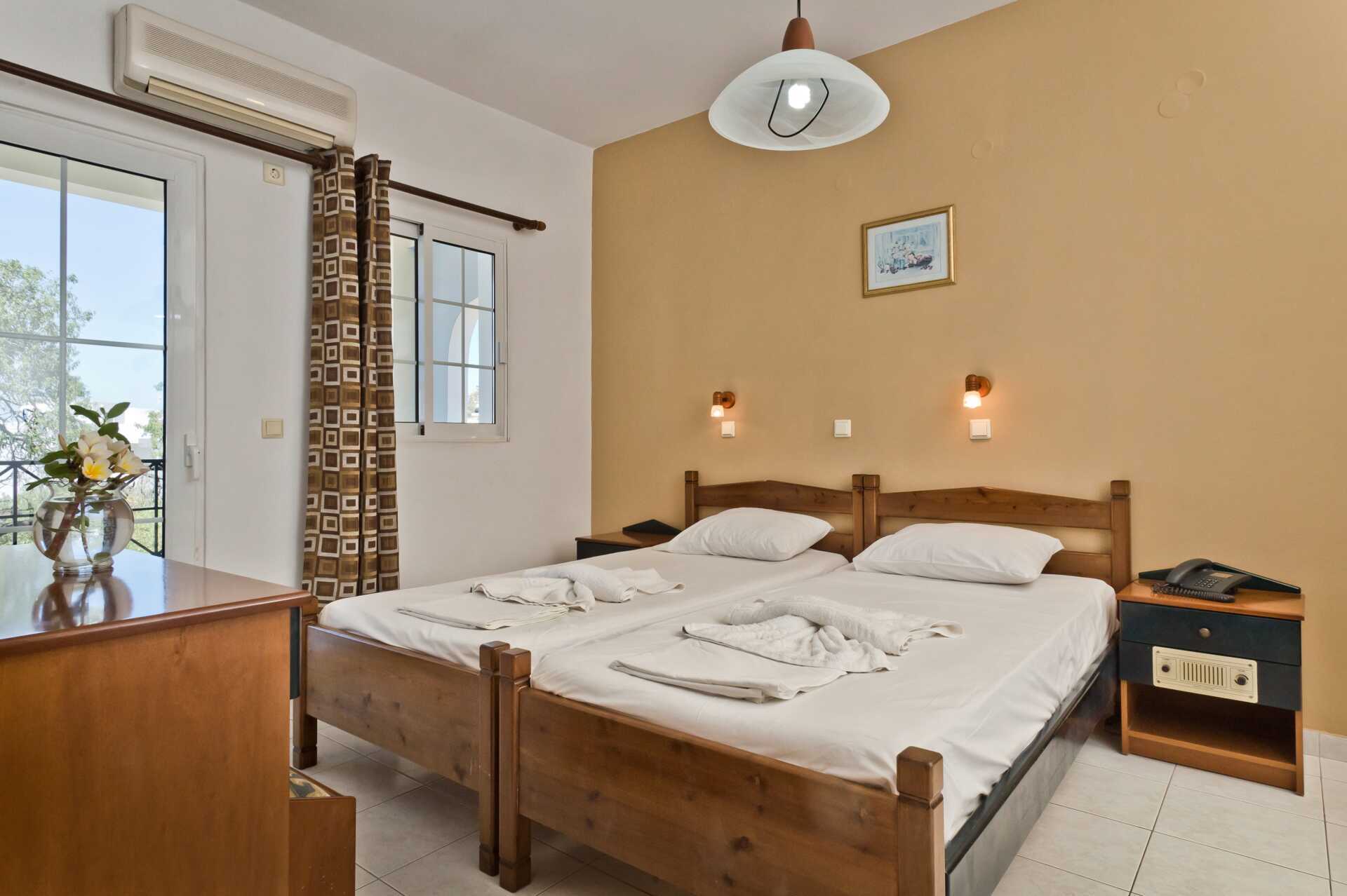 1-værelses lejlighed med balkon i stueplan og pooludsigt, alternativt ingen udeplads. Lejlighederne til op til tre personer har ingen udeplads. Soveværelse kombineret med minikøkken. To enkeltsenge. Mulighed for ekstra opredning i sovesofa eller fold ud-seng. Minikøkken med kogeplader, køleskab, el-kedel, sandwichgrill og enkelt køkkenudstyr. Gratis wifi. Aircondition mod betaling. Badeværelse med bruser og toilet. Rengøring 6 gange om ugen.
