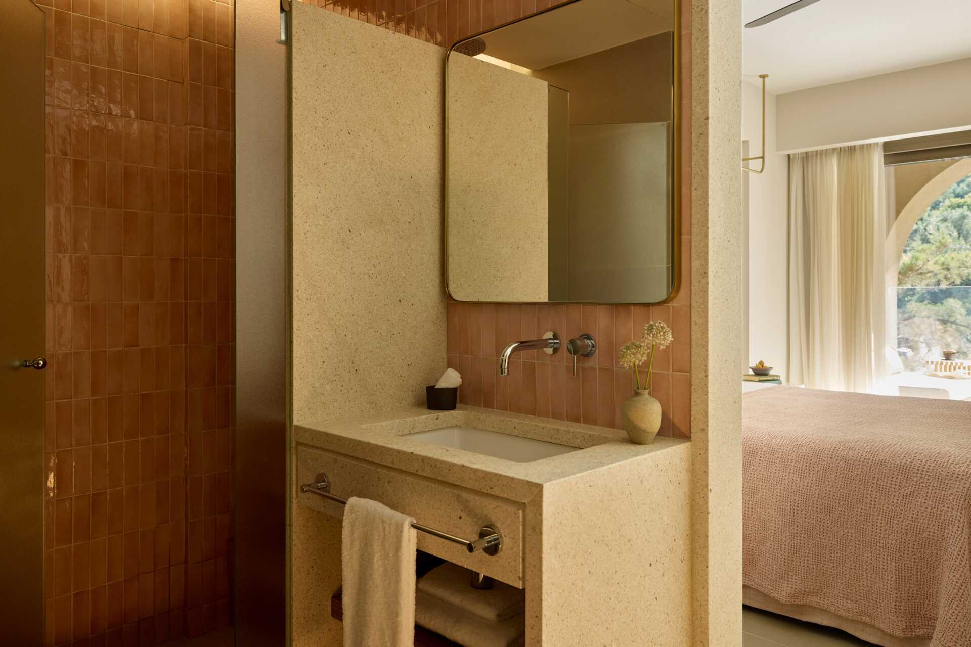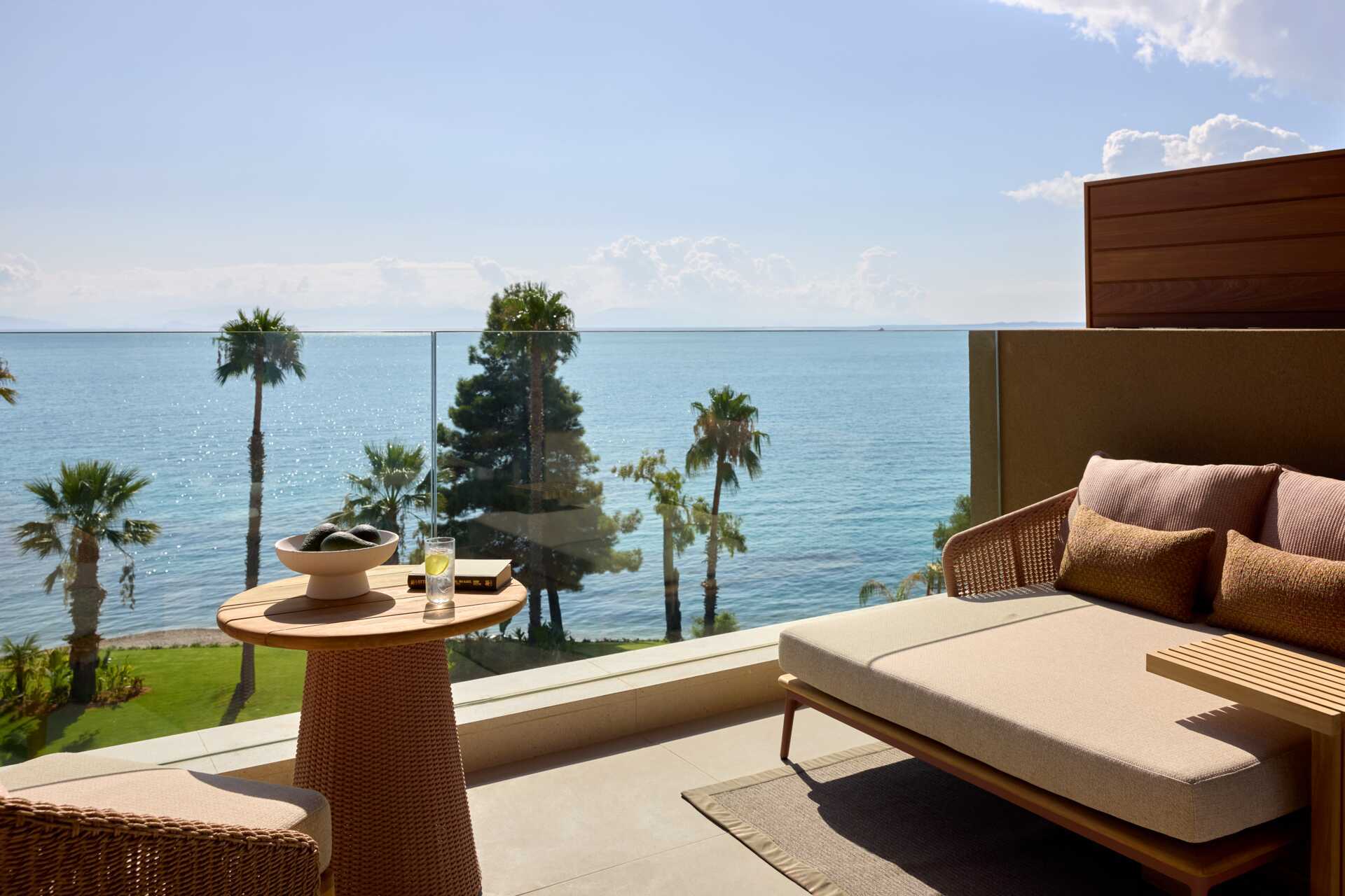 Dobbeltværelse med terrasse i stueetagen med privat infinity-pool og havudsigt. Trappe op til børnepoolen. En dobbeltseng eller to enkeltsenge. Gratis wifi, aircondition og deponering. Minibar mod betaling. El-kedel og kaffe/te. Nespresso kaffemaskine - kapsler medfølger. Tv med internationale kanaler. Badekåber. Hårtørrer. Badeværelse med bruser og toilet. Rengøring 7 gange om ugen.