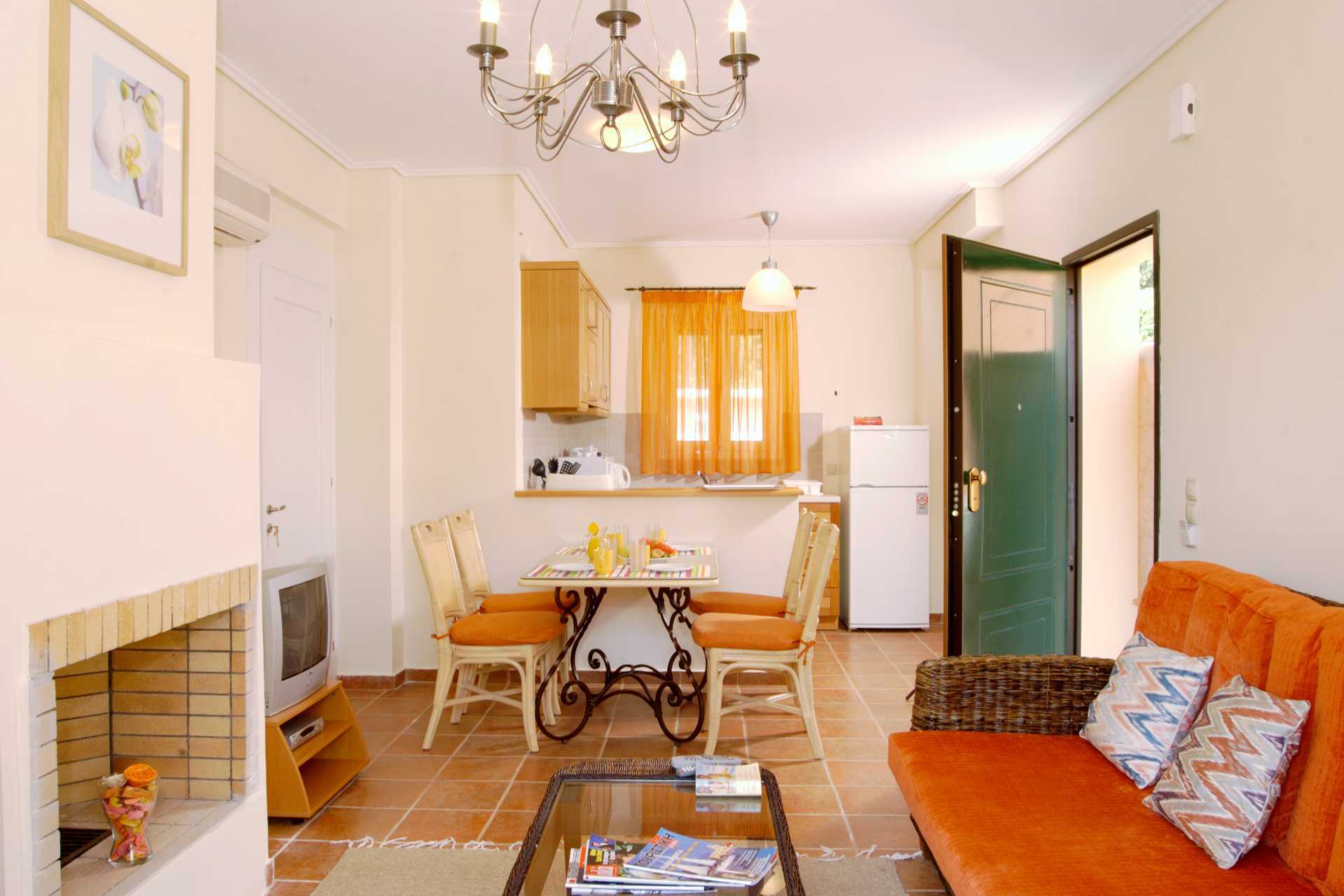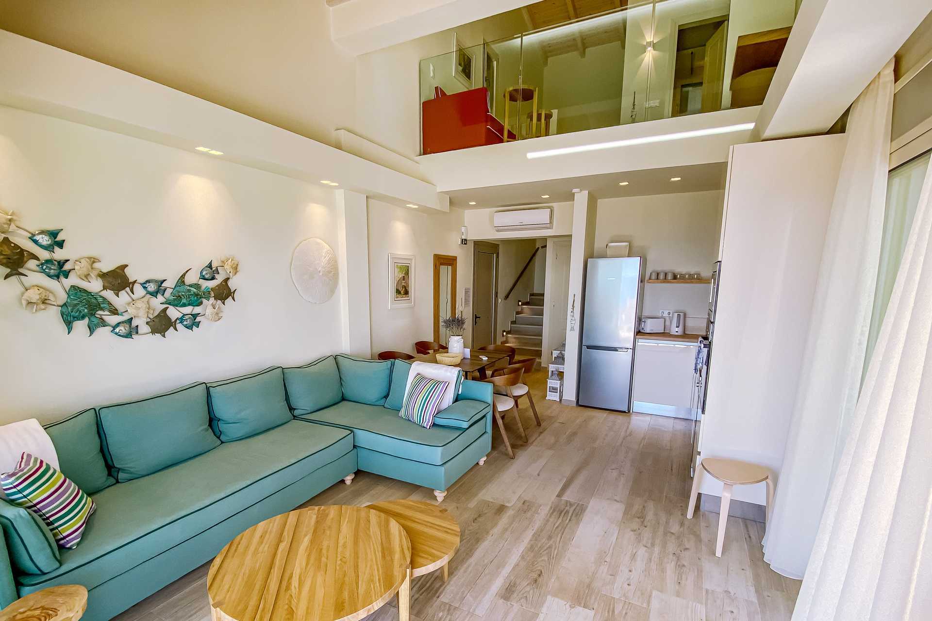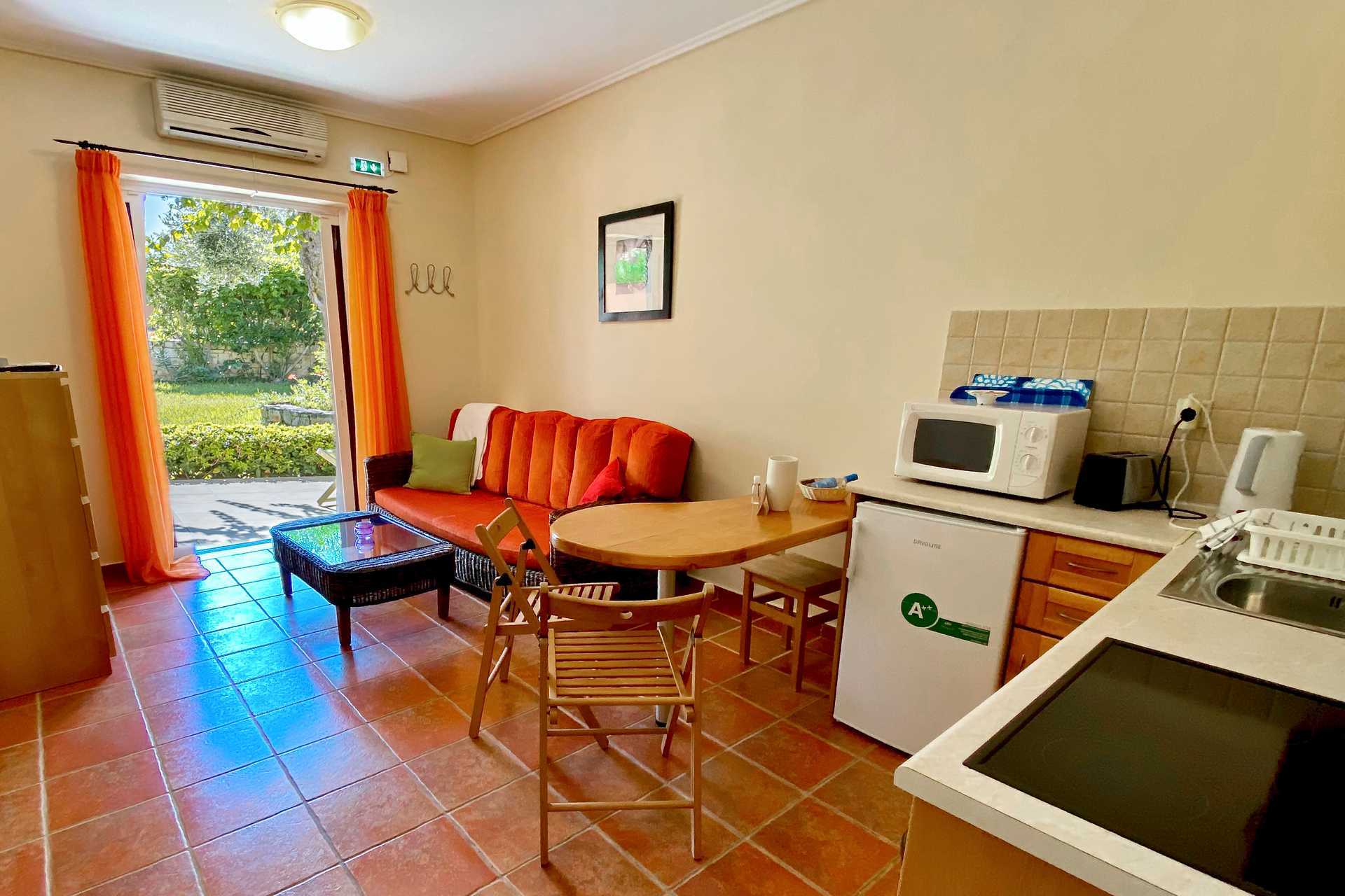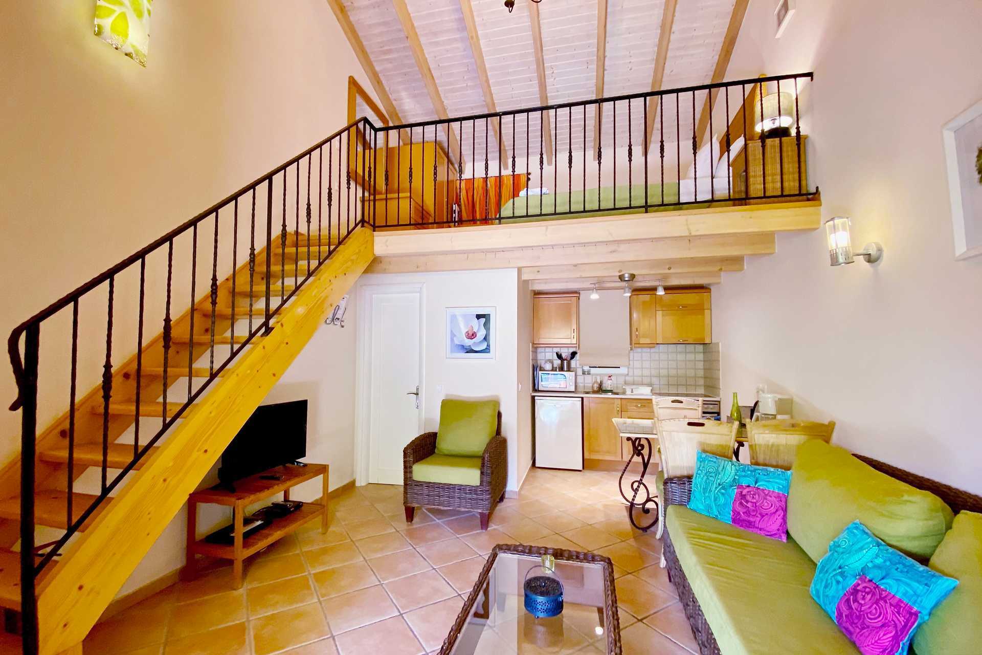 1-værelses lejligheder i etage med terrasse. I stueetagen er der en kombineret opholdsrum med et minikøkken og et badeværelse. Ovenpå er der en hems med en dobbeltseng. Mulighed for ekstra opredning i sovesofaen i opholdsrummet. Minikøkken med kogeplader og ovn, mikrobølgeovn, køleskab, kaffemaskine, el-kedel, brødrister og enkelt køkkenudstyr. Gratis wifi, aircondition og deponering. Tv med lokale kanaler. Hårtørrer. Badeværelse med bruser og toilet. Rengøring 2 gange om ugen.