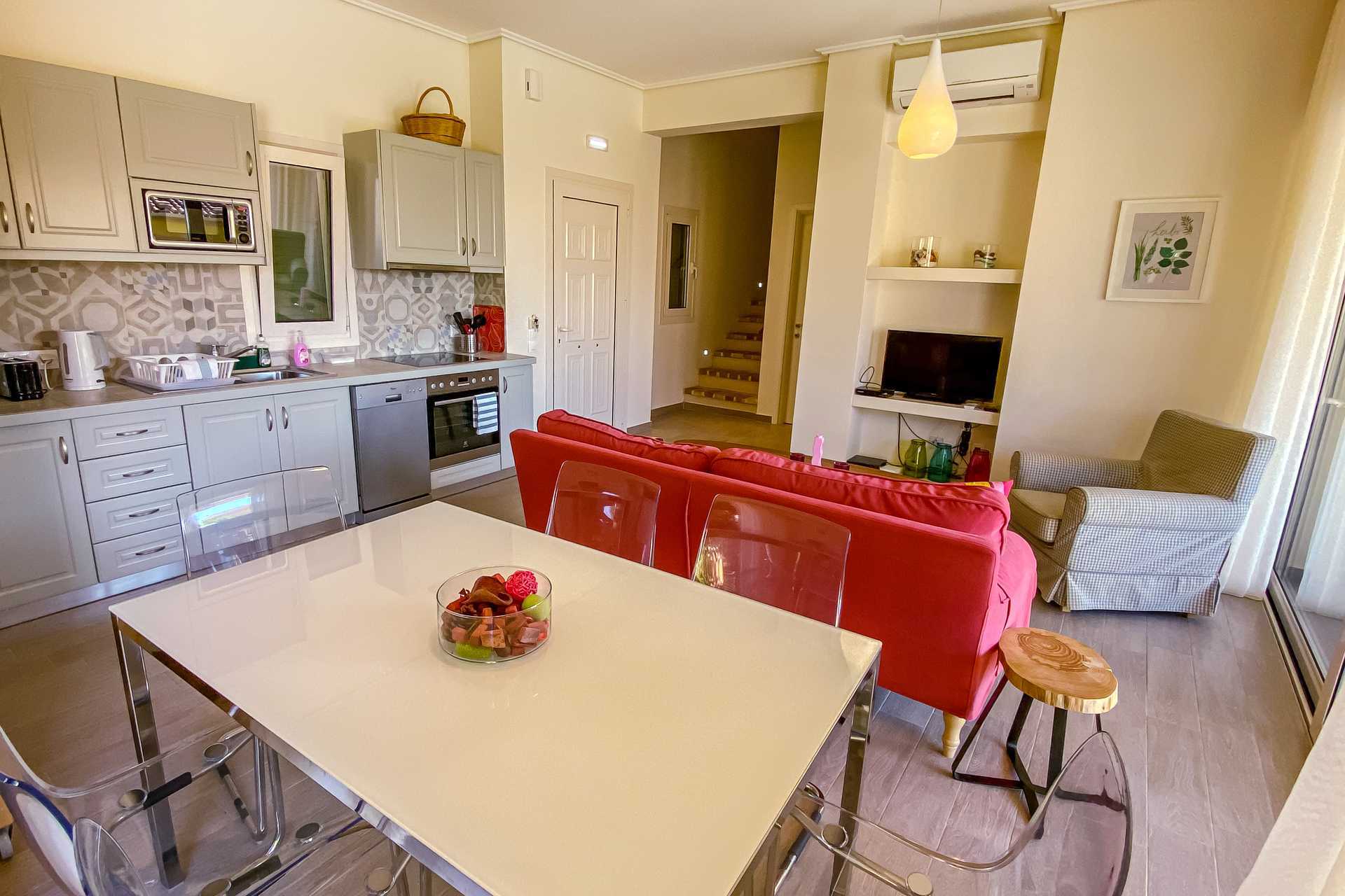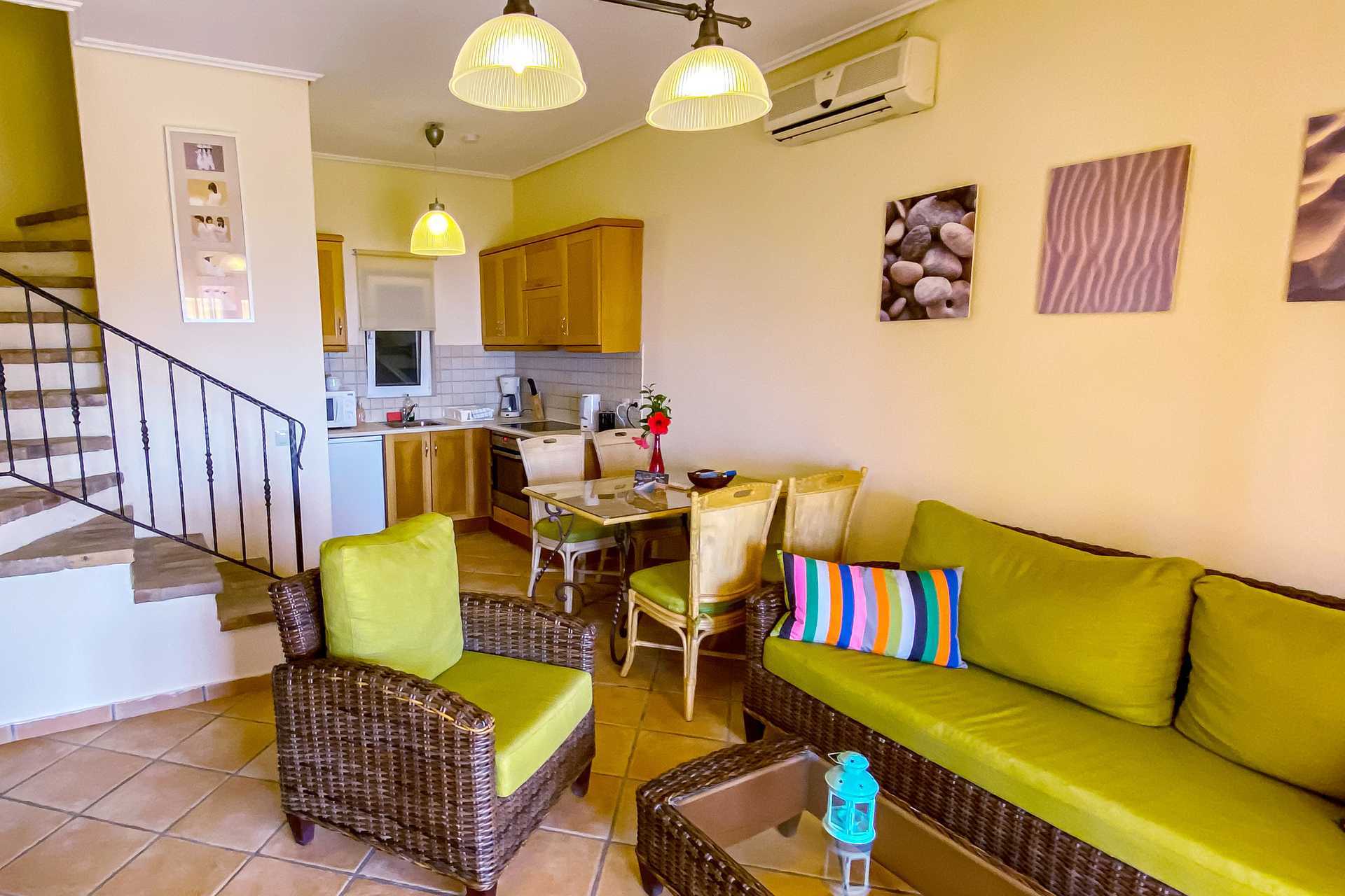 2-værelses lejligheder i etage med en terrasse i stueplan og en privat pool. Terrassen har borde og stole og solstole. I stueetagen er der et kombineret opholdsrum med et minikøkken og et separat toilet og mulighed for en ekstra opredning i en sovesofa og en foldeseng. Ovenpå er der et soveværelse med en dobbeltseng, en balkon og et badeværelse med bruser og toilet. Minikøkken med kogeplader og ovn, mikroovn, køleskab, kaffemaskine, el-kedel, brødrister, enkelt køkkenudstyr og opvaskemaskine. Gratis wifi, aircondition og deponering. Vaskemaskine. Tv med lokale kanaler. Hårtørrer. Rengøring 2 gange om ugen.