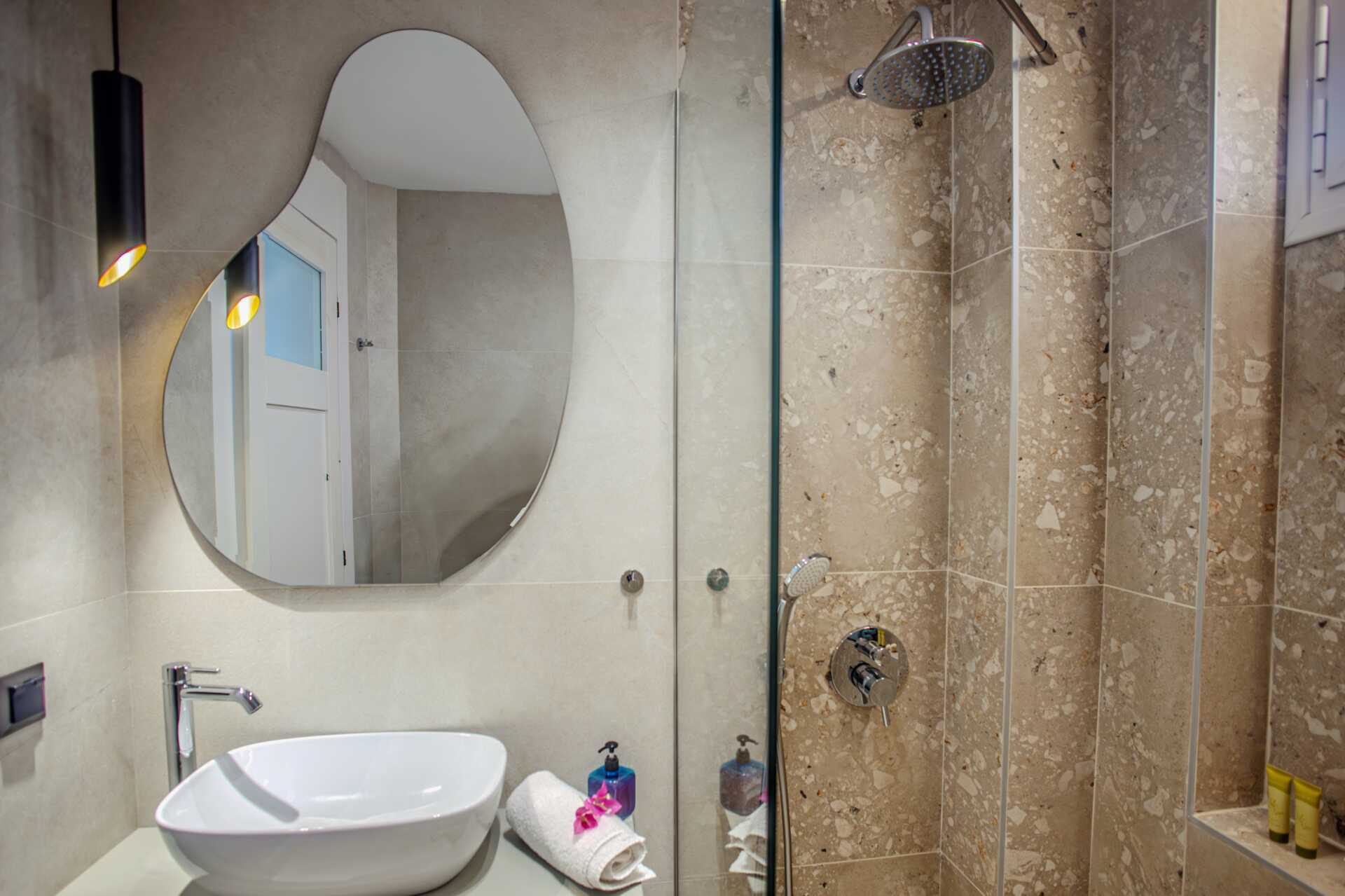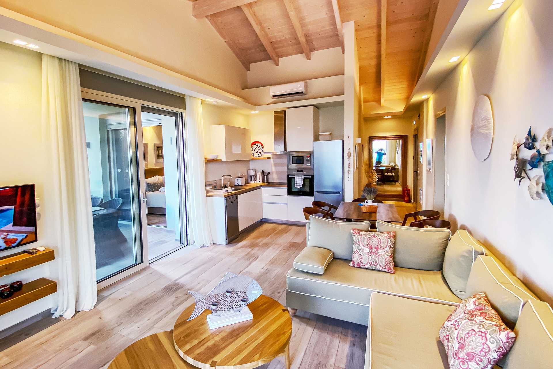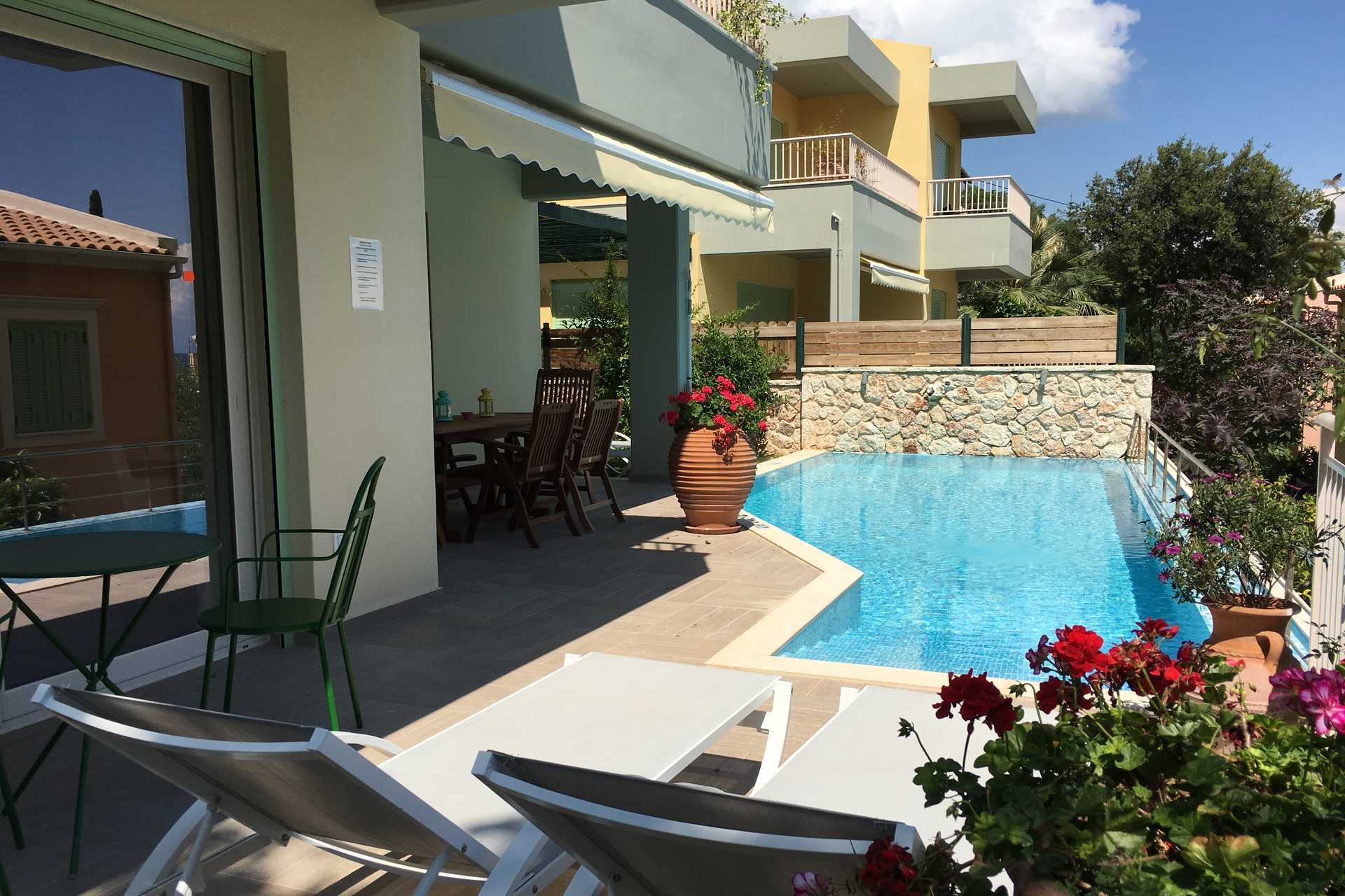 4-værelses lejligheder i etage med terrasse og privat pool. Lejlighederne ligger tæt på stranden. På terrassen er der bord og stole samt solstole. Tre soveværelser, et med en dobbeltseng og to med to enkeltsenge i hver. Alle soveværelser har eget badeværelse med bruser og toilet. Kombineret opholdsrum og minikøkken med kogeplader og ovn, mikroovn, køleskab, kaffemaskine, el-kedel, brødrister, enkelt køkkenudstyr og opvaskemaskine. Gratis wifi, aircondition og deponering. Vaskemaskine. Tv med lokale kanaler. Hårtørrer. Rengøring 2 gange om ugen.