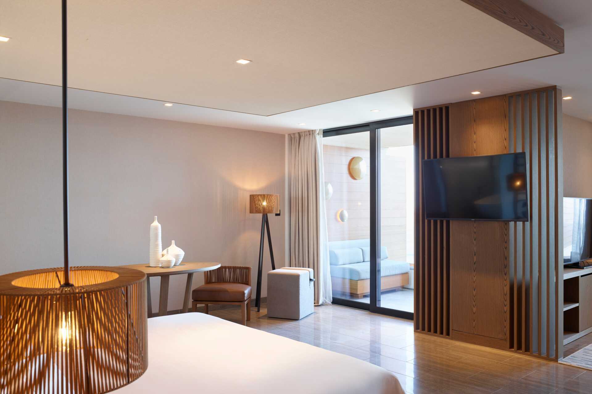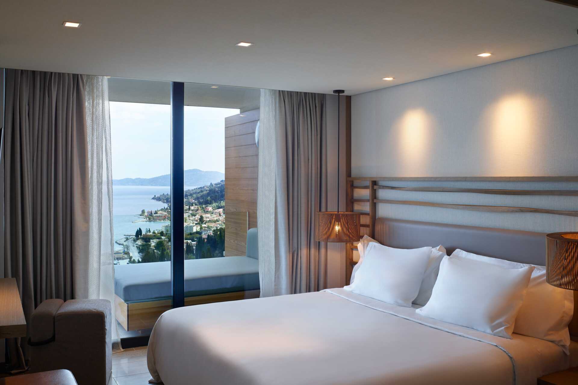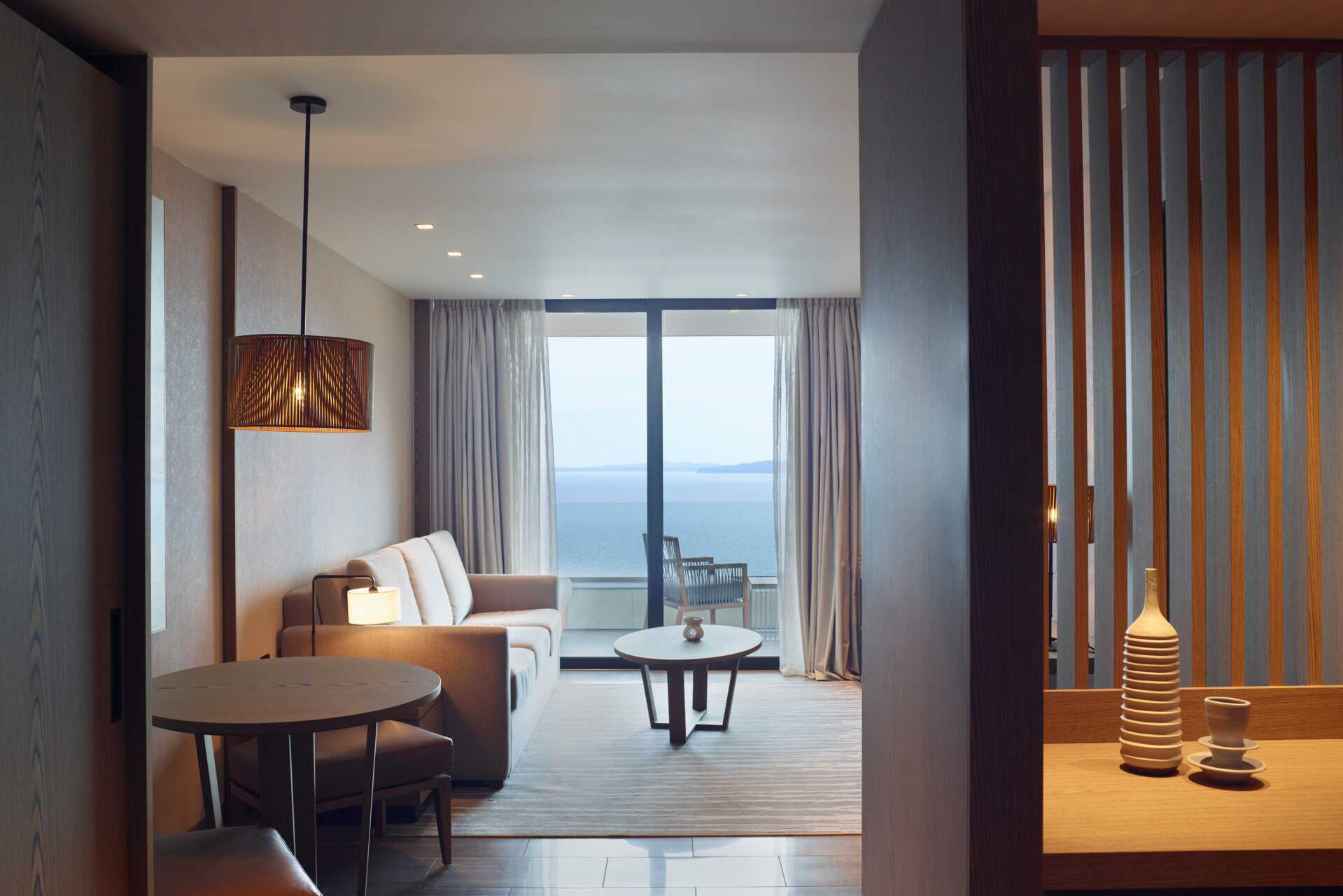 Junior-suite med balkon og havudsigt. En dobbeltseng. Mulighed for ekstra opredning i sovesofa. Gratis wifi, aircondition og deponering. Minibar. Tv med internationale kanaler. Nespresso kaffemaskine - vand og seks kapsler inkluderet pr. dag. Badekåber og tøfler. Badeværelsesartikler. Hårtørrer. Åben planløsning til badekar og to håndvaske. Separat bad og toilet. Rengøring 7 gange om ugen. Børn under to år tæller med i det maksimale antal personer på værelset.