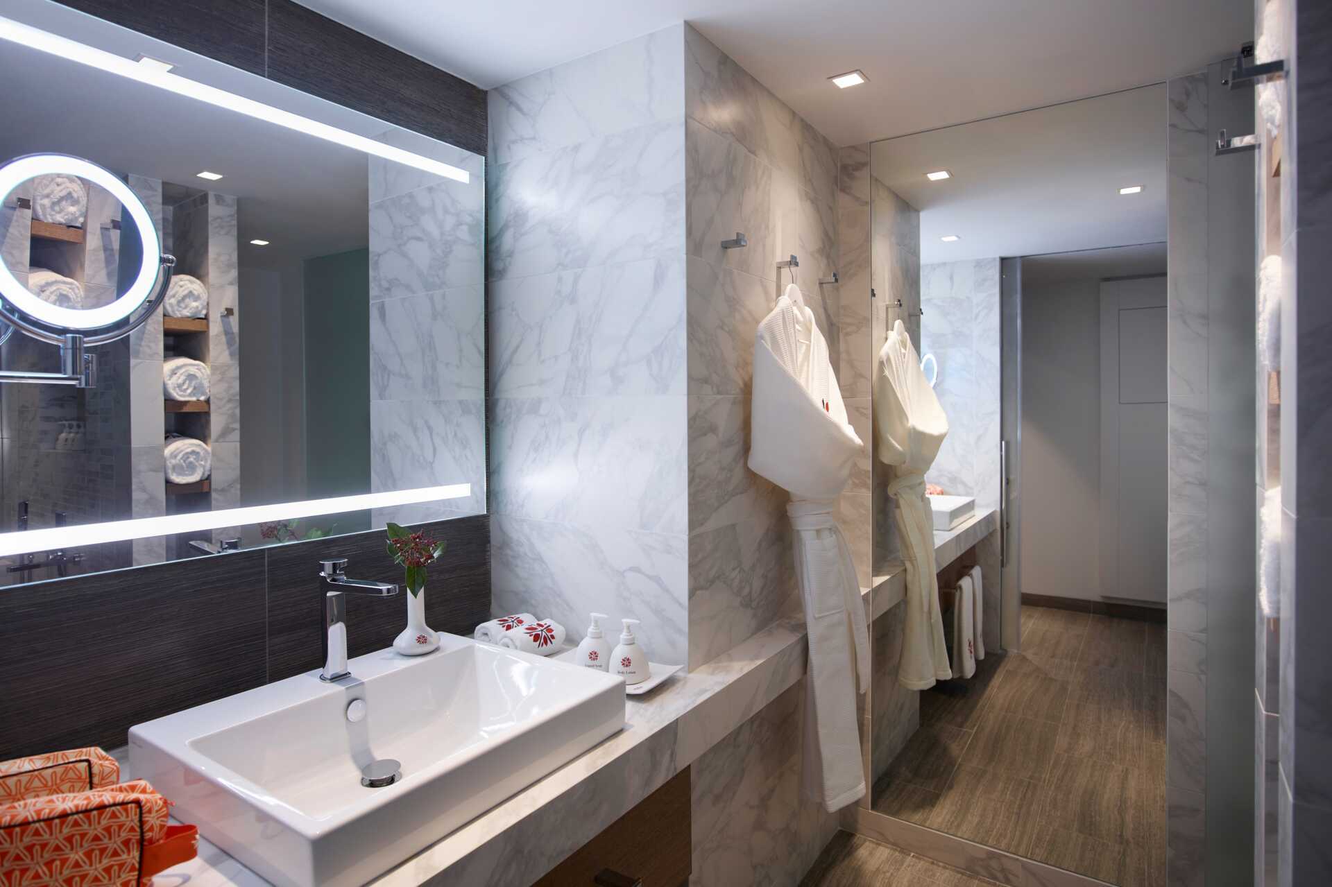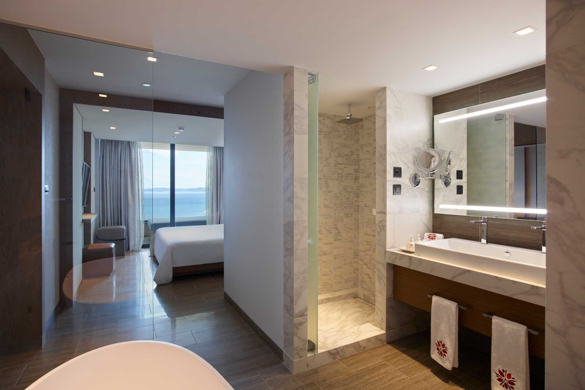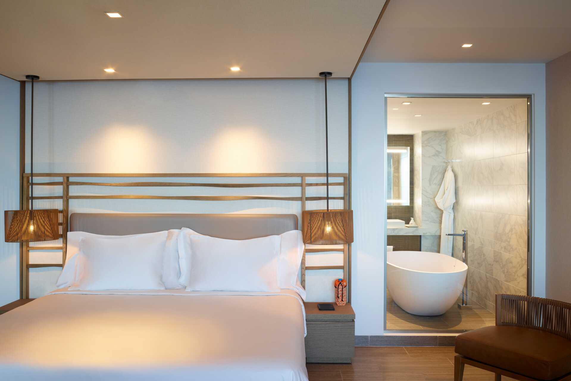 Junior-suite med balkon og havudsigt. En dobbeltseng. Mulighed for ekstra opredning i sovesofa. Gratis wifi, aircondition og deponering. Minibar. Tv med internationale kanaler. Nespresso kaffemaskine - vand og seks kapsler inkluderet pr. dag. Badekåber og tøfler. Badeværelsesartikler. Hårtørrer. Åben planløsning til badekar og to håndvaske. Separat bad og toilet. Rengøring 7 gange om ugen. Børn under to år tæller med i det maksimale antal personer på værelset.