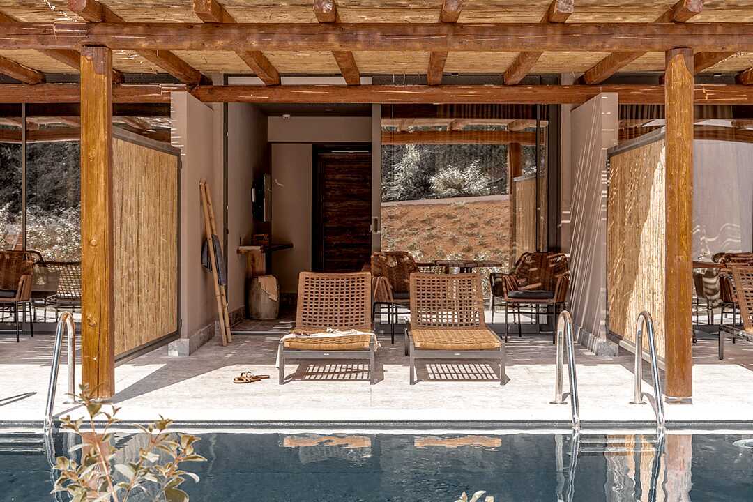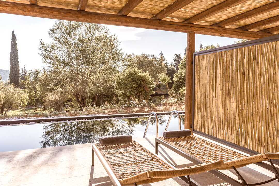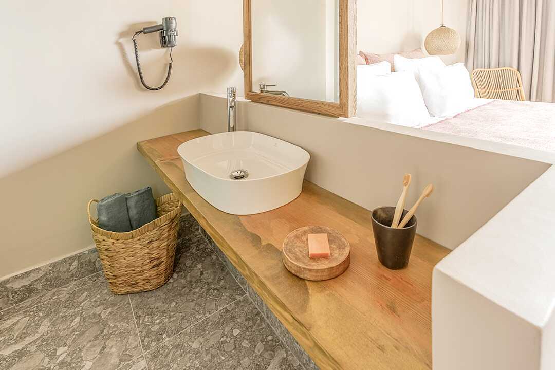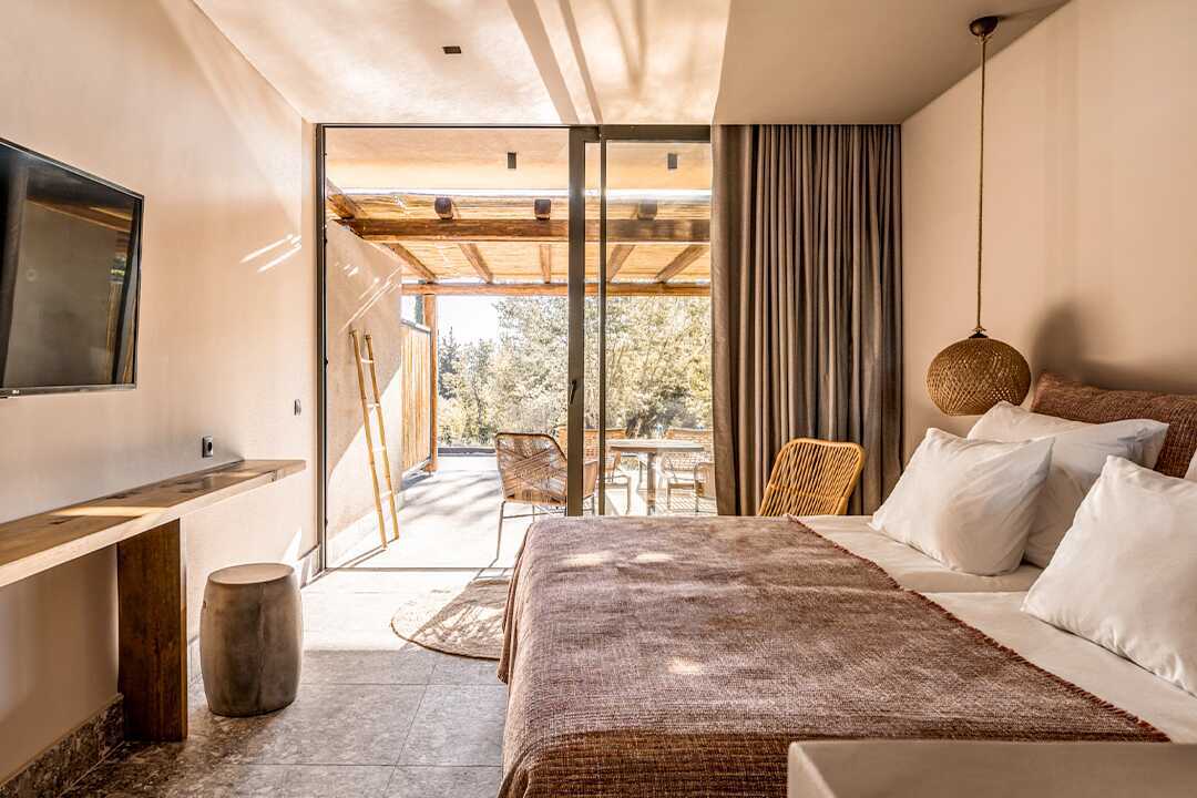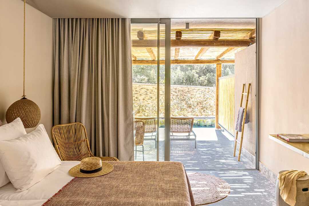 Dobbeltværelse med terrasse og udgang til delt pool. På terrassen er der stole og borde samt to solstole. En dobbeltseng eller to enkeltsenge. Køleskab, en flaske vand er i køleskabet ved ankomst, genopfyldes hver dag. El-kedel og kaffe/te. Gratis wifi, aircondition og deponering. Tv med internationale kanaler. Badekåber og tøfler. Hårtørrer. Åben planløsning til badeværelse, bruser og toilet i matteret glas. Rengøring 7 gange om ugen.