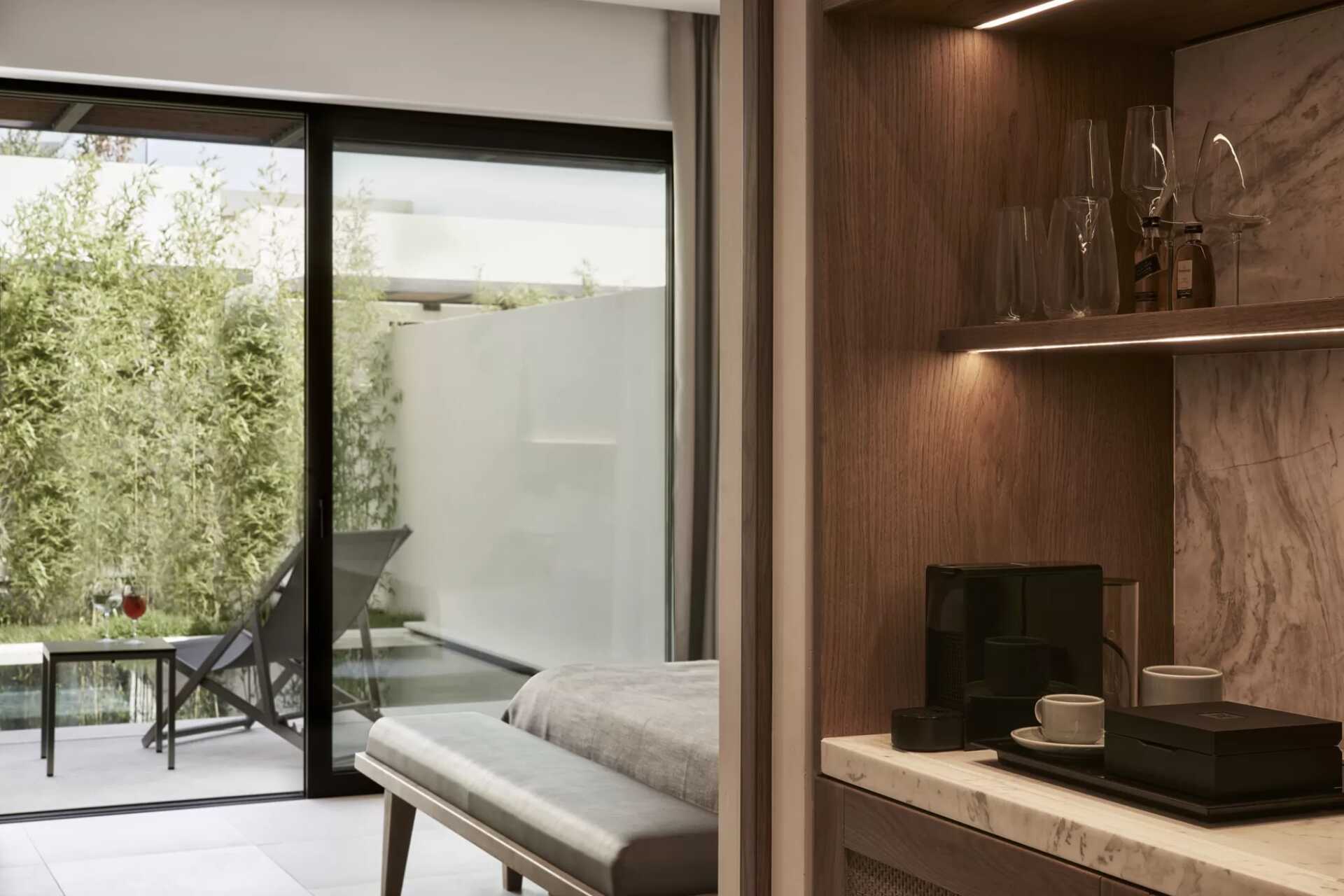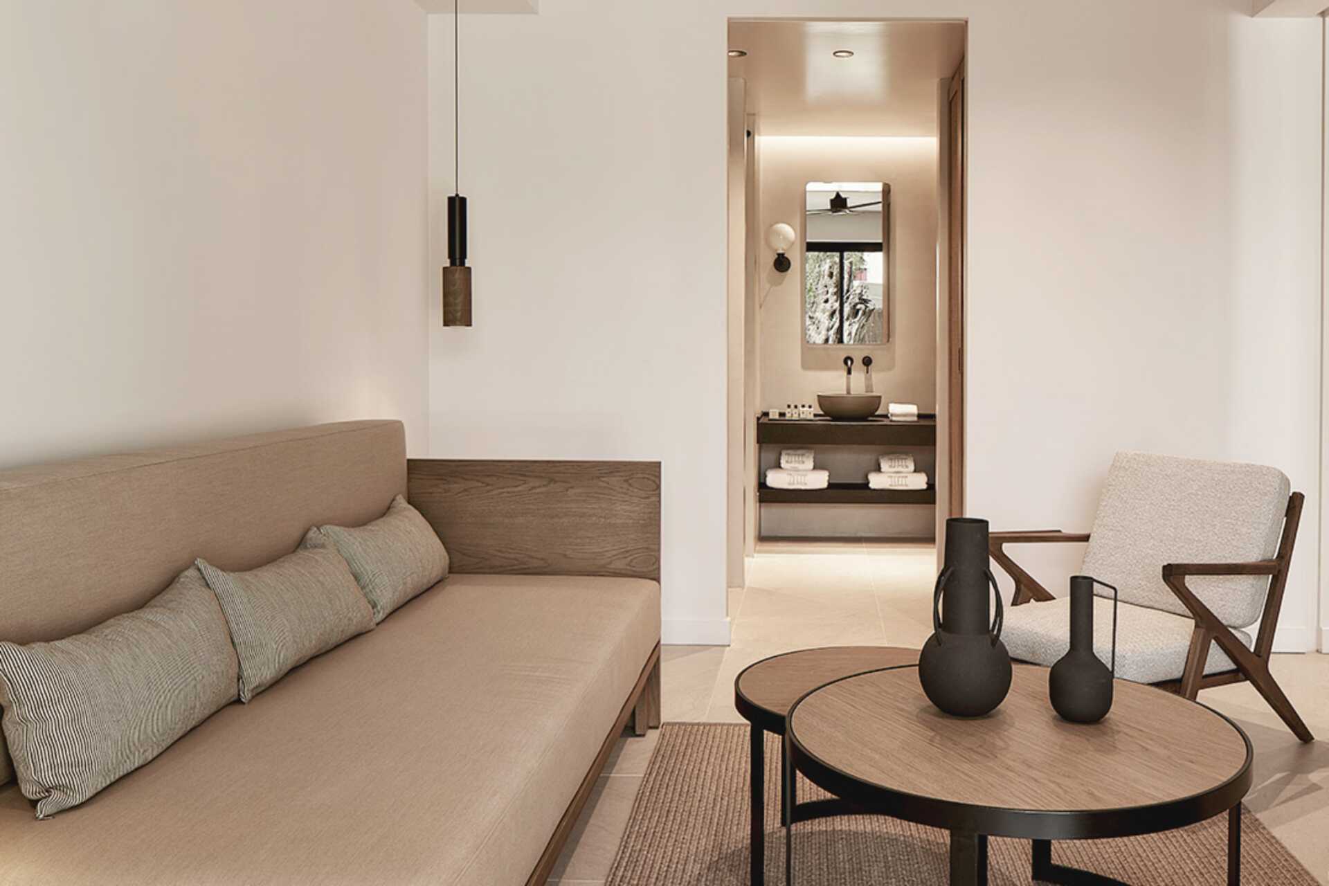 Junior-suite med privat pool Terrasse med to solstole, stole og bord samt udsigt over haven. En dobbeltseng. Gratis wifi, aircondition og deponering. Køleskab. El-kedel og kaffe/te. Nespresso kaffemaskine. Tv med internationale kanaler. Strygejern og strygebræt. Hårtørrer. Glattejern. Badekåber og tøfler. Badeværelse med bruser og toilet. Rengøring 7 gange om ugen.