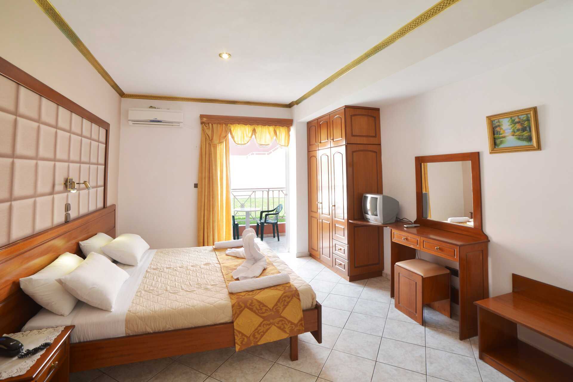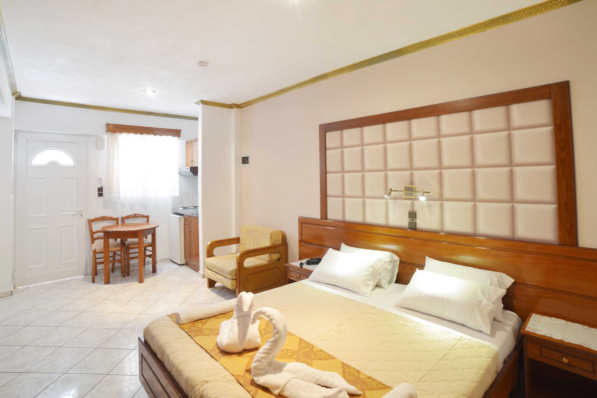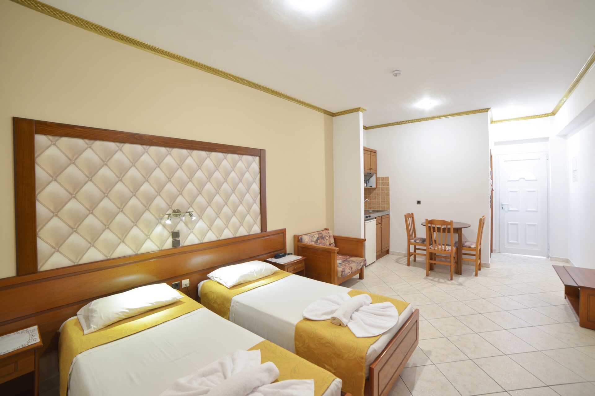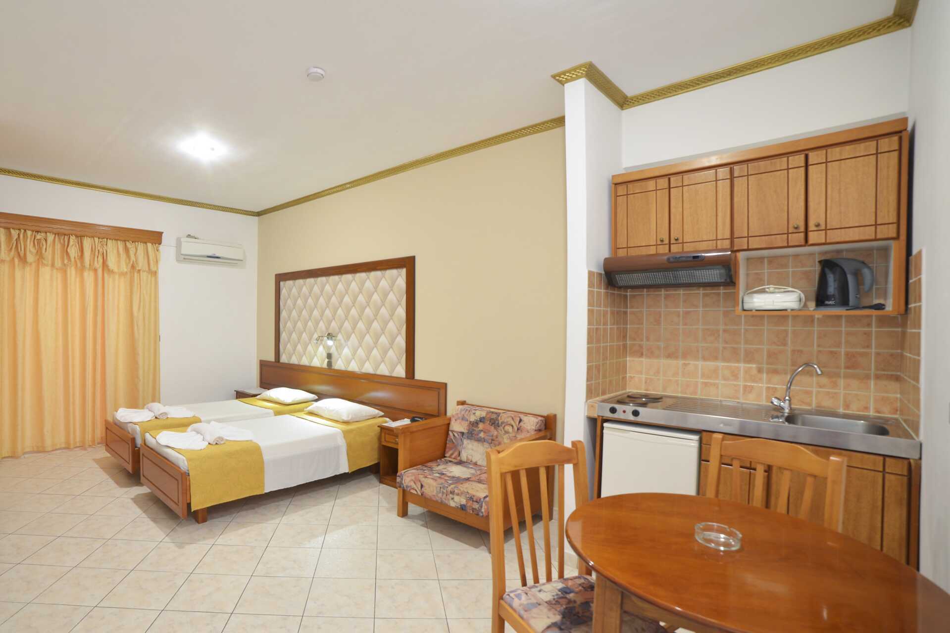 1-værelses lejligheder med balkon. Soveværelse kombineret med minikøkken. En dobbeltseng eller to enkeltsenge. Mulighed for ekstra opredning i fold ud-seng. Minikøkken med kogeplader, køleskab, el-kedel og enkelt køkkenudstyr. Gratis wifi, aircondition og deponering. Tv med internationale kanaler. Badeværelse med bruser og toilet. Rengøring 7 gange om ugen.