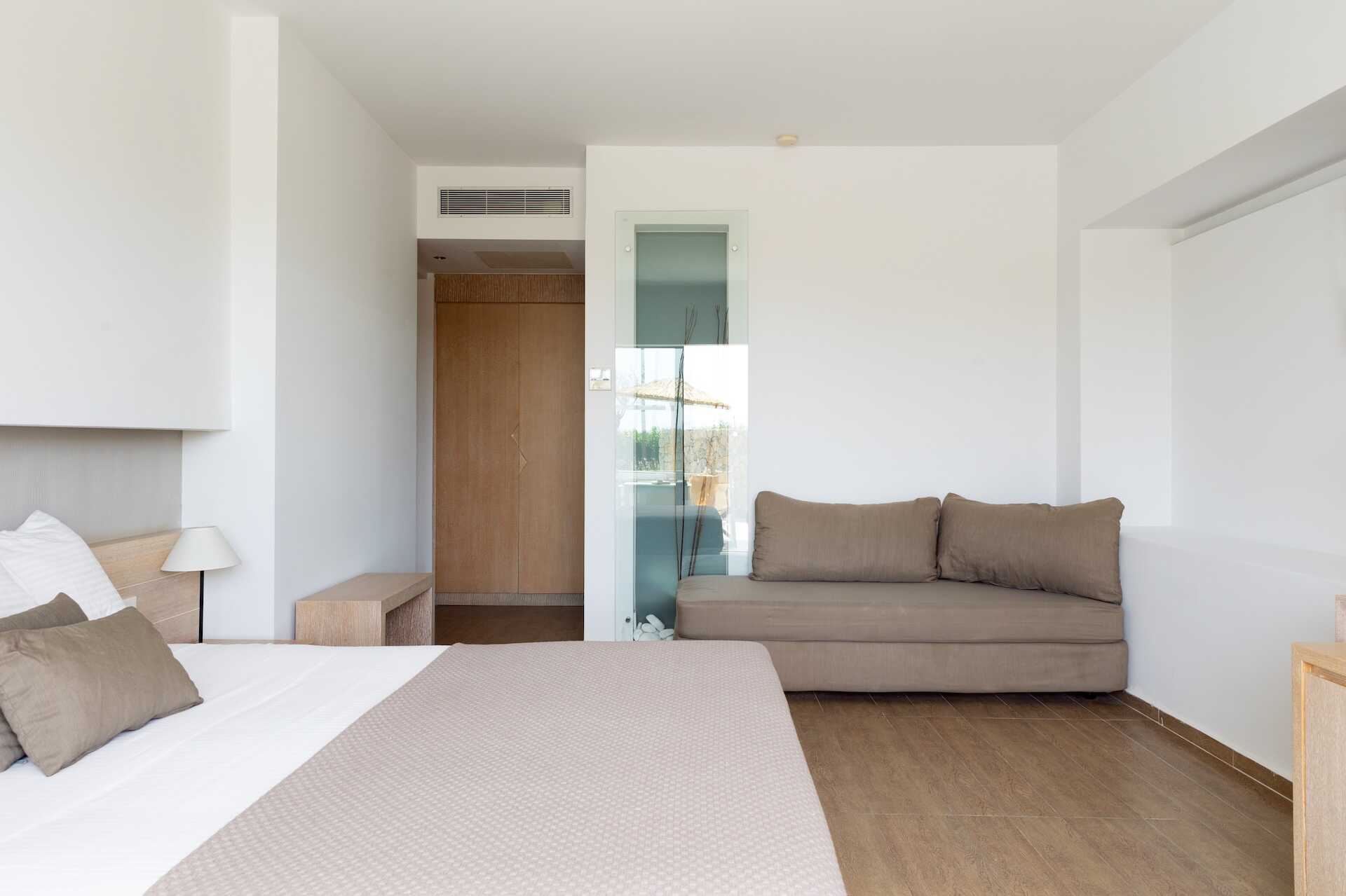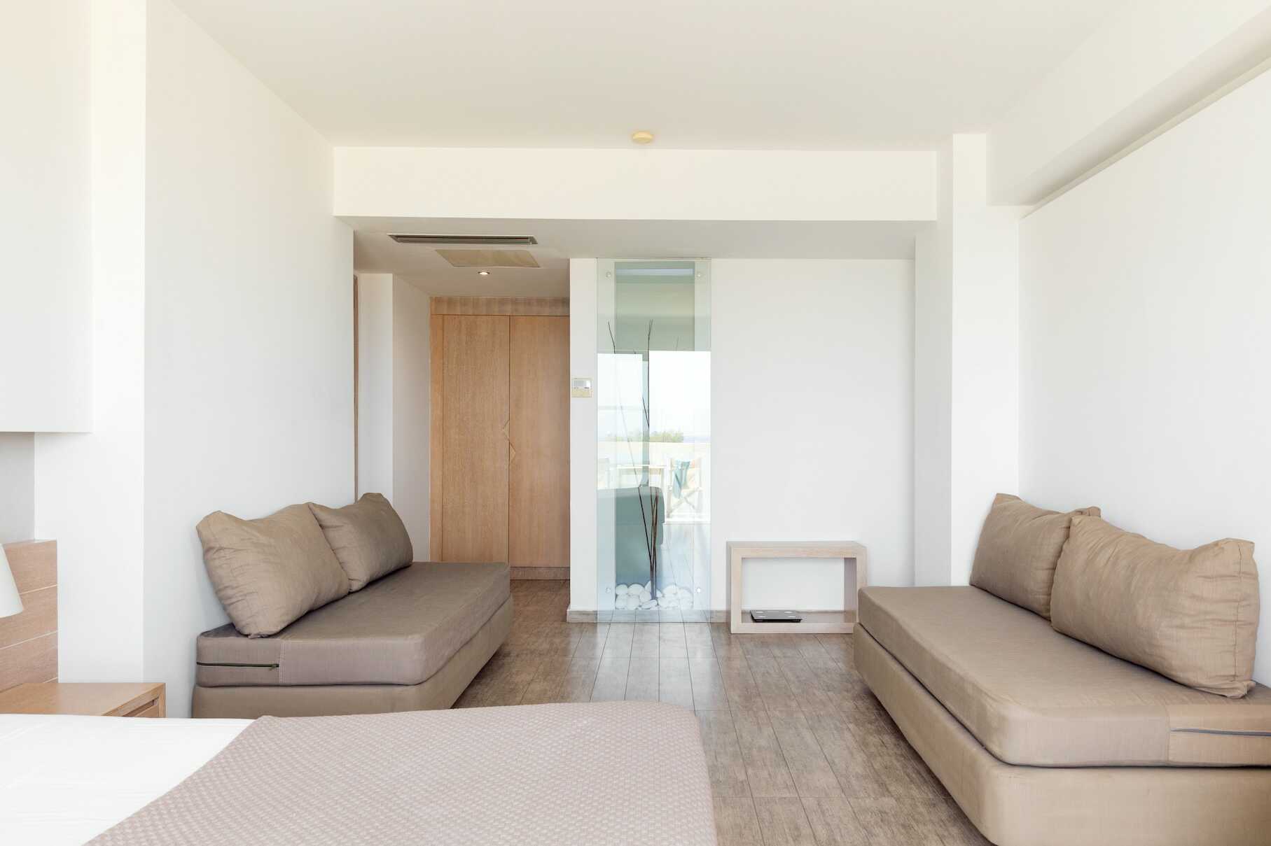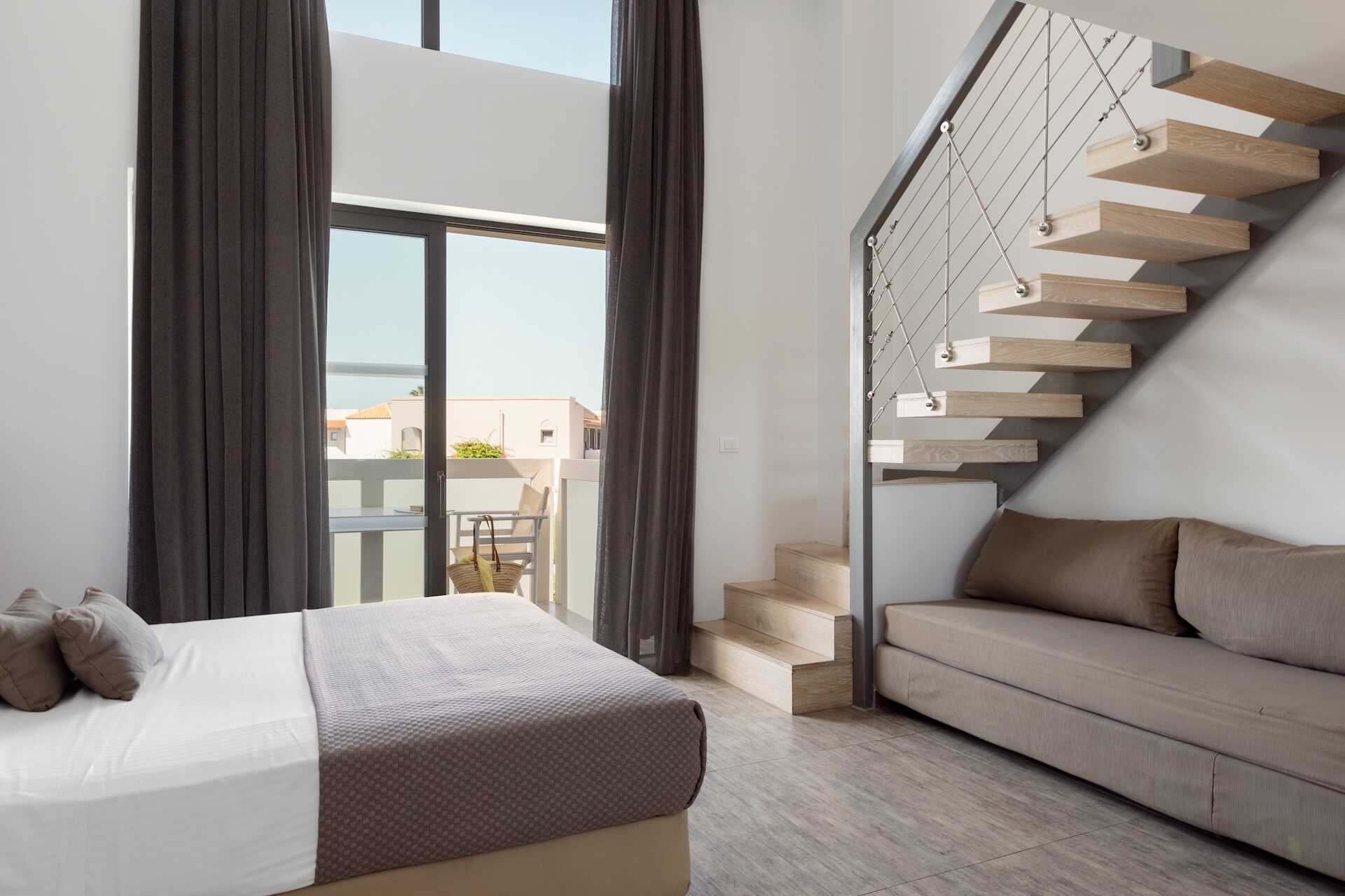 Familie-værelse i etage med balkon eller terrasse, nogle med havudsigt. I stueplan er der en dobbeltseng og mulighed for ekstra opredning i sovesofa, samt badeværelse med hårtørrer, badekar eller bruser samt toilet. På øvre plan er der soveværelse med dobbeltseng eller to enkeltsenge og badeværelse med hårtørrer, bruser og toilet. Der er en dør mellem etagerne. Gratis wifi, aircondition og deponering. Minibar indgår - genopfyldes hver dag med vand, vin, juice, øl og sodavand. El-kedel samt kaffe/te. Tv med internationale kanaler. Rengøring 7 gange om ugen. Børn under to år tæller med i det maksimale antal personer på værelset.