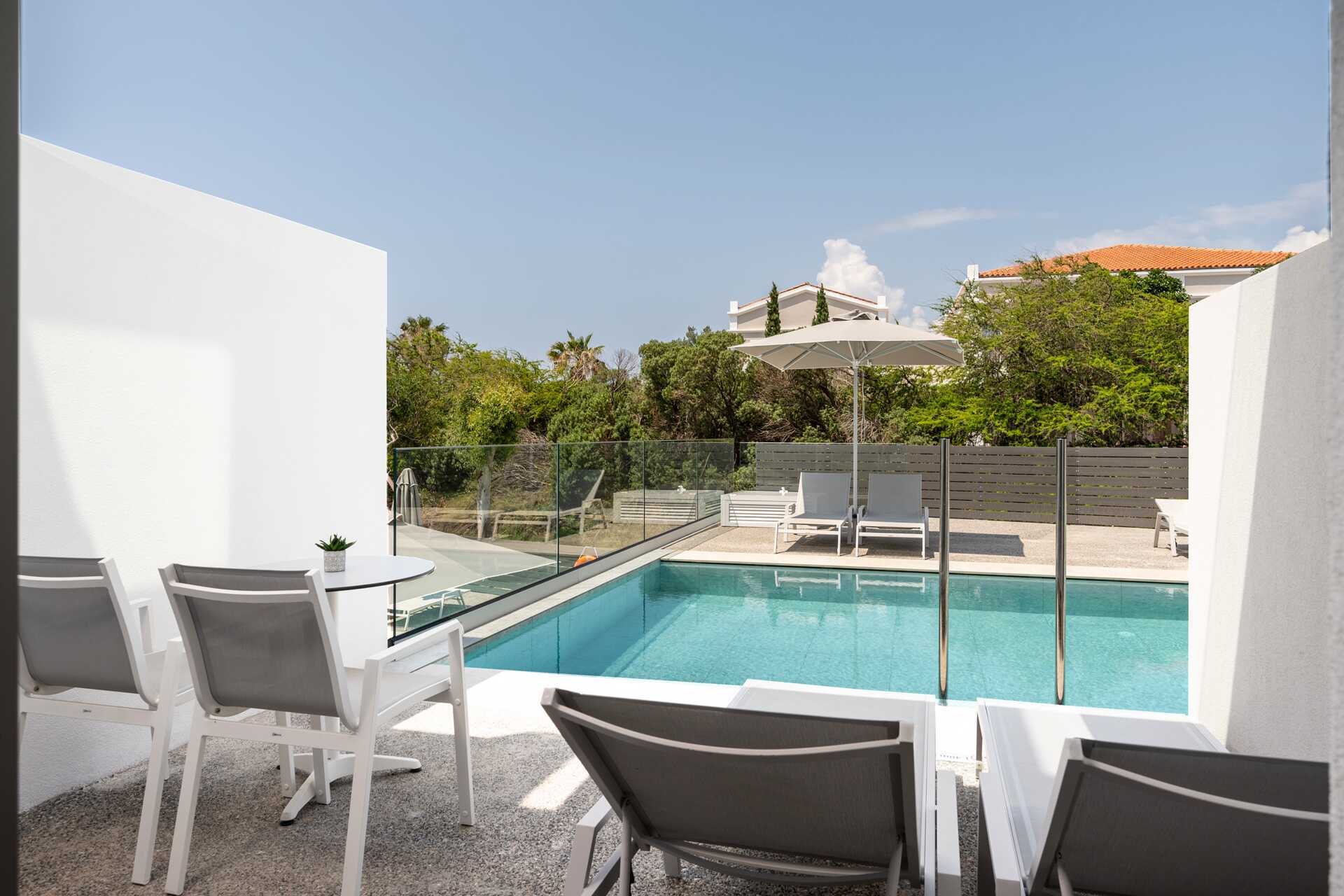 Hotellet har en saltvandspool og en separat børnepool. Solstole og parasoller kan lånes både ved poolområdet og på hotellets private del af stranden. Pool- og strandhåndklæder er inkluderet og kan skiftes tre gange om ugen. Der er også 9 saltvandspools, der hører til værelserne med delt pool. Afstanden til stranden varierer fra 50 til 300 meter afhængigt af hvor på hotellet du bor. Der er en tunnel mellem hotellet og stranden.