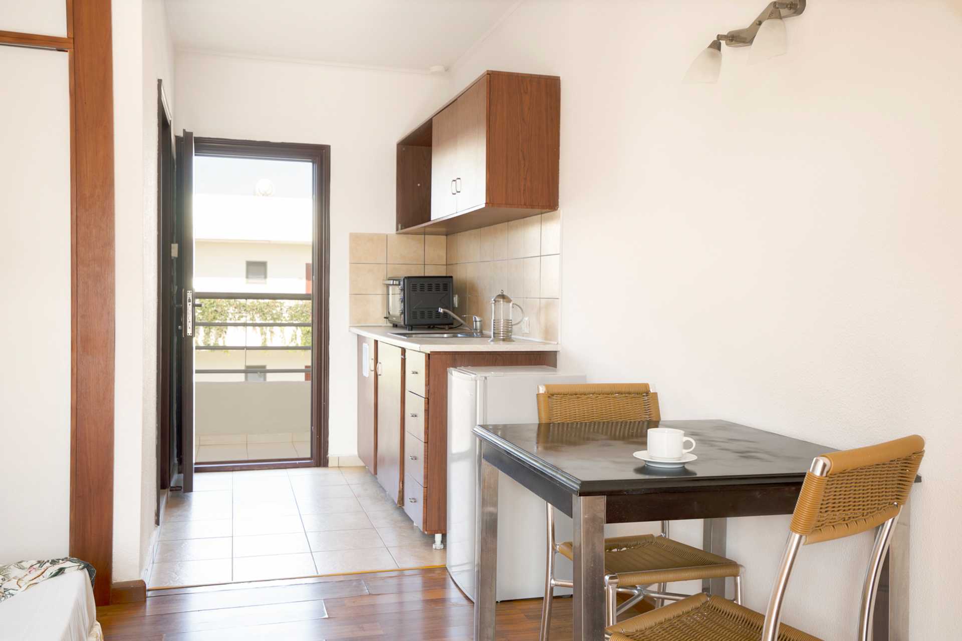 1-værelses lejlighed med balkon eller balkon i stueplan. Kombineret soveværelse og minikøkken. En dobbeltseng eller to enkeltsenge. Mulighed for ekstra opredning i fold ud-seng. Minikøkken med kogeplader, køleskab, mikroovn, el-kedel, kaffemaskine og enkelt køkkenudstyr. Gratis wifi. Aircondition og deponering mod betaling. Tv med internationale kanaler. Hårtørrer. Badeværelse med bruser og toilet. Rengøring 6 gange om ugen.