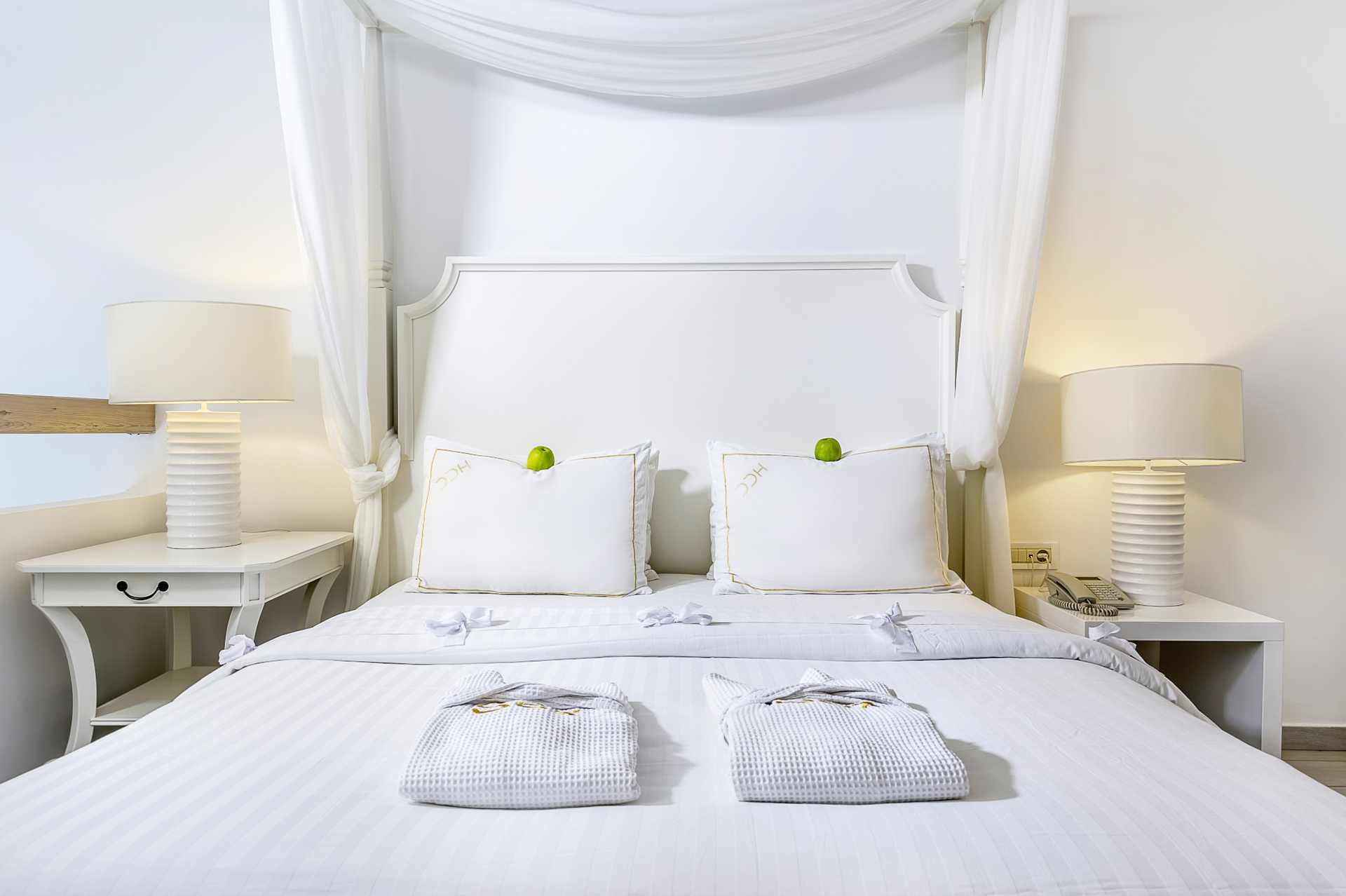 Deluxe-værelse med balkon eller terrasse eller med terrasse med pooludsigt. En dobbeltseng eller en rund dobbeltseng. Gratis wifi, aircondition og deponering. Minibar. El-kedel og kaffe/te. Vand, vin og frugt er på værelset ved ankomst. Tv med internationale kanaler. Badekåber og tøfler. Hårtørrer. Badeværelse med bruser og toilet. Rengøring 7 gange om ugen.