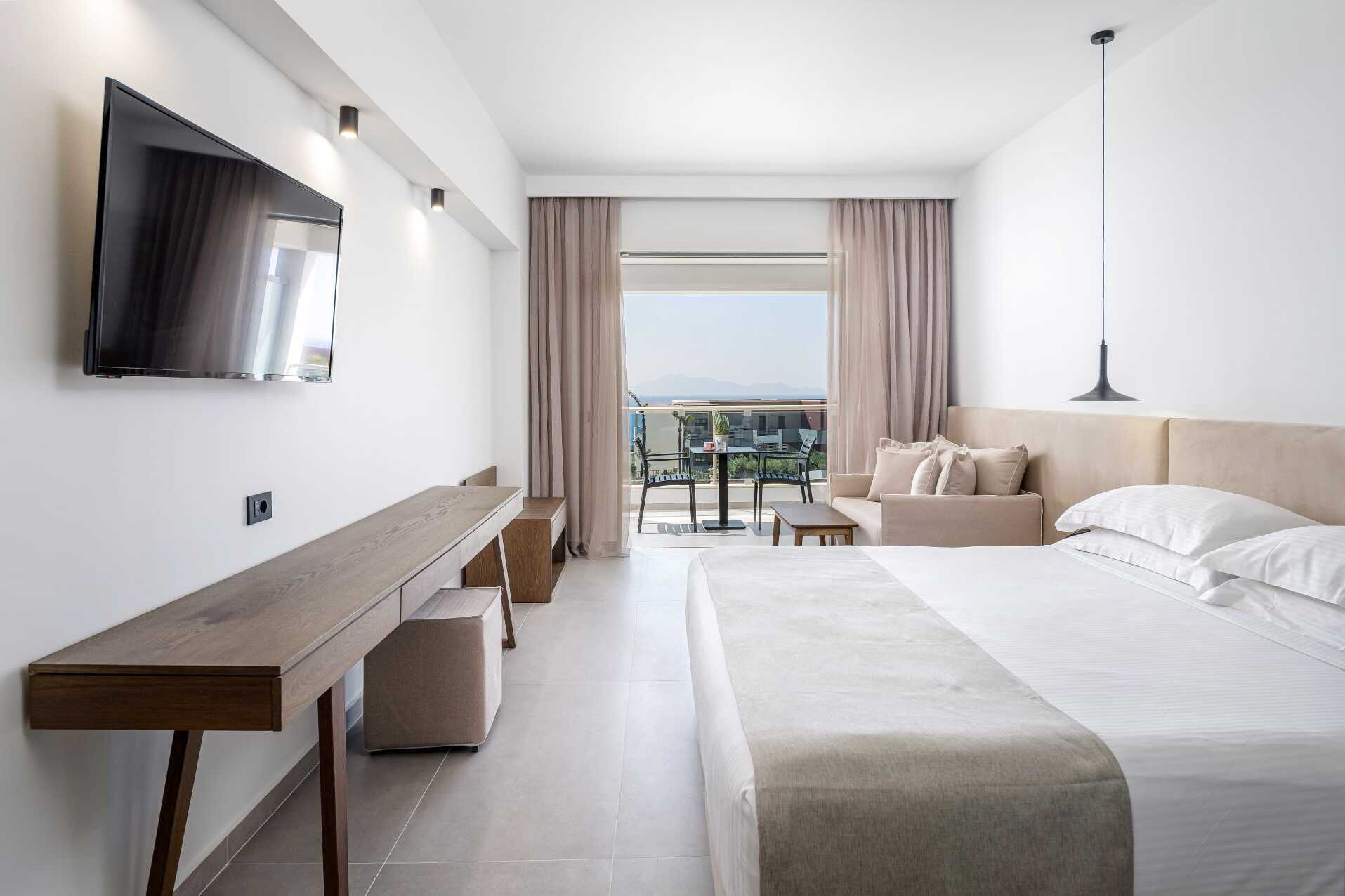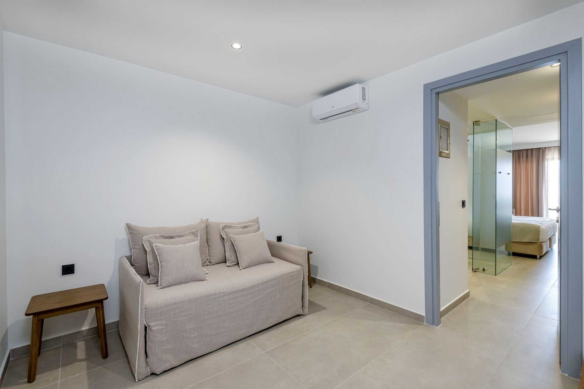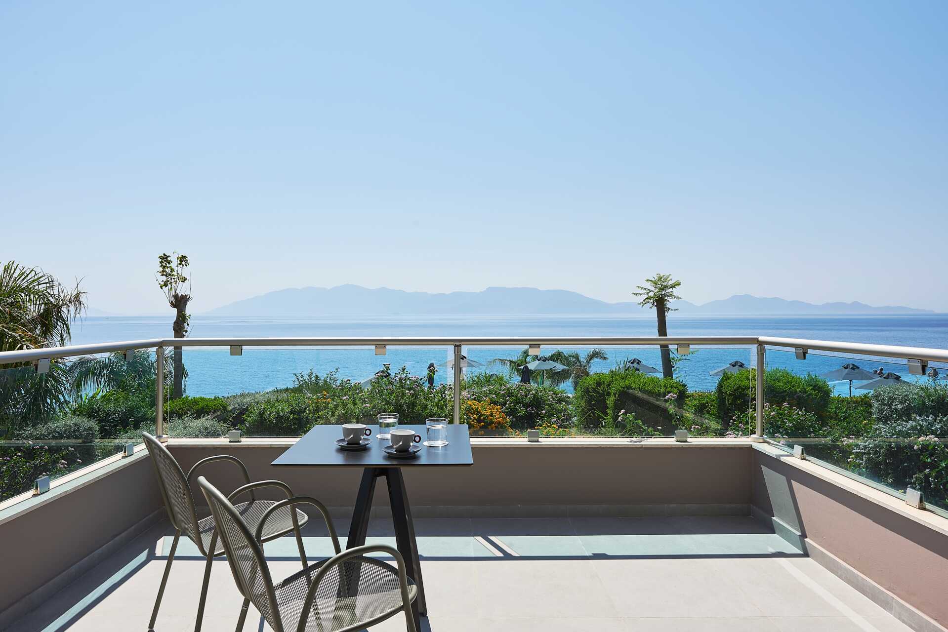 Junior-suiter med terrasse eller balkon, nogle med havudsigt og nogle med udsigt mod havet. Junior-suiterne med udsigt ligger på første parket mod havet og infinity-poolen. En dobbeltseng eller to enkeltsenge. Mulighed for ekstra opredninger i sovesofa. Gratis wifi, aircondition og deponering. Køleskab. El-kedel og kaffe/te. Espresso kaffemaskine. Tv med internationale kanaler. Badekåber og tøfler. Hårtørrer. Badeværelse med bruser og toilet. Rengøring 7 gange om ugen. Børn under to år tæller med i det maksimale antal personer på værelset.