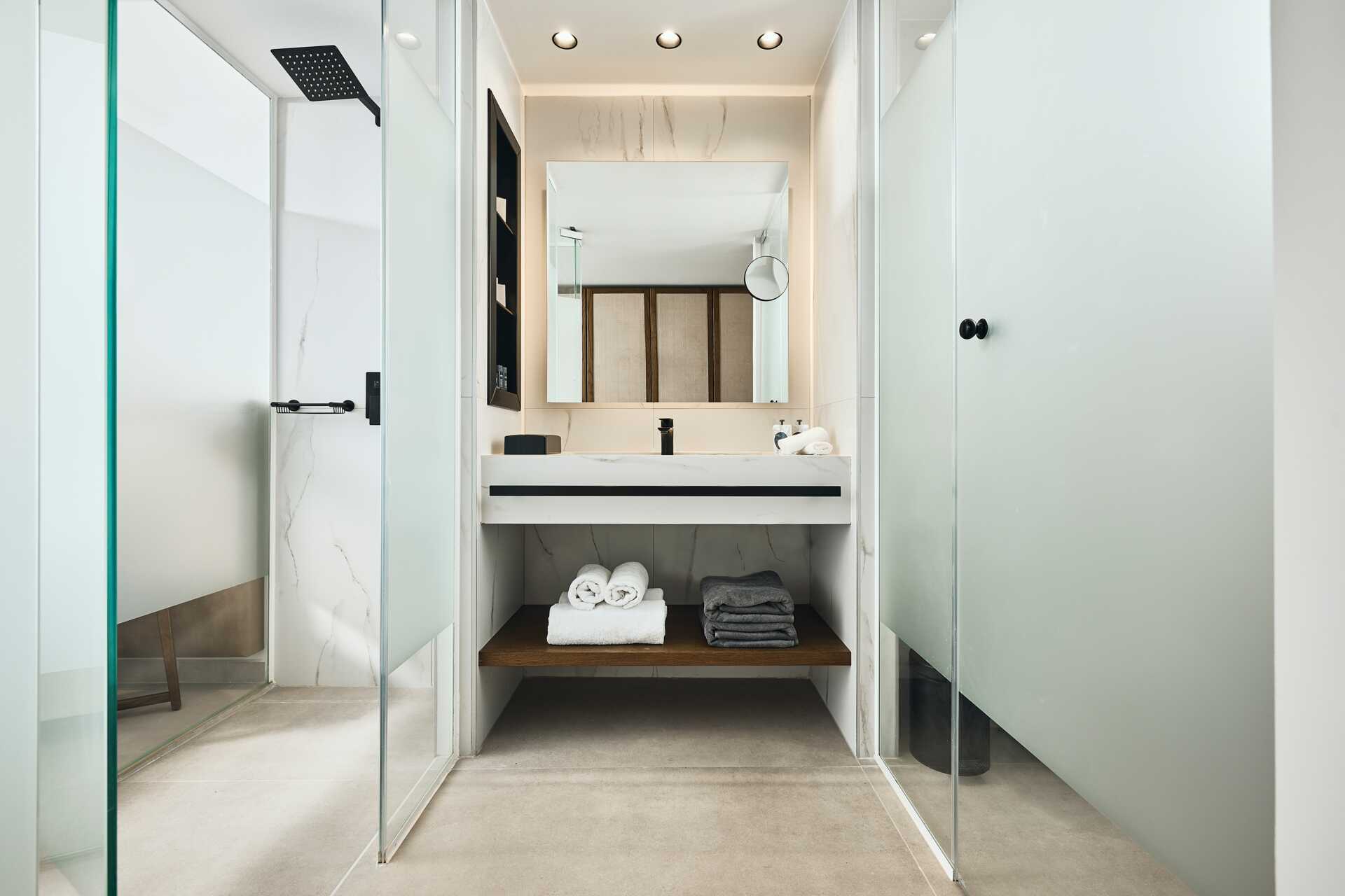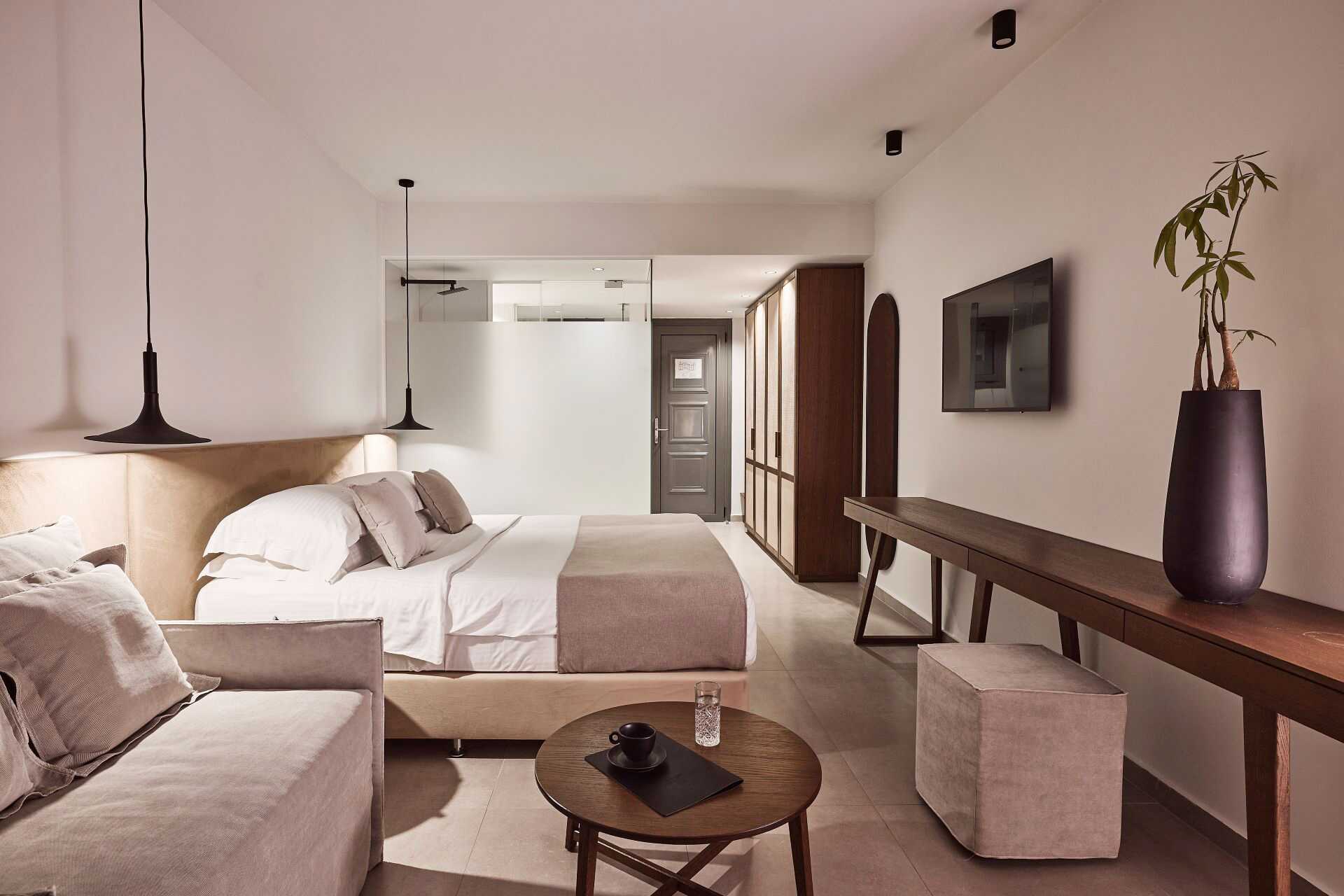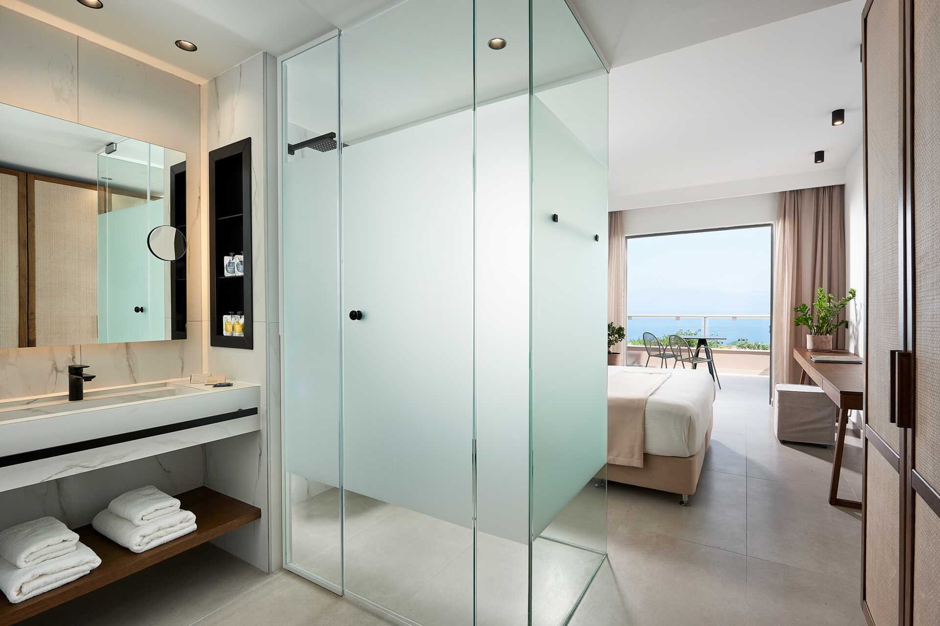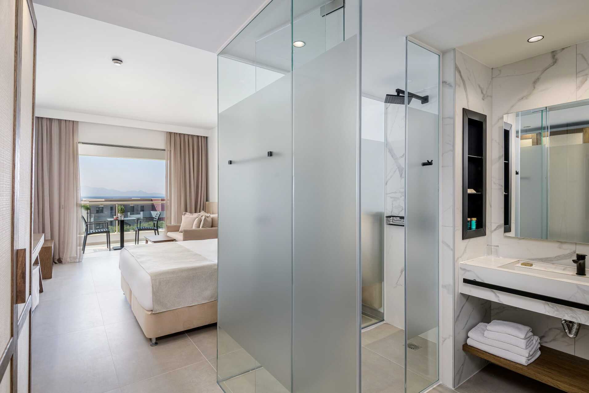 Junior-suiter med terrasse eller balkon, nogle med havudsigt og nogle med udsigt mod havet. Junior-suiterne med udsigt ligger på første parket mod havet og infinity-poolen. En dobbeltseng eller to enkeltsenge. Mulighed for ekstra opredninger i sovesofa. Gratis wifi, aircondition og deponering. Køleskab. El-kedel og kaffe/te. Espresso kaffemaskine. Tv med internationale kanaler. Badekåber og tøfler. Hårtørrer. Badeværelse med bruser og toilet. Rengøring 7 gange om ugen. Børn under to år tæller med i det maksimale antal personer på værelset.