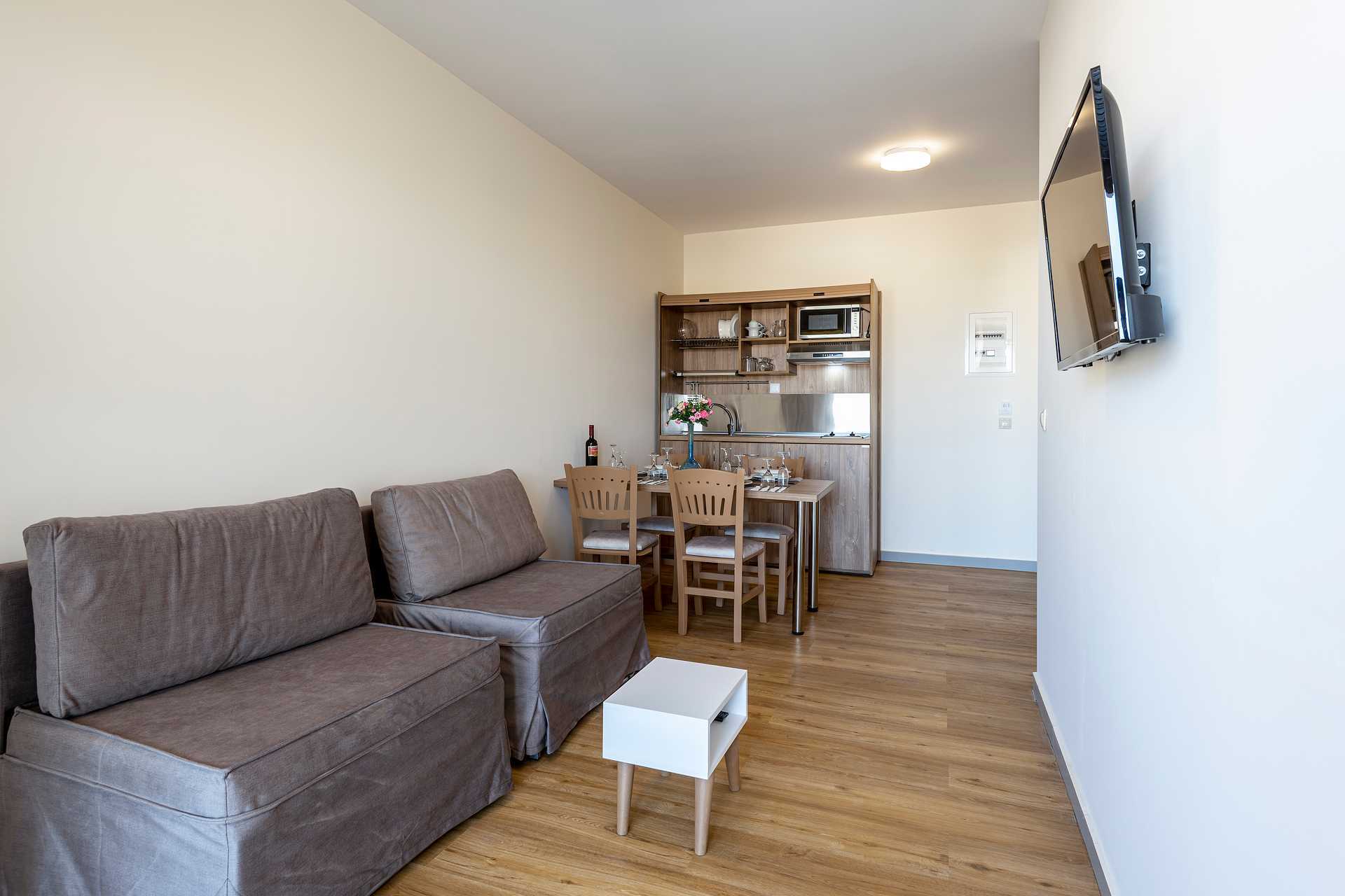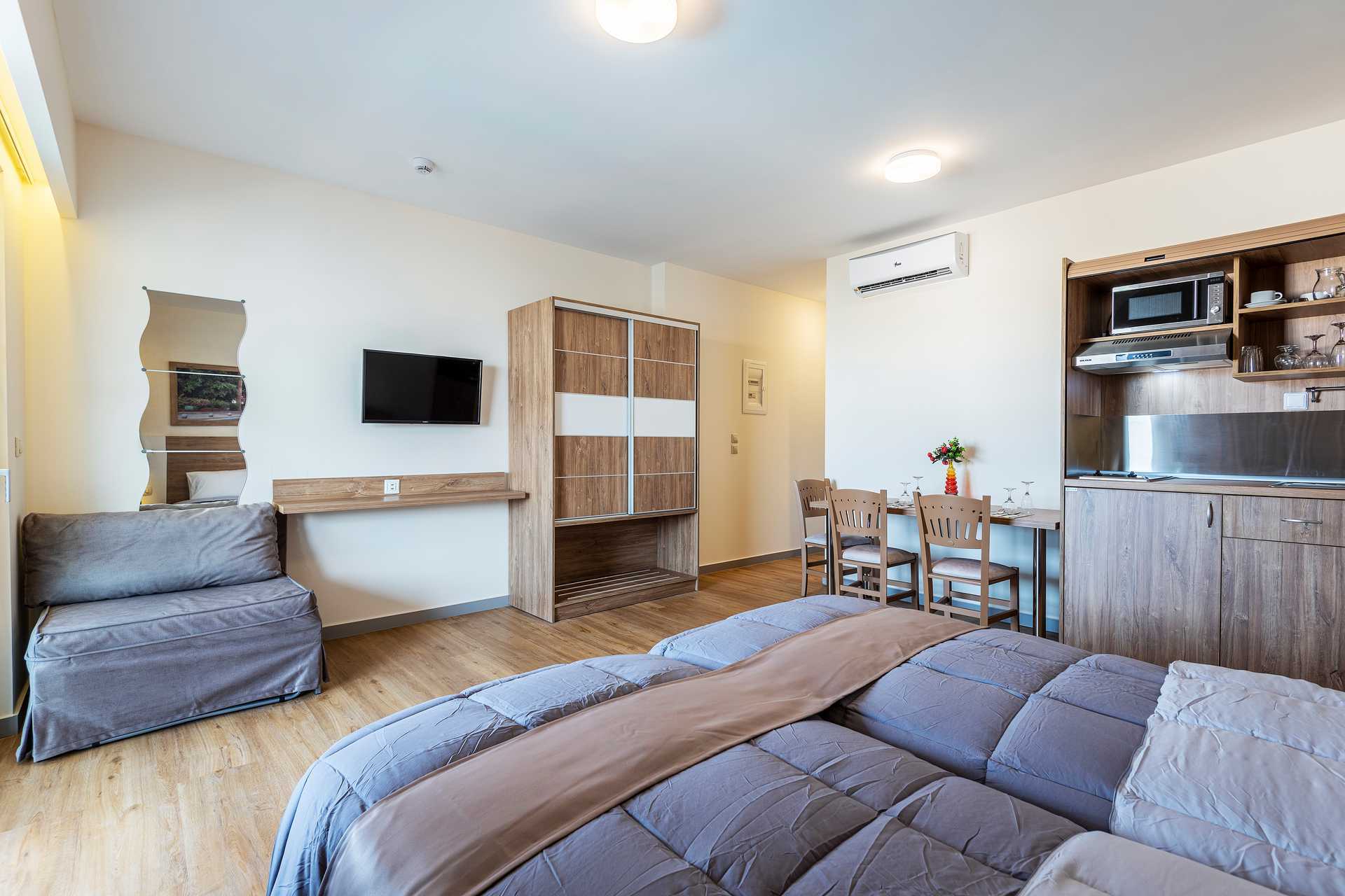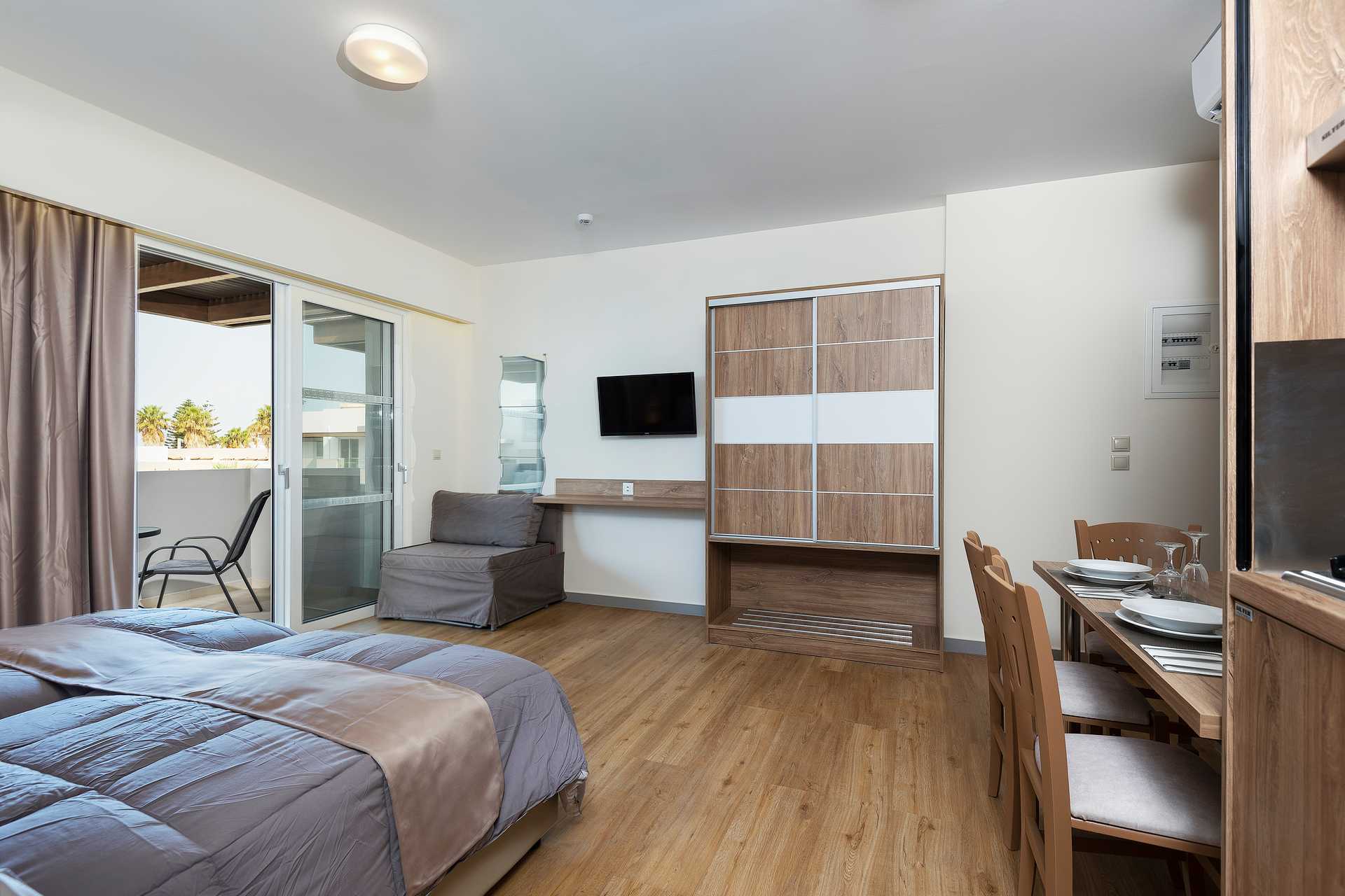 1-værelses lejlighed med balkon, nogle med udsigt over poolen. Kombineret soveværelse og minikøkken. En dobbeltseng eller to enkeltsenge. Mulighed for ekstra opredning i lænestol. Minikøkken med køleskab, kogeplader, mikrobølgeovn, kaffemaskine og enkelt køkkenudstyr. Gratis wifi, aircondition og deponering. Hårtørrer. Badeværelse med bruser og toilet. Rengøring 6 gange om ugen.