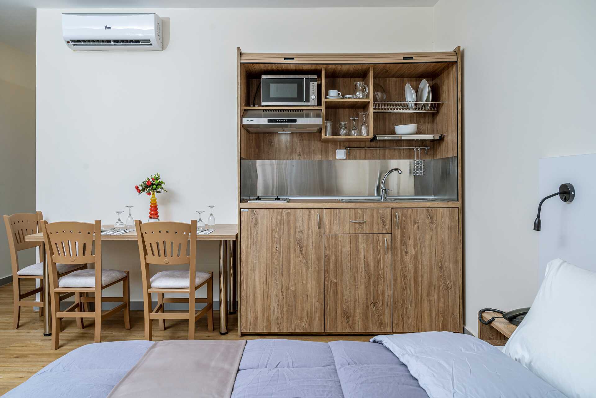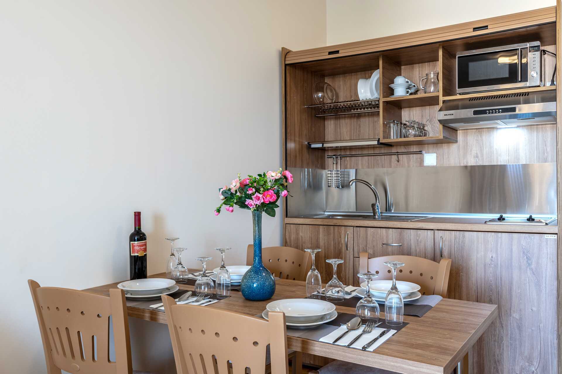 1-værelses lejlighed med balkon, nogle med udsigt over poolen. Kombineret soveværelse og minikøkken. En dobbeltseng eller to enkeltsenge. Mulighed for ekstra opredning i fold ud-stol. Minikøkken med køleskab, kogeplader, mikrobølgeovn, kaffemaskine og enkelt køkkenudstyr. Gratis wifi, aircondition og deponering. Hårtørrer. Badeværelse med bruser og toilet. Rengøring 6 gange om ugen.